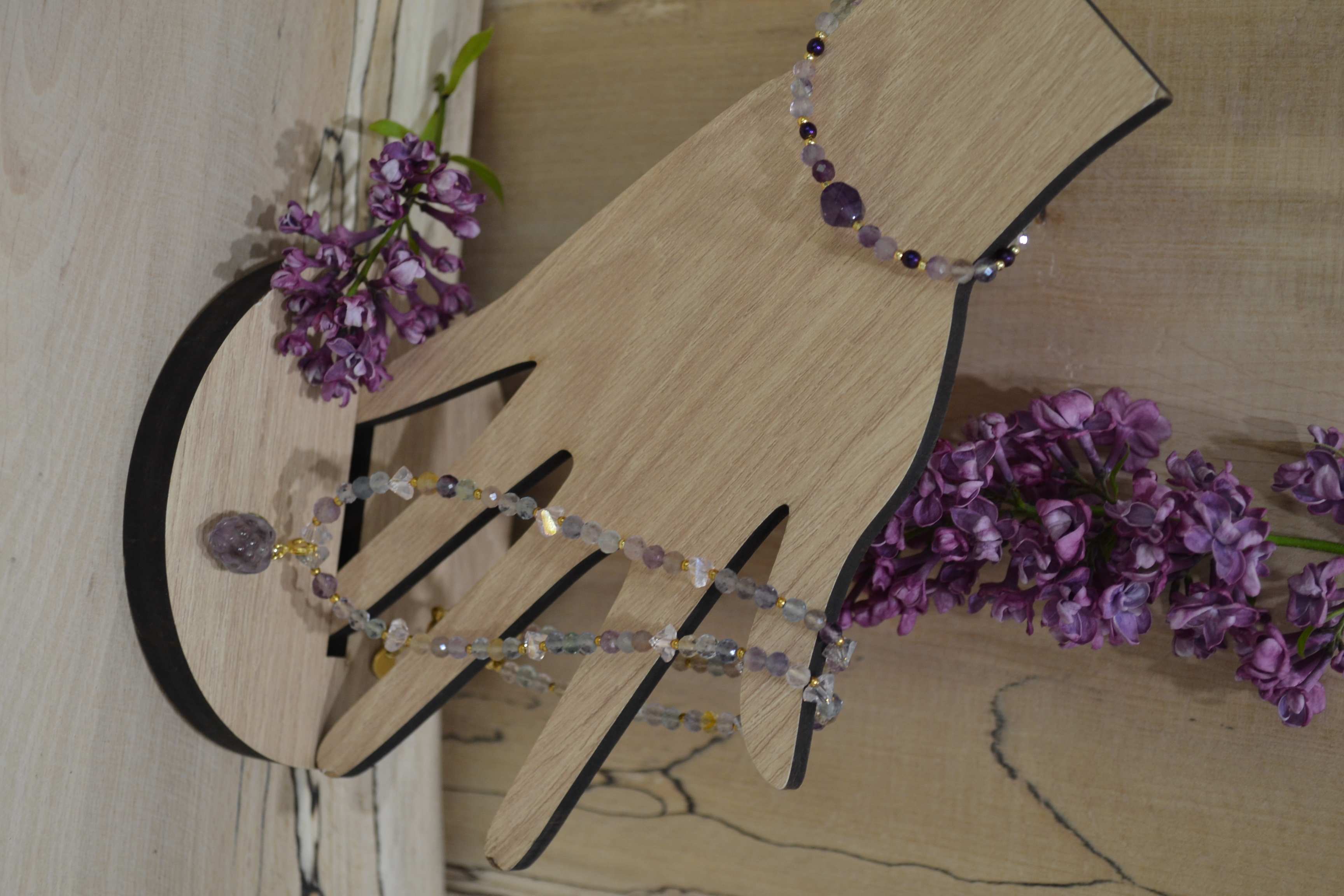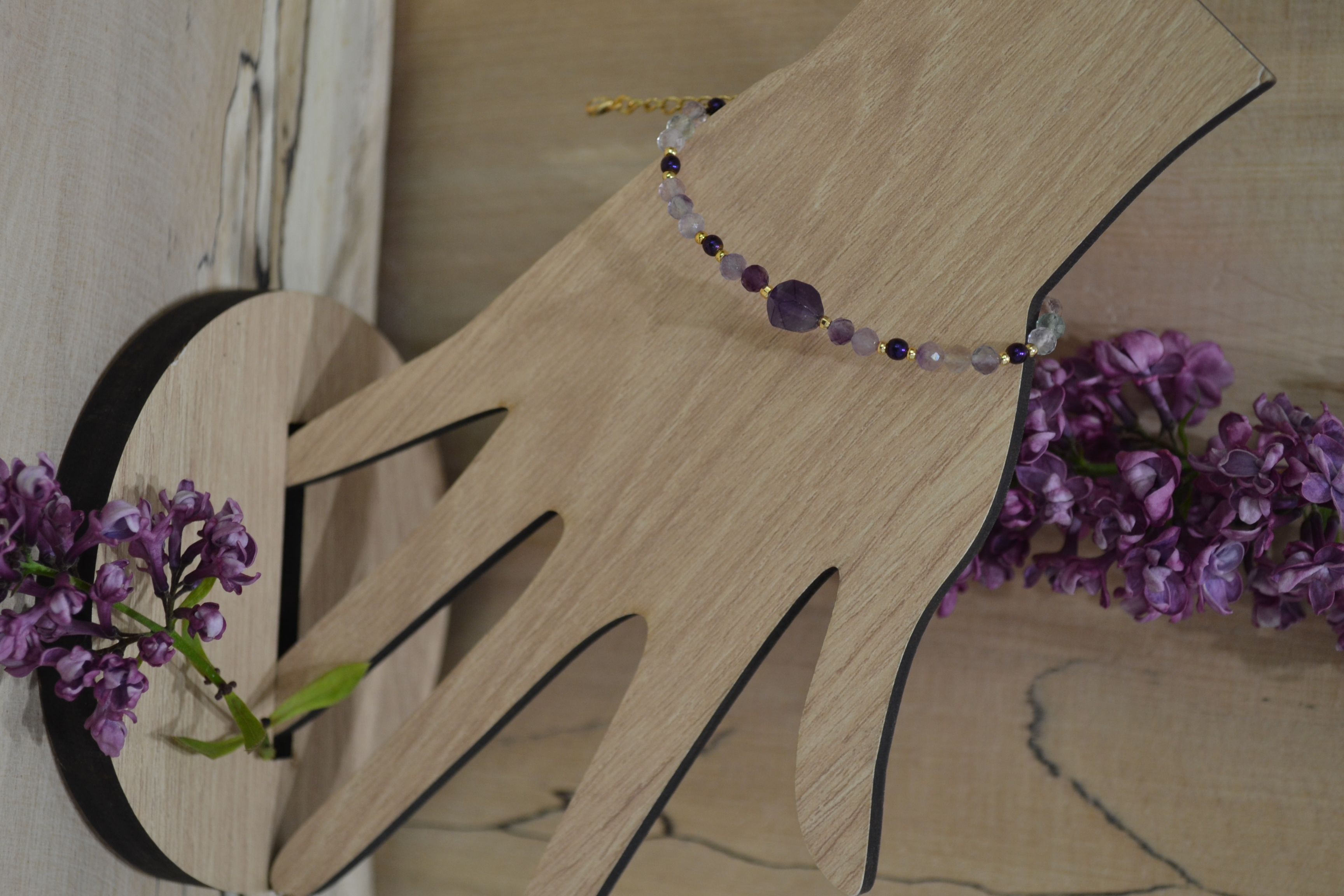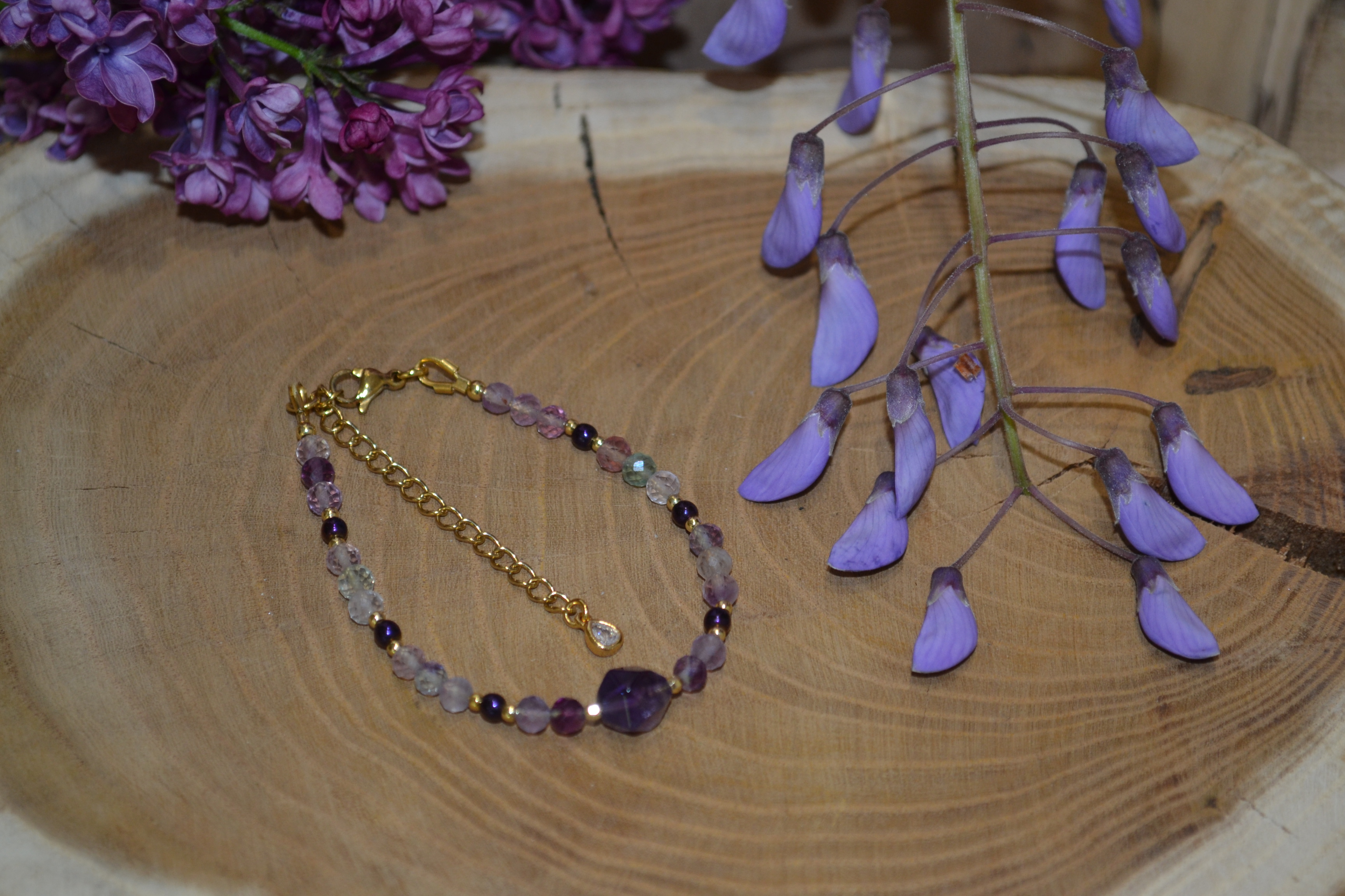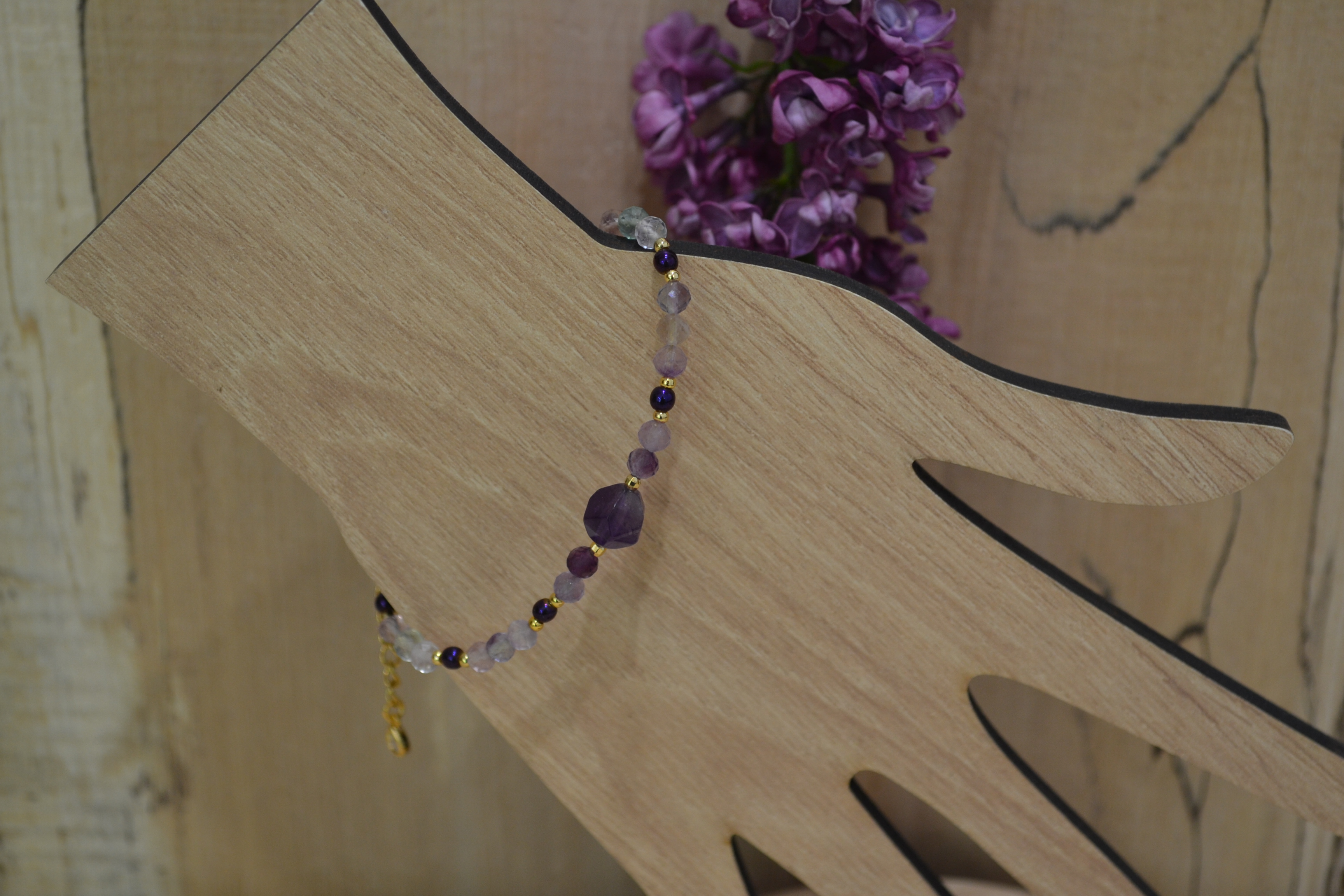Ta piękna bransoletka zrobiona przez nas z kamienia AMETYST I FLUORYT zakuta na drucie jubilerskim ze stali chirurgicznej. Dodatki oraz zapięcie w złotym kolorze wykonaliśmy zestali chirurgicznej. W centrum bransoletki umieściliśmy kamień AMETYSTU