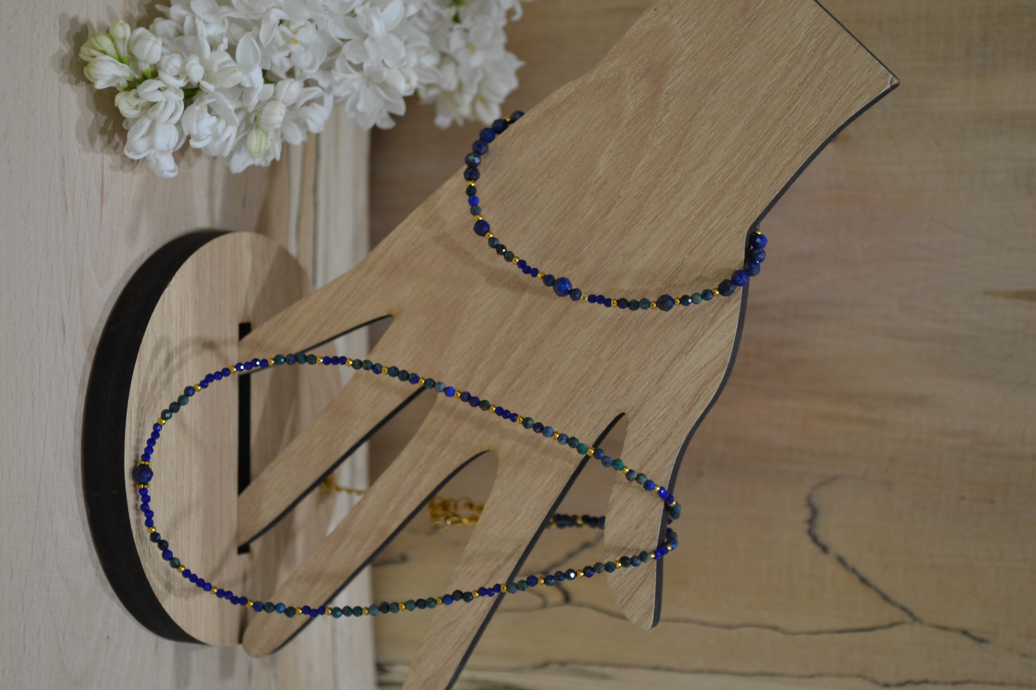 Ta piękna bransoletka zrobiona przez nas z kamienia AZURYT I LAPIS LASULI zakuta na drucie jubilerskim ze stali chirurgicznej. Dodatki oraz zapięcie w złotym kolorze wykonaliśmy zestali chirurgicznej.