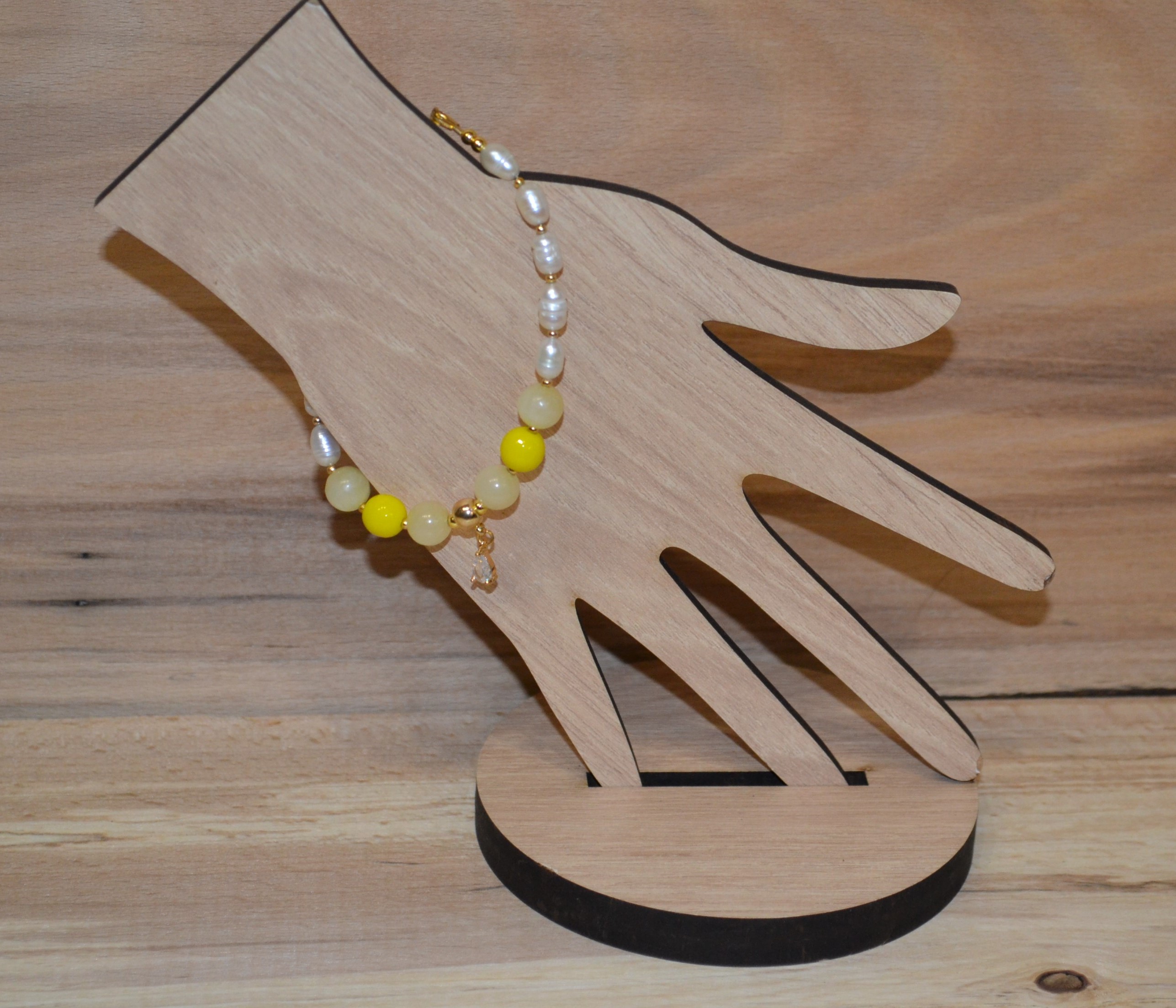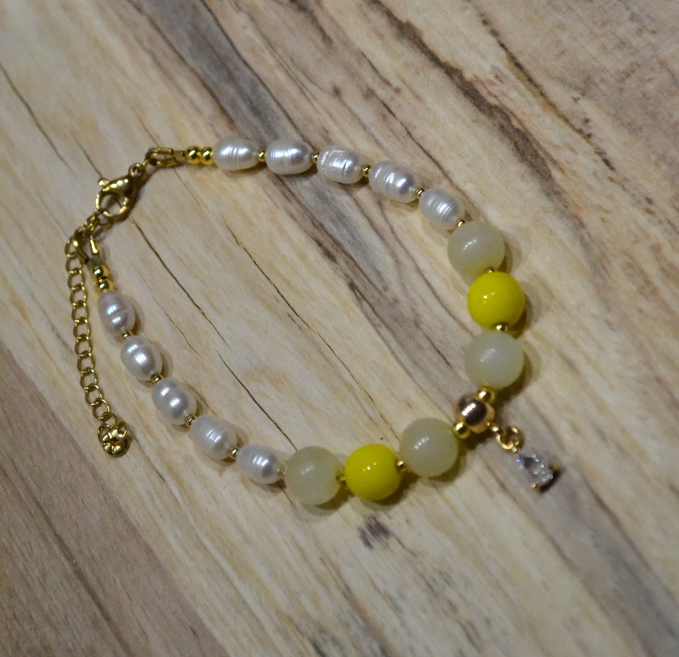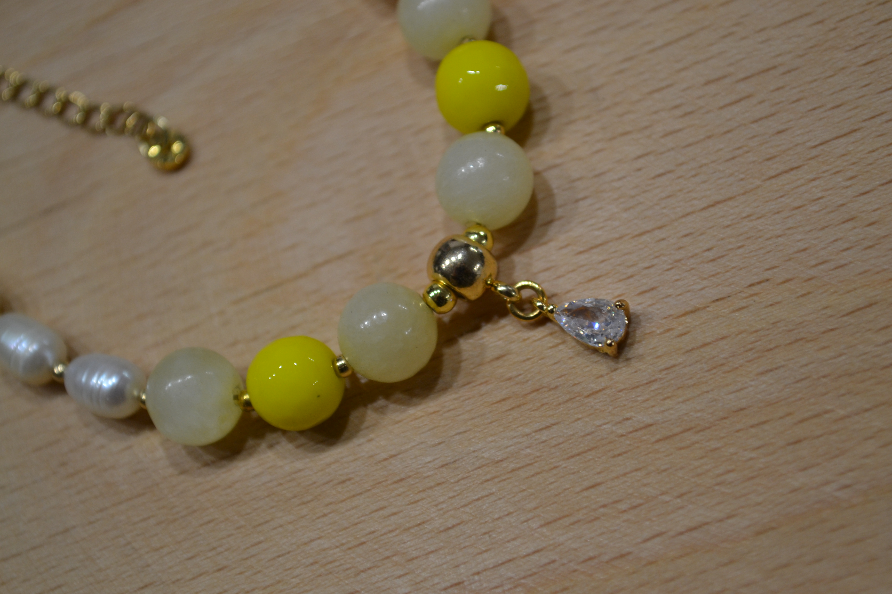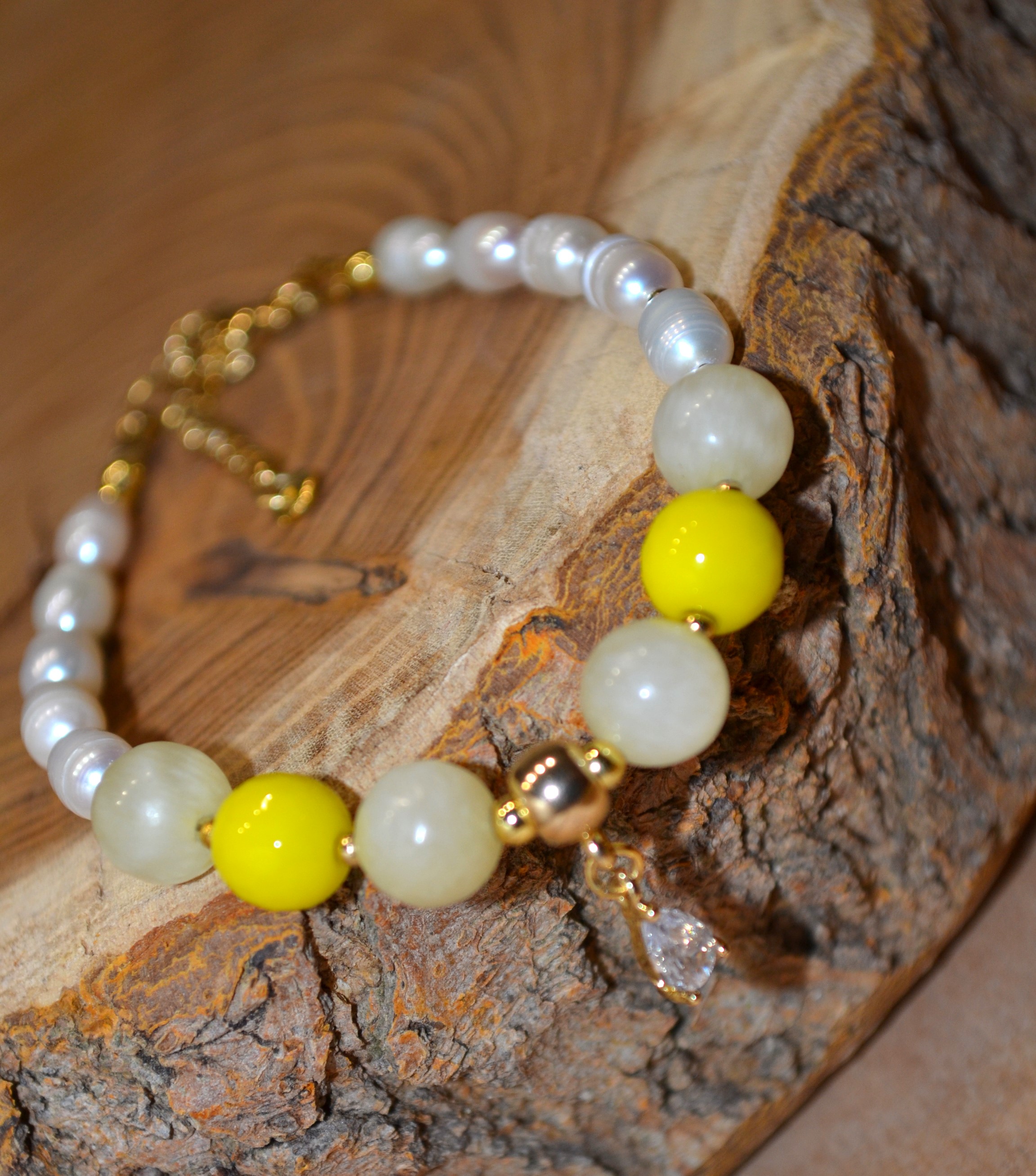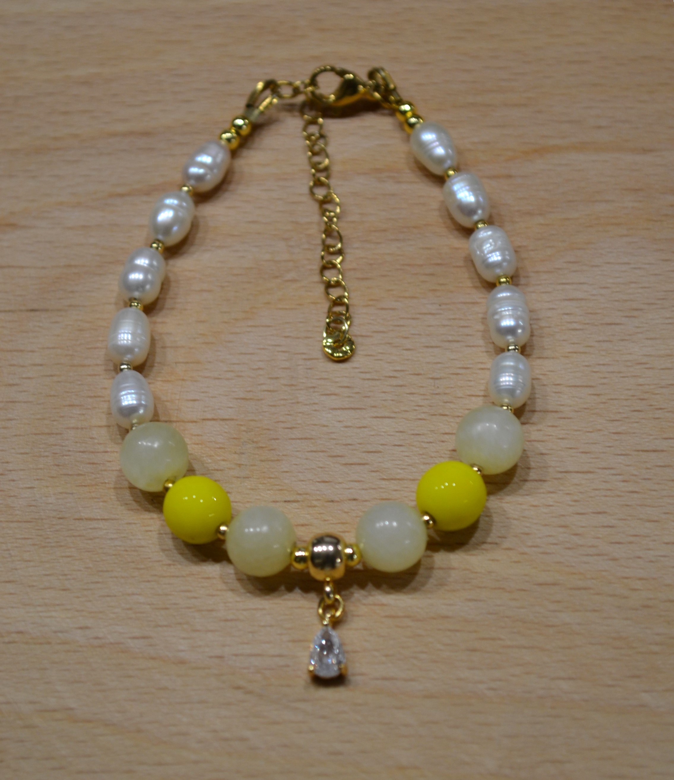 Ta piękna bransoletka zrobiona przez nas z PEREŁ I CYTRYNU zakuta na drucie jubilerskim ze stali chirurgicznej. Dodatki oraz zapięcie w złotym kolorze wykonaliśmy zestali chirurgicznej. W centrum bransoletki umieściliśmy delikatną aplikacje z kryształu.