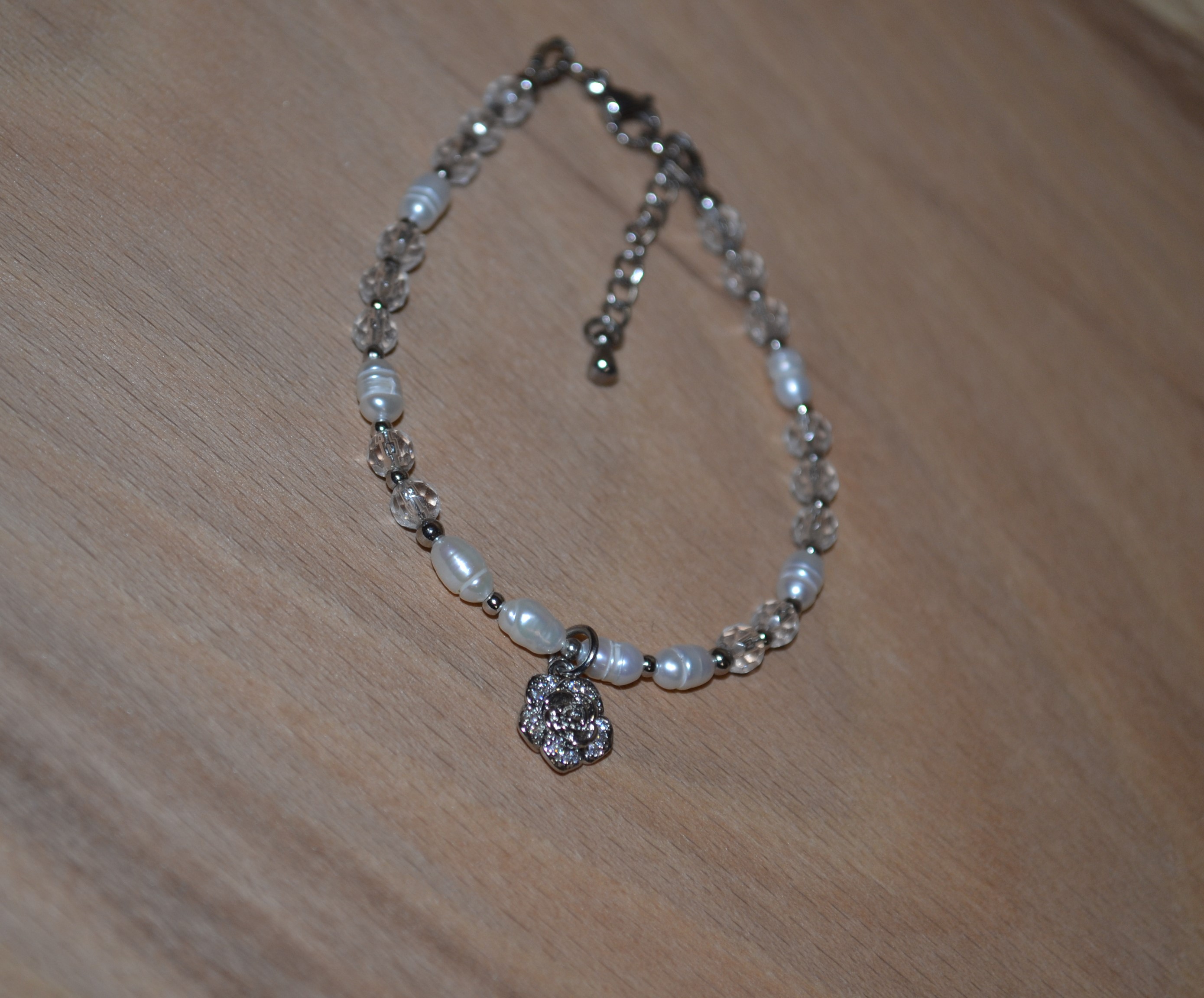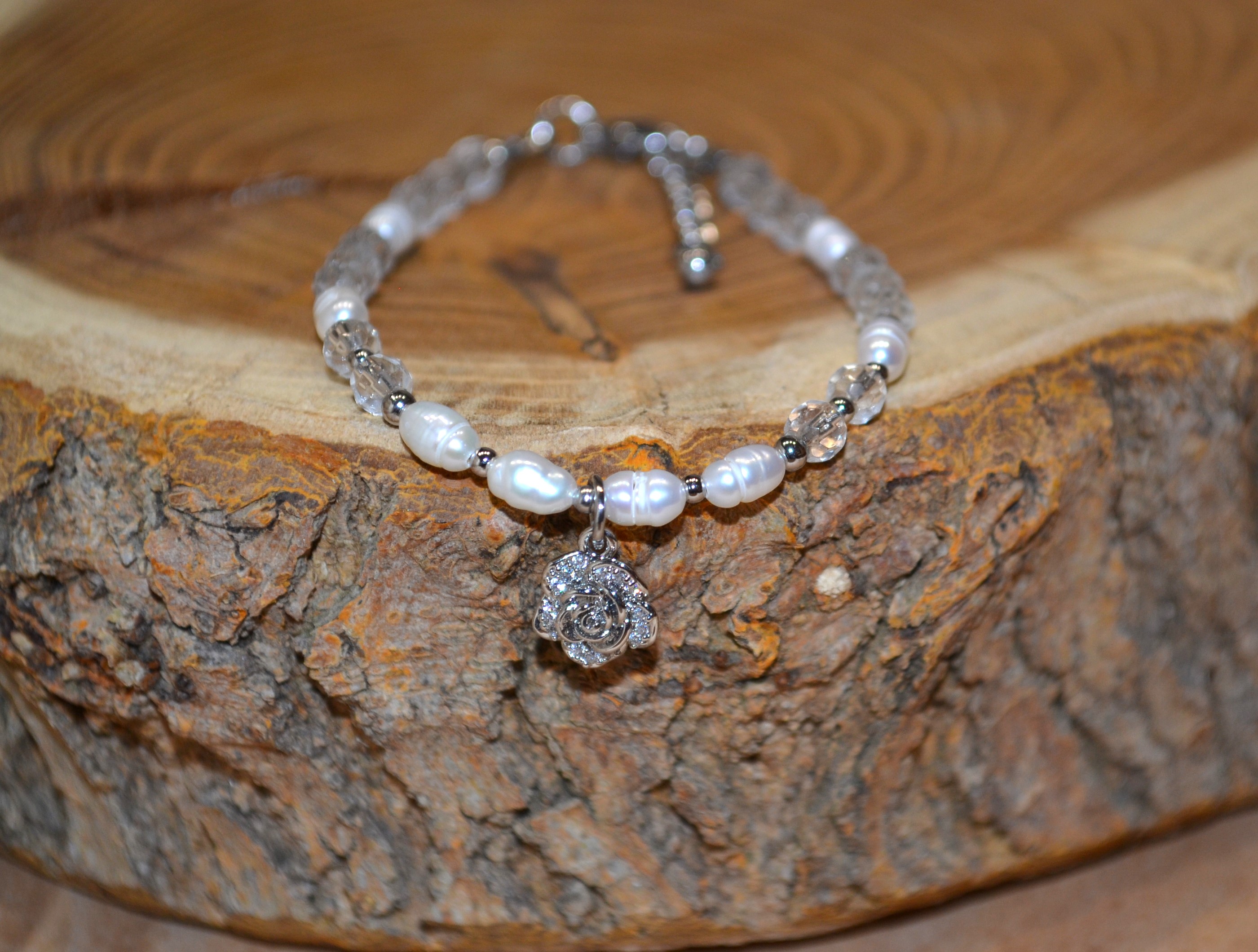Ta piękna bransoletka zrobiona przez nas z PEREŁ I KWARCU zakuta na drucie jubilerskim ze stali chirurgicznej. Dodatki oraz zapięcie w srebrnym kolorze wykonaliśmy zestali chirurgicznej. W centrum bransoletki umieściliśmy delikatny kwiat ze stali chirurgicznej .