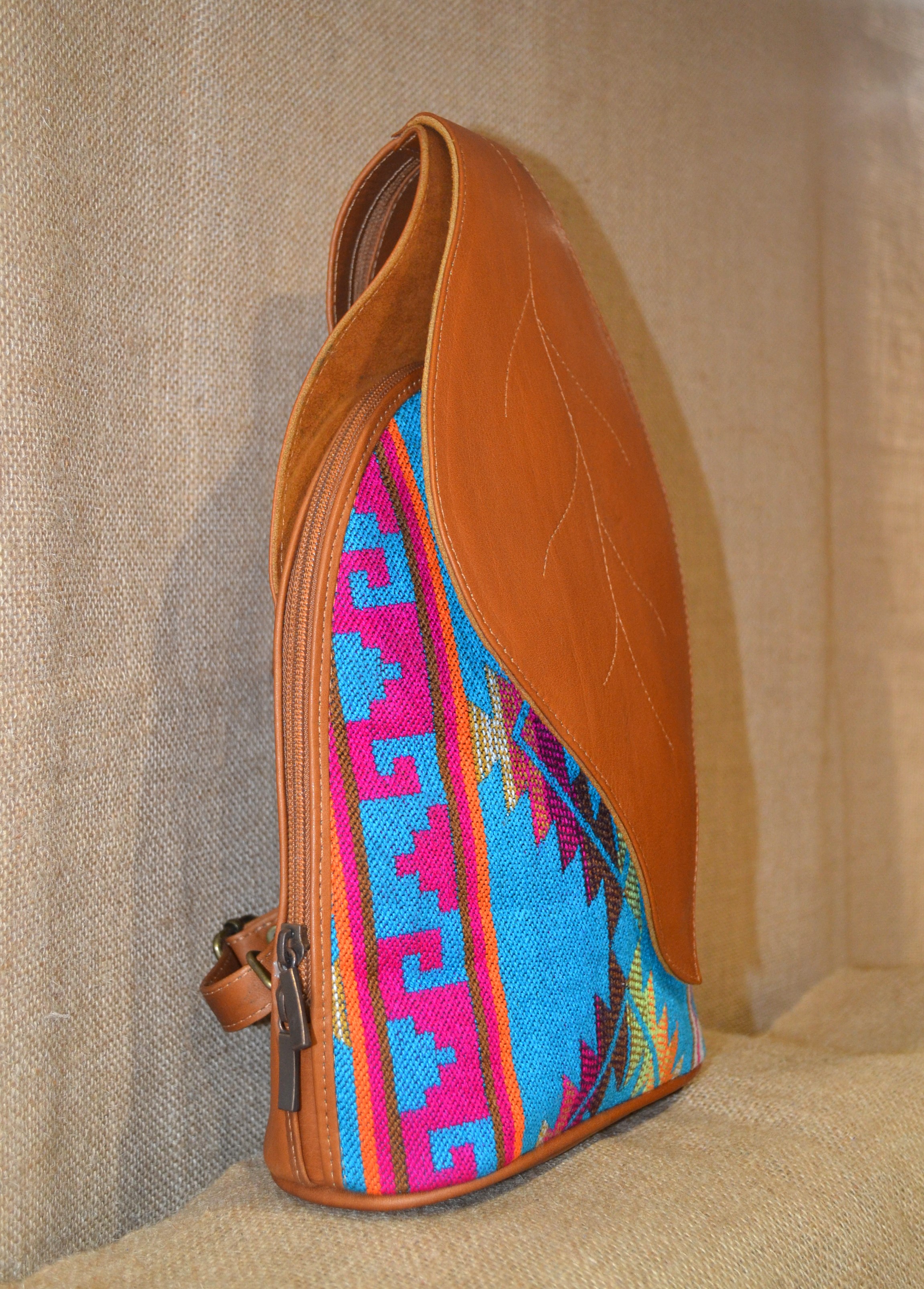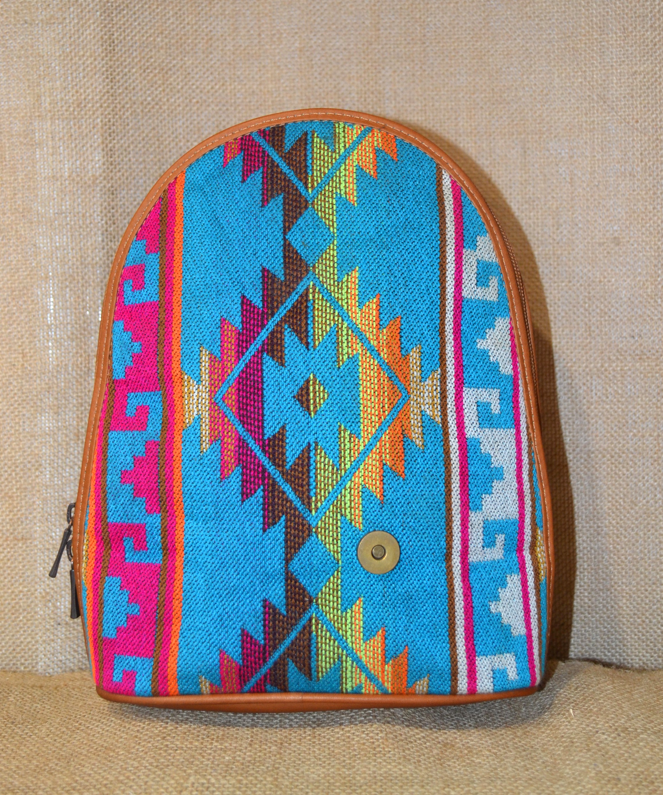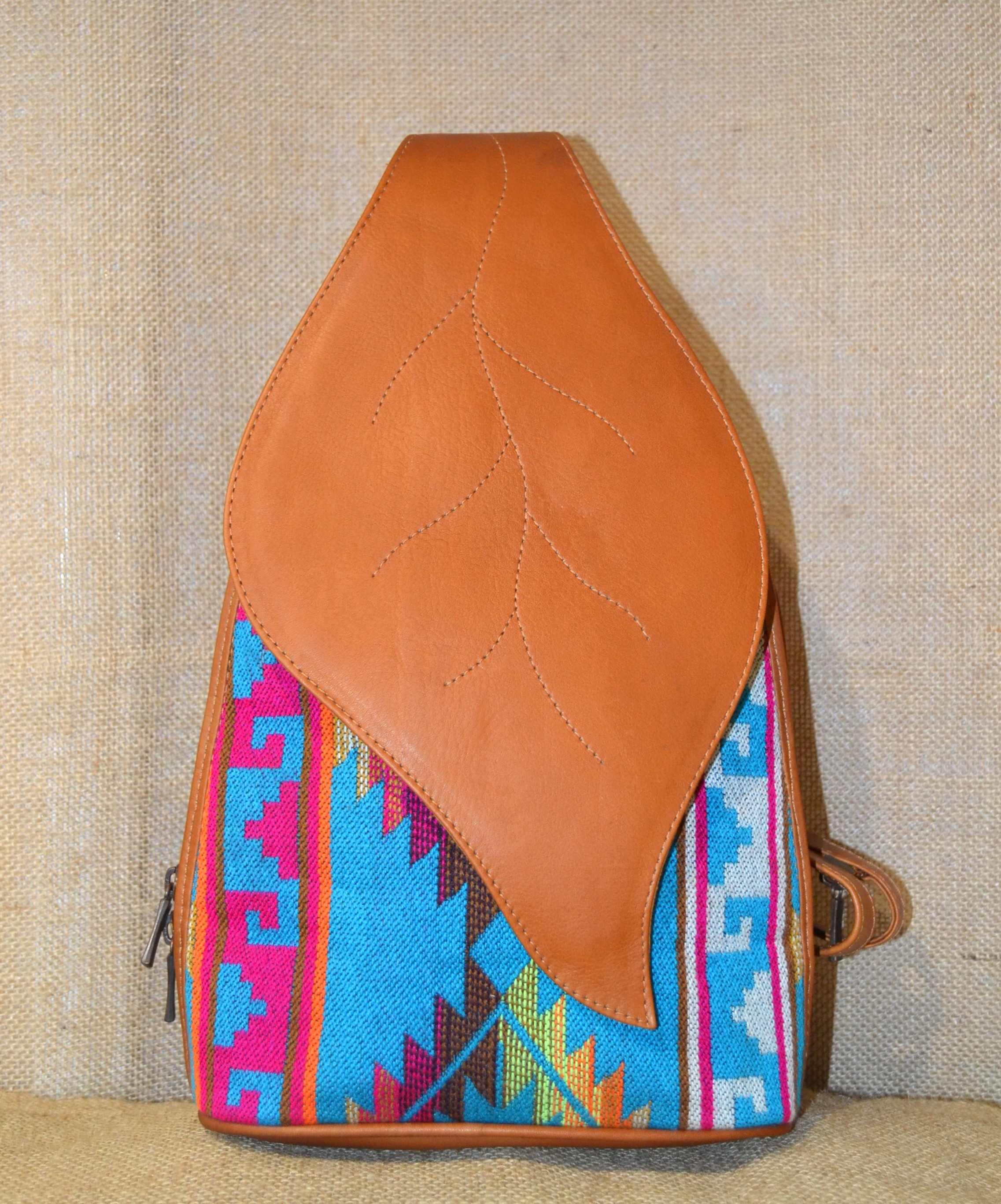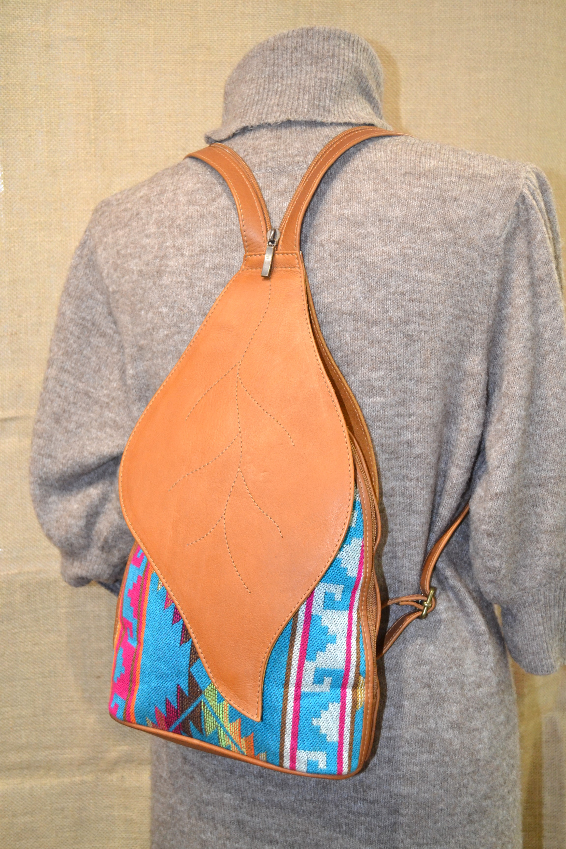 Zobaczcie ten piękny plecak uszyty z naturalnej 100% bydlęcej skóry. Jego przednia część pokryta jest materiałem utkanym z wełny owczej . Kolorowe symbole widniejące na tym materiale to wykorzystywane przez stulecia etniczne symbole ekwadorskich Indian żyjących wysoko w Andach . Wnętrze plecaka podzielono  na jedną główną komorę, dwie małe  otwarte kieszonki i jedną kieszonkę zamykaną na zamek błyskawiczny , środek podszyty został miękką wyściółką. Plecak zamykany jest zamkiem błyskawicznym. Całość zwieńcza klapa  w kształcie liścia . Wszystkie te detale sprawiają że ten właśnie plecak jest unikalny i ponad czasowy . Łączy ze sobą setki lat kultury  i tradycji Indian Kichua oraz nowoczesny styl i piękno naturalnej skóry .