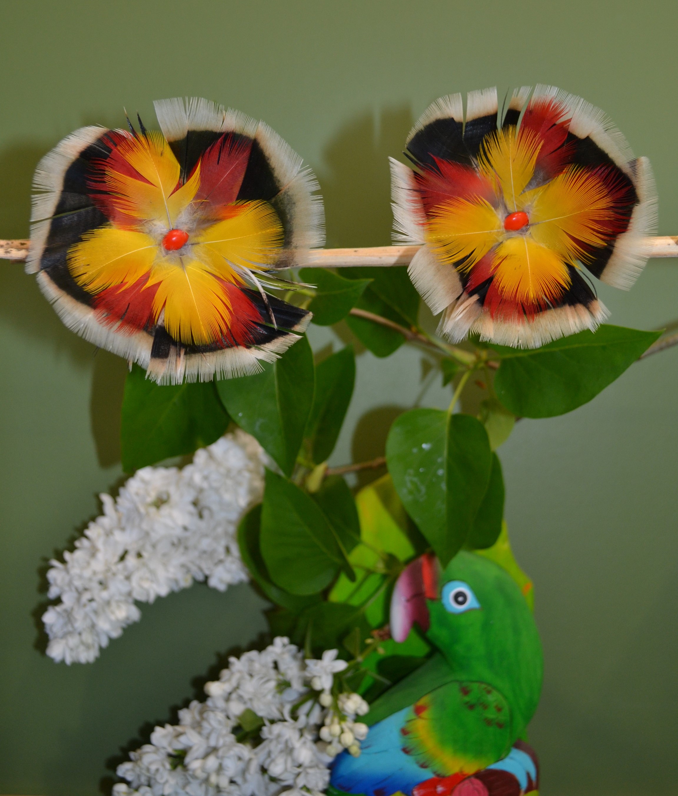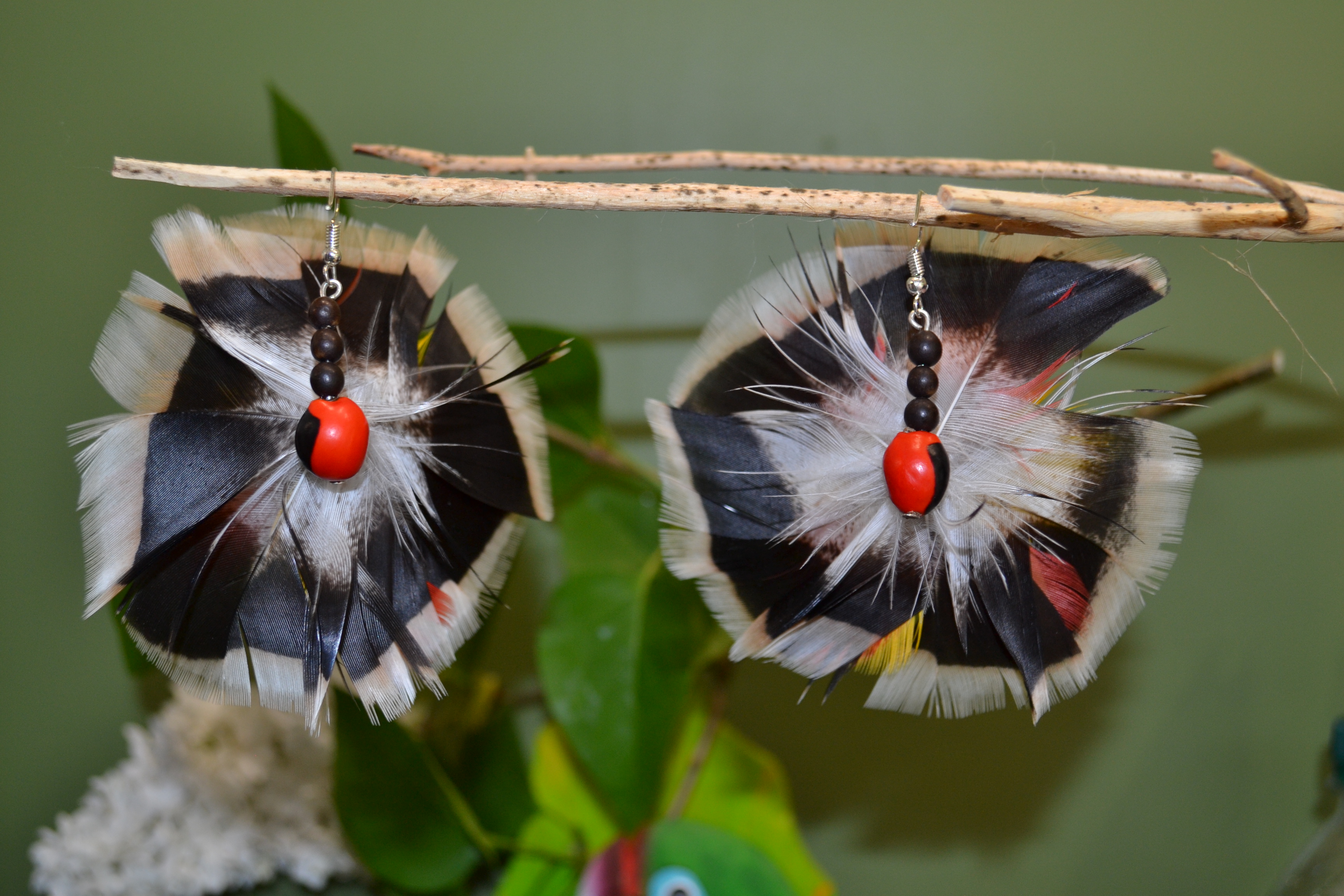 Wykonane są ręcznie z piór zbieranych w hodowlach I ogrodzie zoologicznym na skraju Dżungli Amazońskiej pomiędzy RIO NAPO a RIO CURARAY w Ekwadorze . Zapewniamy że podczas pozyskiwania piór nie cierpi żaden ptak. Skąd to wiem ? Bo osobiście odbieramy te pióra od osoby która je dla nas zbiera . Przywozimy do Polski lekkość wiatru wiejącego u podnóża Andów , tajemnice skrywaną przez Amazońską Dżungle oraz kolory używane przez plemiona Indian Kultury Huaorani zamieszkujące ten obszar. Te trzy cechy zostały zaklęte w kolczyki jakich nie znajdziesz nigdzie indziej na świecie. Skupią na tobie uwagę innych I sprawią że poczujesz się bardziej kobieca niż przedtem. Do wykonania tych kolczyków używamy czerwono czarnych pestek drzewa HUAYRURO . Nasiona te umiejscowione są w centrum kolczyka I na tylnej stronie . Zapięcie typu bigiel otwarty ze stali chirurgicznej pozwala na szybkie I bezproblemowe zakładanie I zdejmowanie