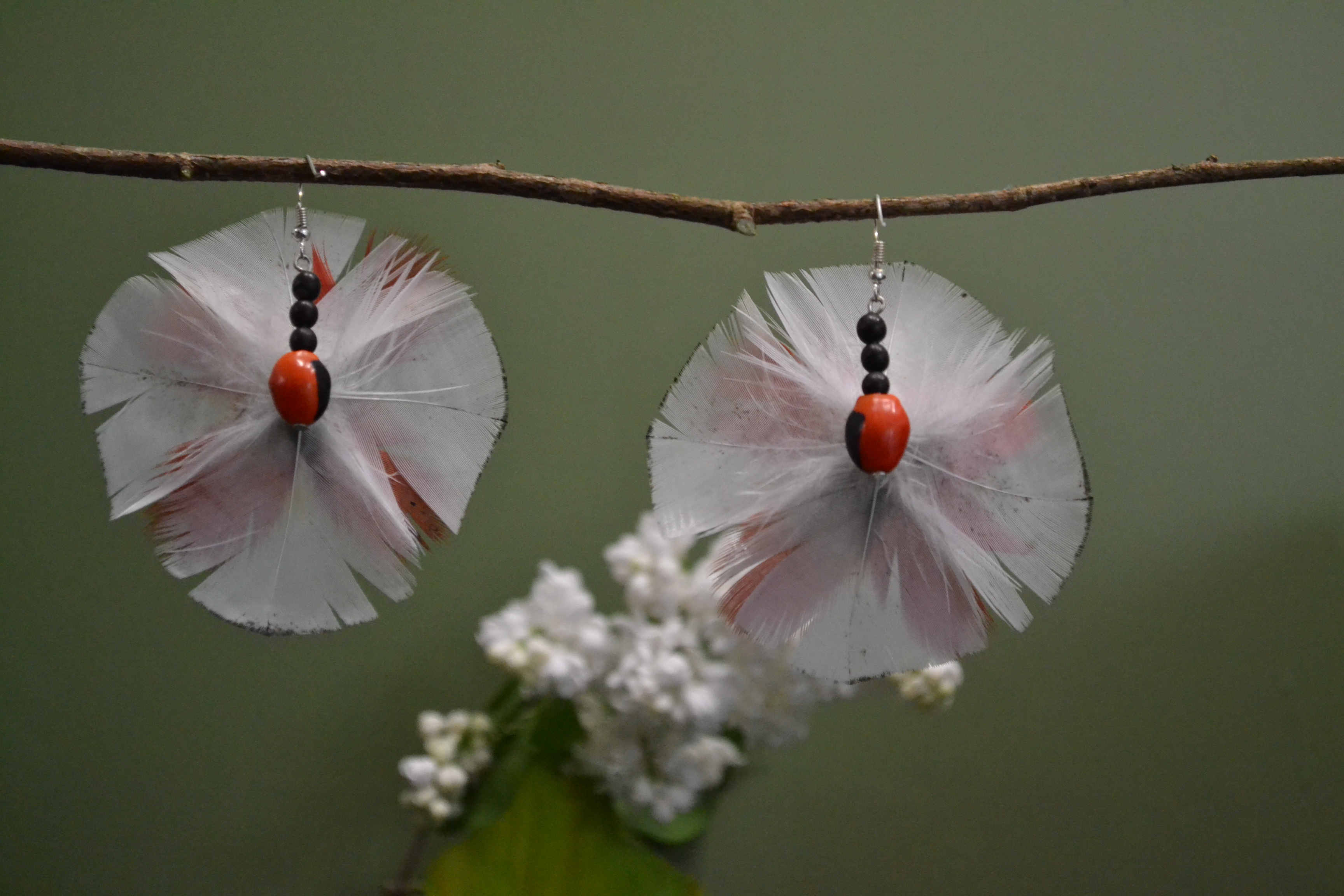 Wykonane są ręcznie z piór zbieranych w hodowlach I ogrodzie zoologicznym na skraju Dżungli Amazońskiej pomiędzy RIO NAPO a RIO CURARAYw Ekwadorze . Zapewniamy że podczas pozyskiwania piór nie cierpi żaden ptak. Skąd to wiem ? Bo osobiście odbieramy te pióra od osoby która je dla nas zbiera . Przywozimy do Polski lekkość wiatru wiejącego u podnóża Andów , tajemnice skrywaną przez Amazońską Dżungle oraz kolory używane przez plemiona Indian Kultury Huaorani zamieszkujące ten obszar. Te trzy cechy zostały zaklęte w kolczyki jakich nie znajdziesz nigdzie indziej na świecie. Skupią na tobie uwagę innych I sprawią że poczujesz się bardziej kobieca niż przedtem. Do wykonania tych kolczyków używamy czerwono czarnych pestek drzewa HUAYRURO . Nasiona te umiejscowione są w centrum kolczyka I na tylnej stronie . Zapięcie typu bigiel otwarty ze stali chirurgicznej pozwala na szybkie I bezproblemowe zakładanie I zdejmowanie