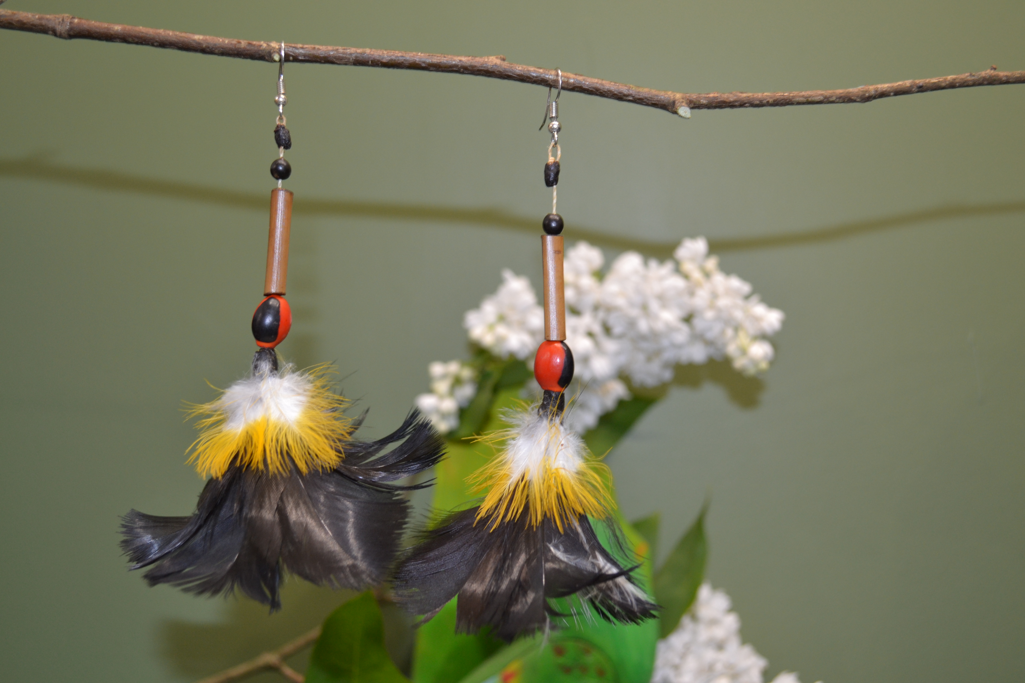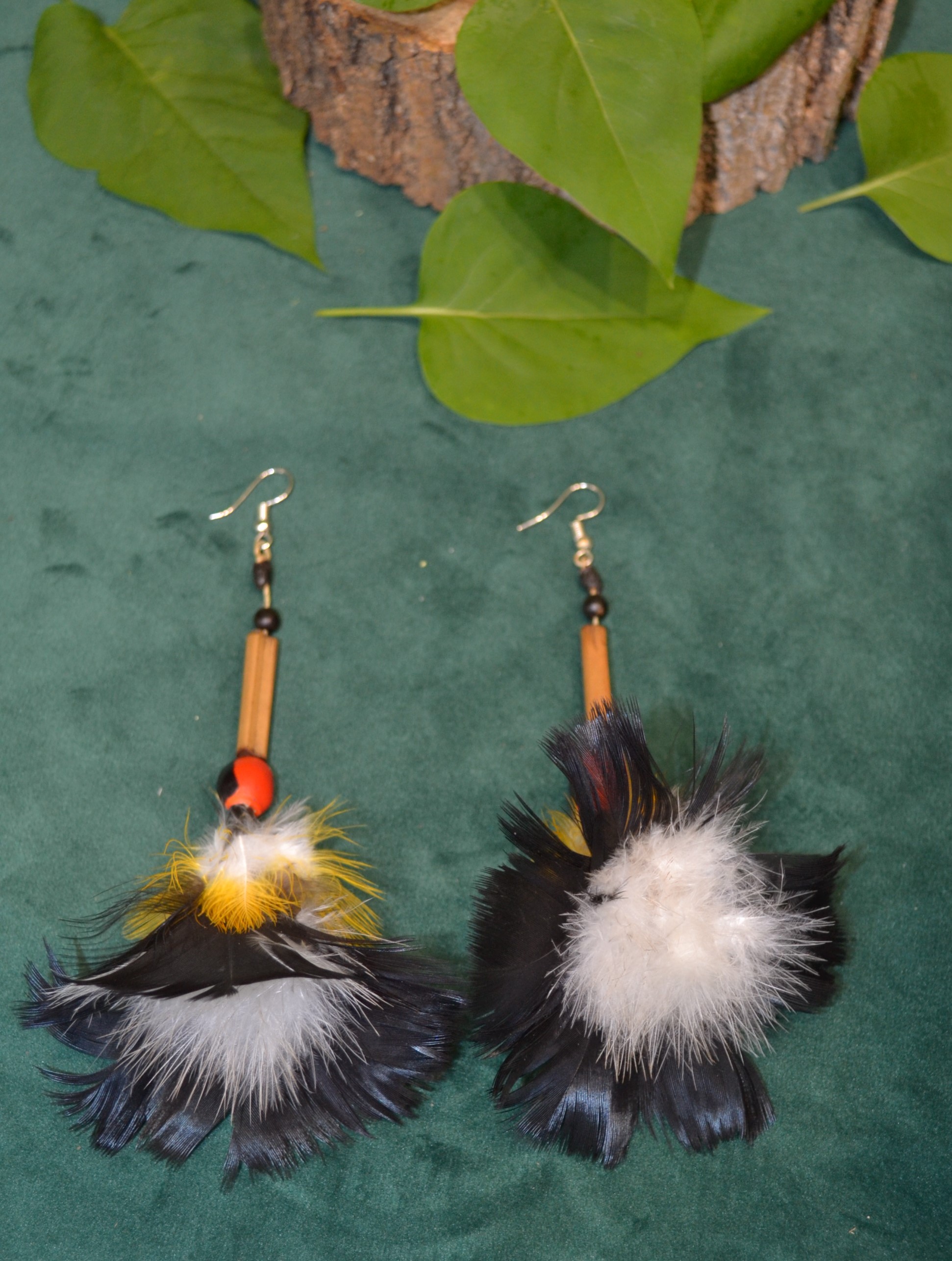 Wykonane są ręcznie z piór zbieranych w hodowlach I ogrodzie zoologicznym na skraju Dżungli Amazońskiej pomiędzy RIO NAPO a RIO CURARAYw Ekwadorze . Zapewniamy że podczas pozyskiwania piór nie cierpi żaden ptak. Skąd to wiem ? Bo osobiście odbieramy te pióra od osoby która je dla nas zbiera . Przywozimy do Polski lekkość wiatru wiejącego u podnóża Andów , tajemnice skrywaną przez Amazońską Dżungle oraz kolory używane przez plemiona Indian Kultury Huaorani zamieszkujące ten obszar. Te trzy cechy zostały zaklęte w kolczyki jakich nie znajdziesz nigdzie indziej na świecie. Skupią na tobie uwagę innych I sprawią że poczujesz się bardziej kobieca niż przedtem. Do wykonania tych kolczyków używamy czerwono czarnych pestek drzewa HUAYRURO . Nasiona te umiejscowione są w centrum kolczyka I na tylnej stronie . Zapięcie typu bigiel otwarty ze stali chirurgicznej pozwala na szybkie I bezproblemowe zakładanie I zdejmowanie