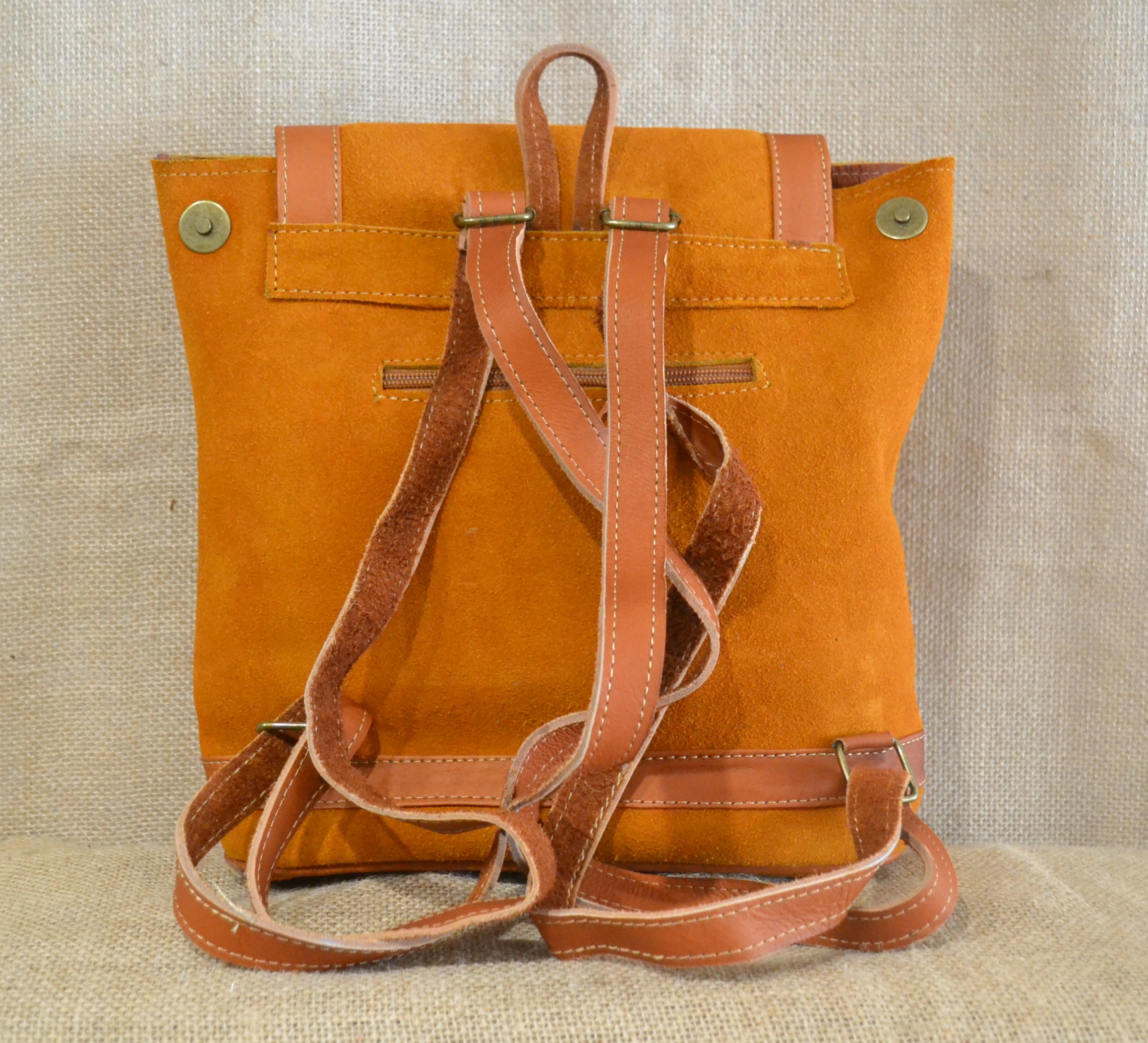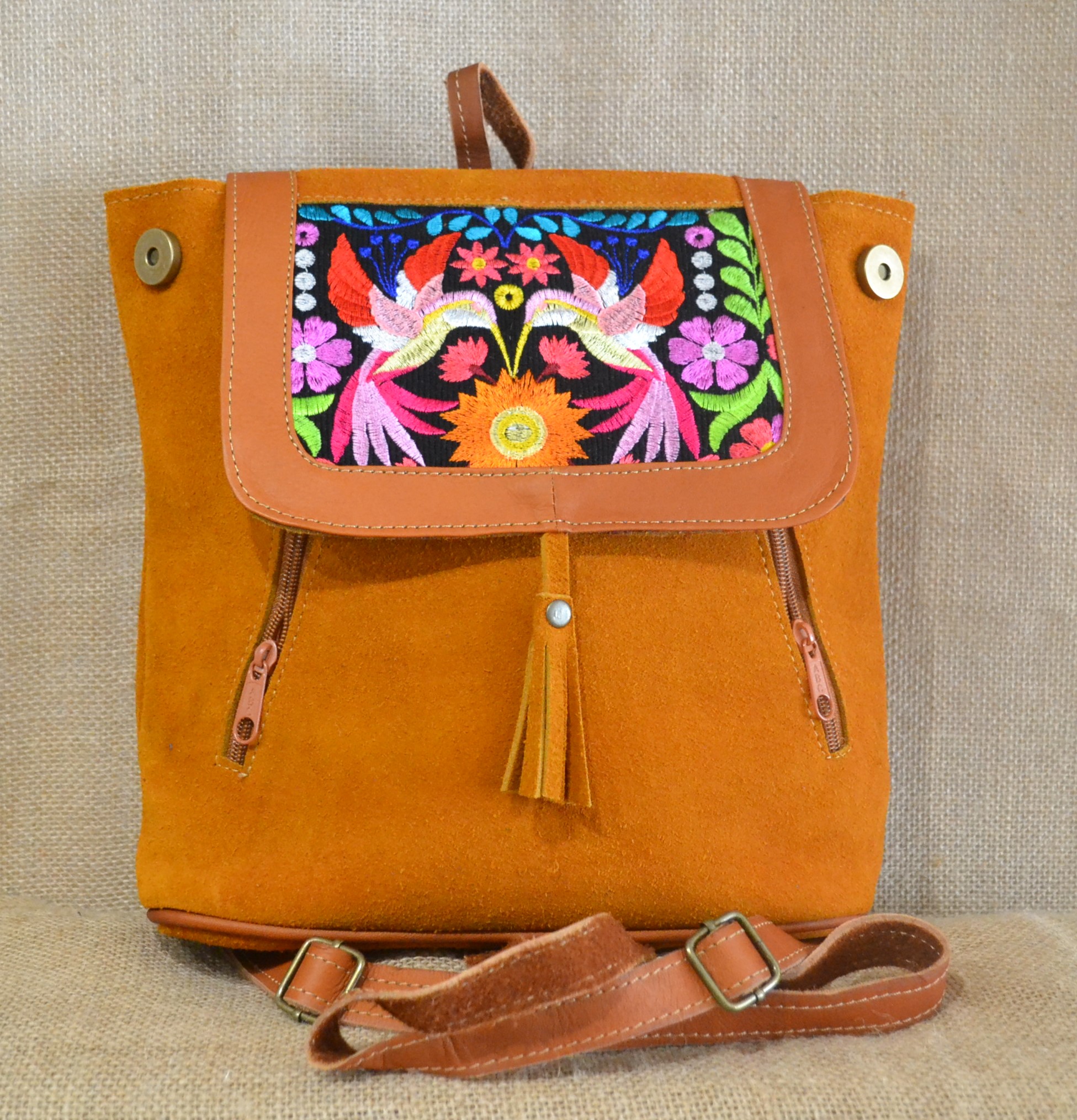 Strona główna » Wyroby ze skóry » Mały plecak ze skóry zamszowej jasnobrązowy z kwiatowym haftem