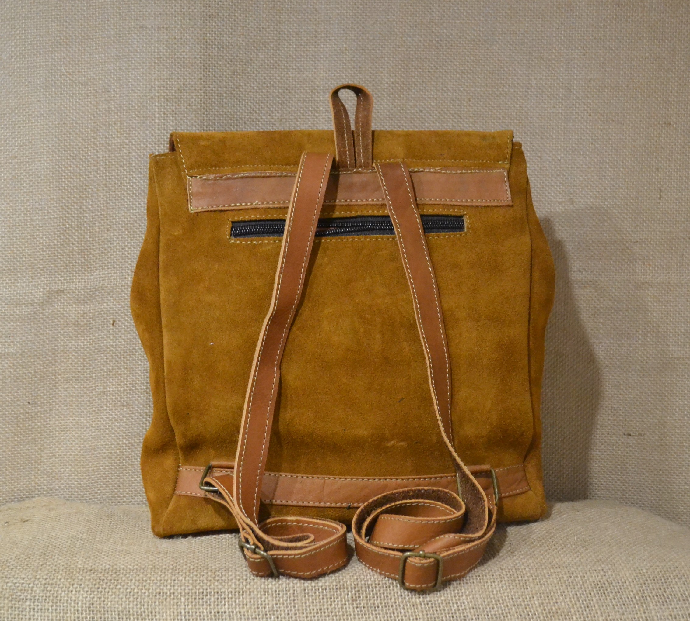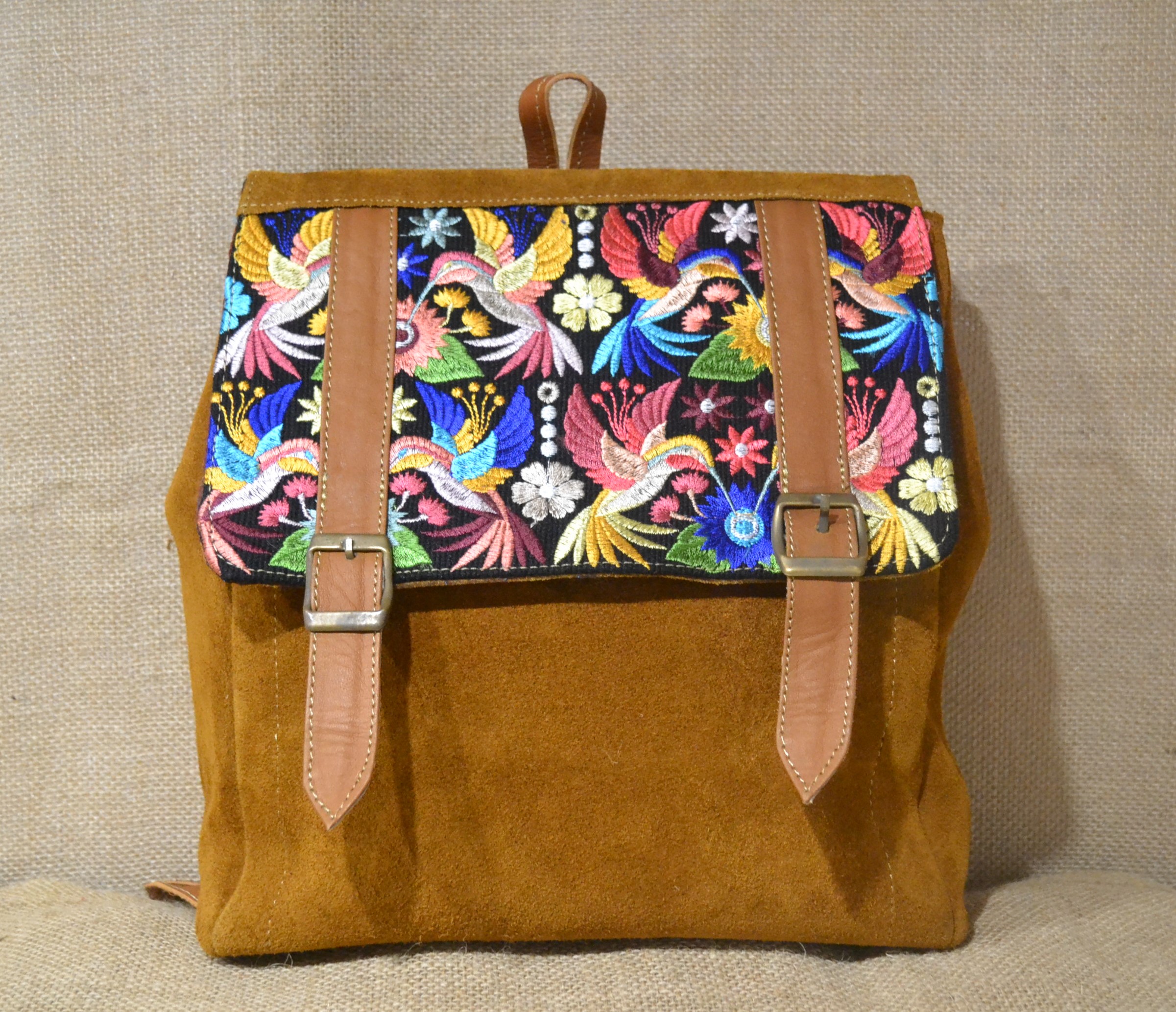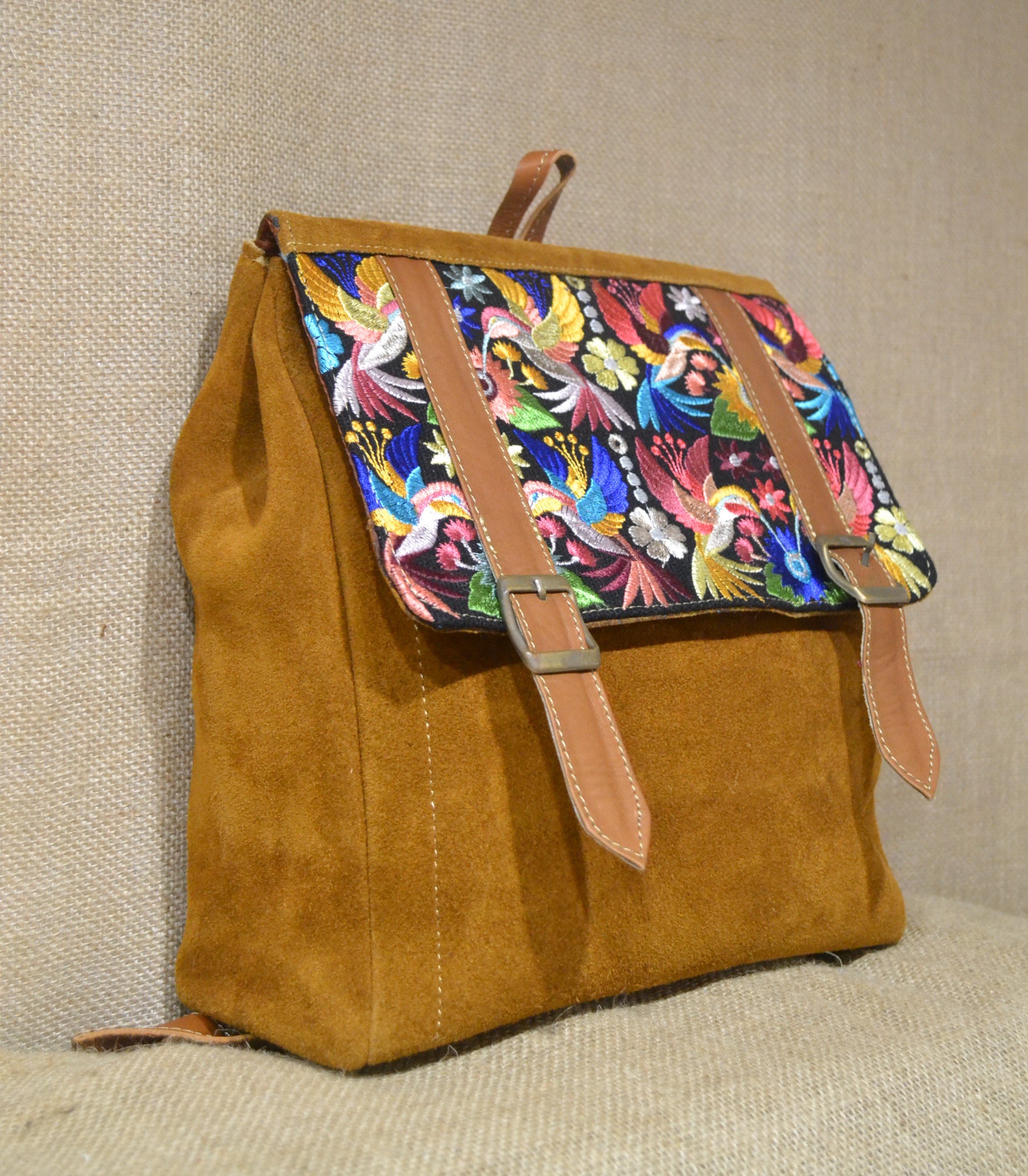 Strona główna » Wyroby ze skóry » Mały plecak ze skóry zamszowej jasnobrązowy z kwiatowym haftem
