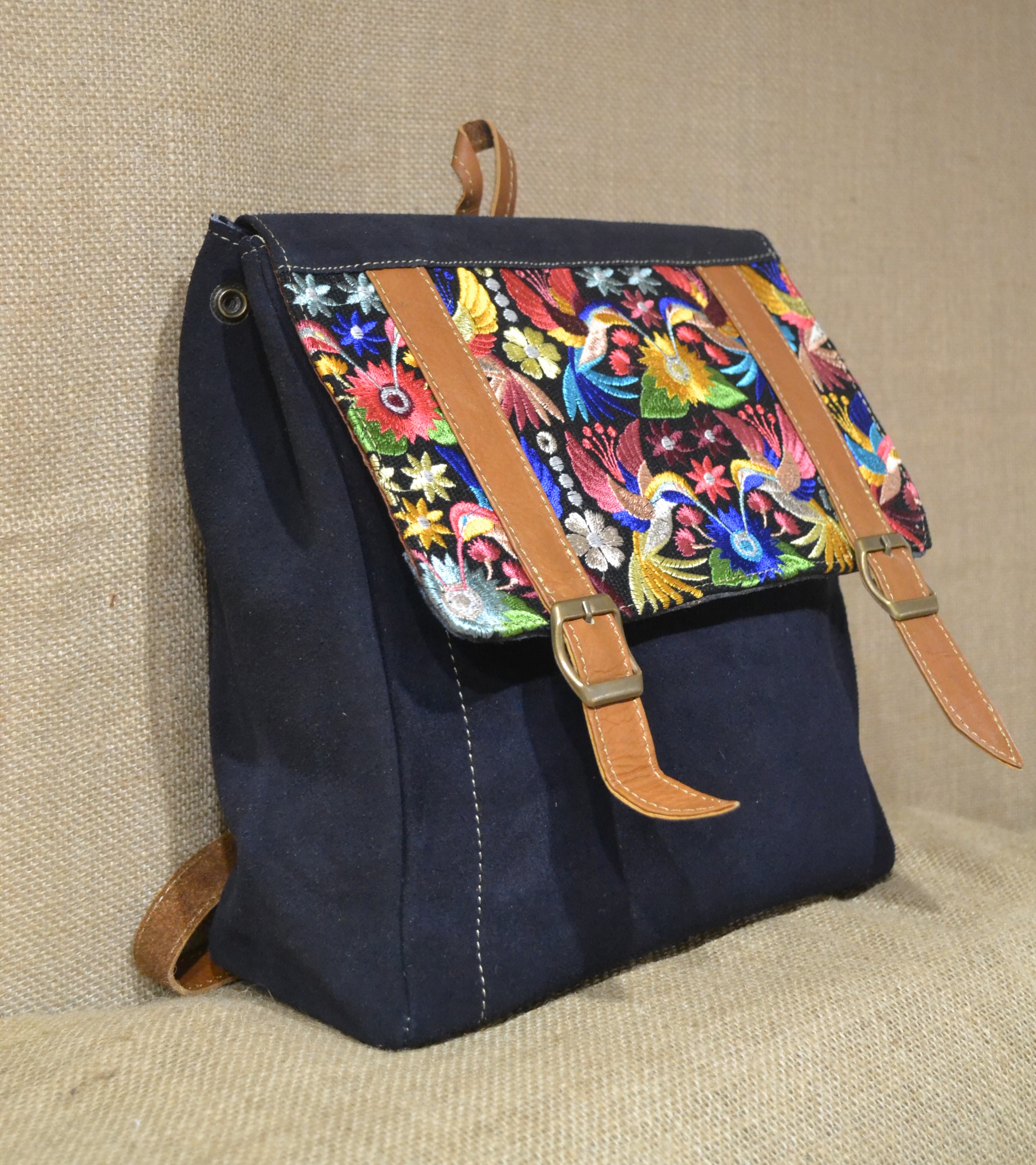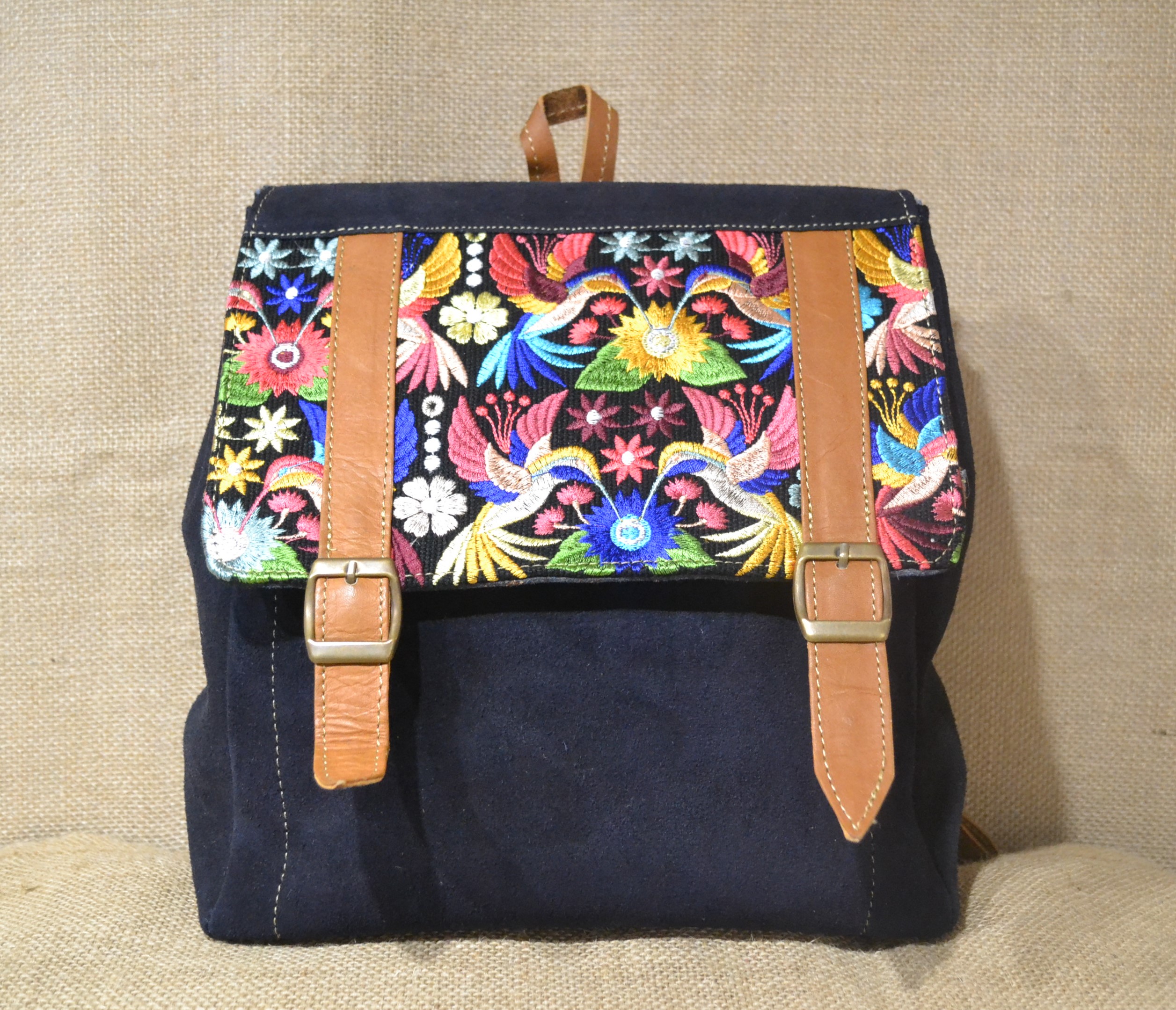 Mały plecak ze skóry zamszowej kolor granatowego z kwiatowym haftemMały plecak ze skóry zamszowej kolor granatowego z kwiatowym haftemMały plecak ze skóry zamszowej kolor granatowego z kwiatowym haftem
