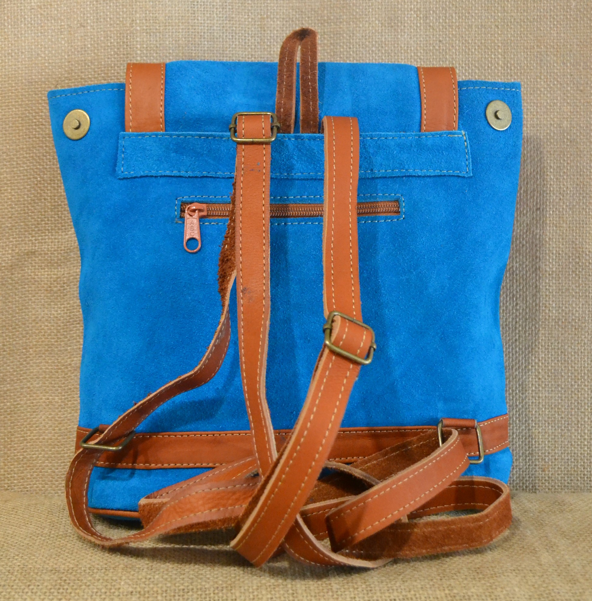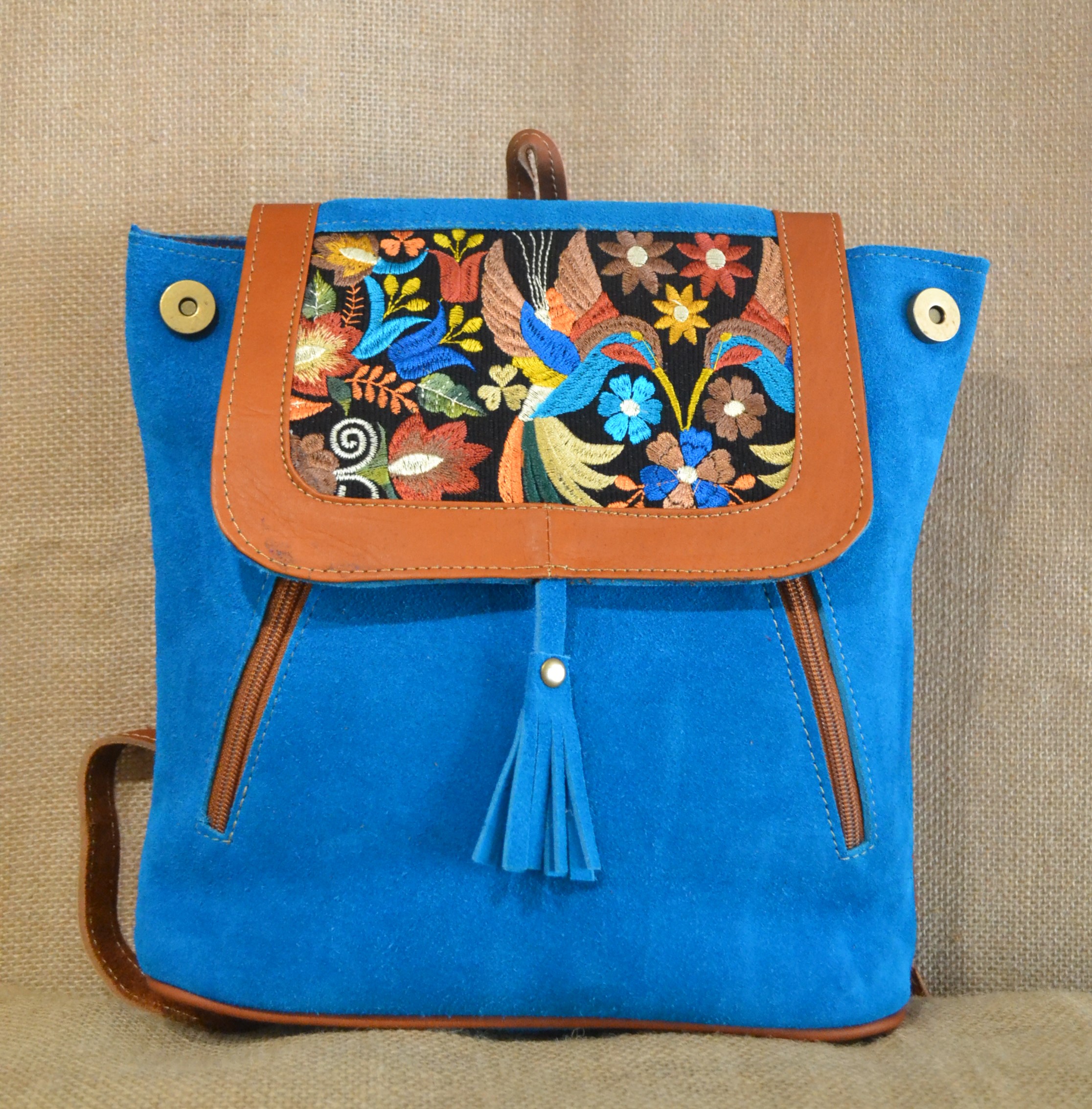 Strona główna » Wyroby ze skóry » Mały plecak ze skóry zamszowej niebieski z kwiatowym haftem