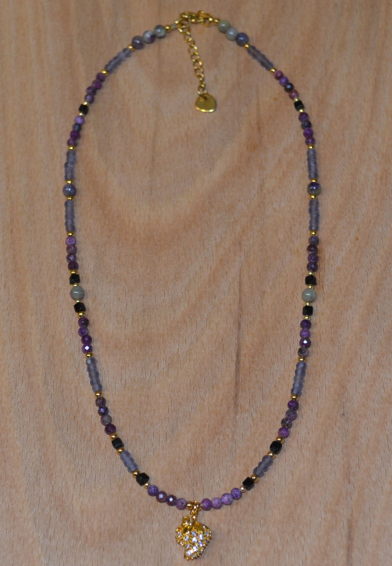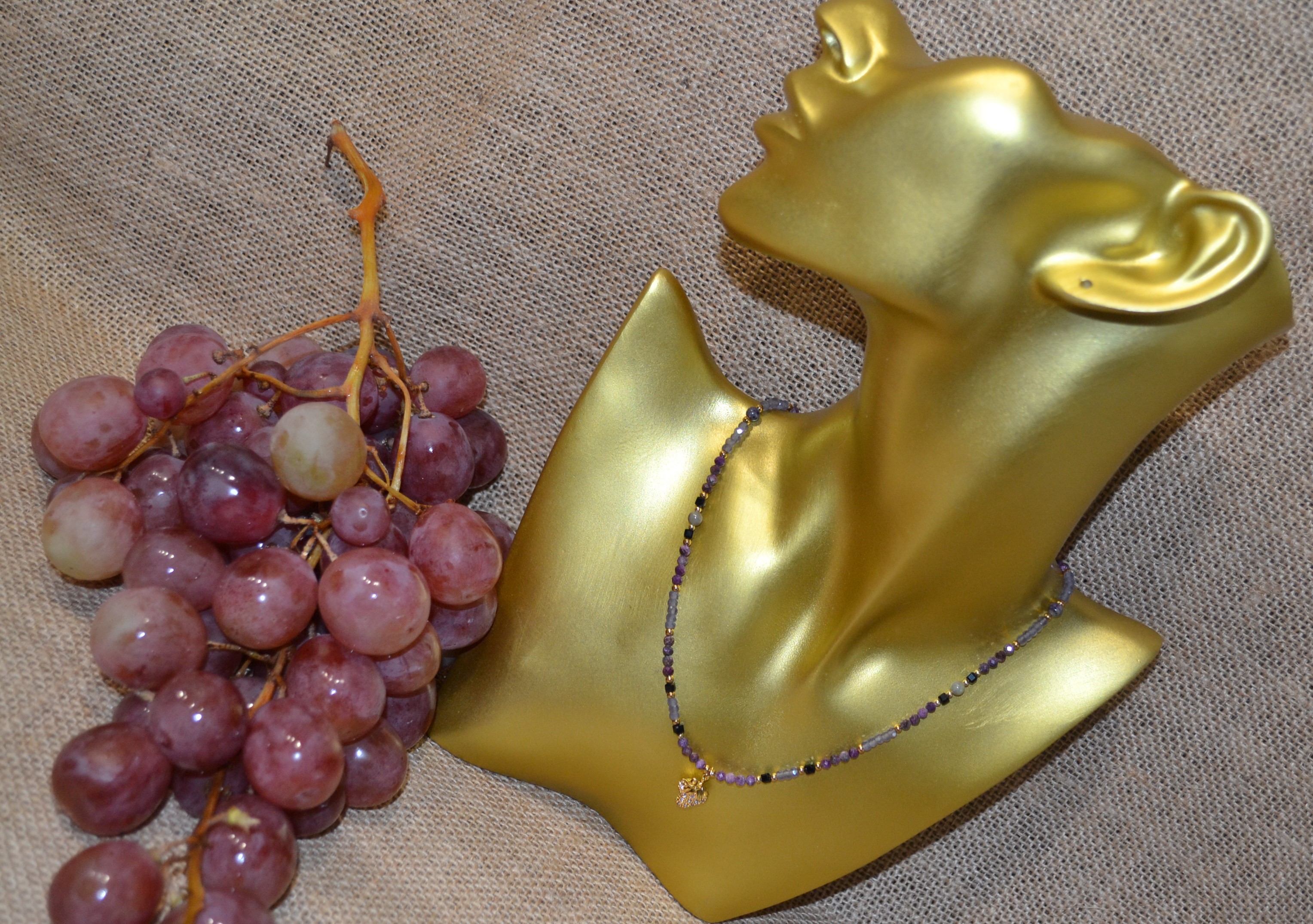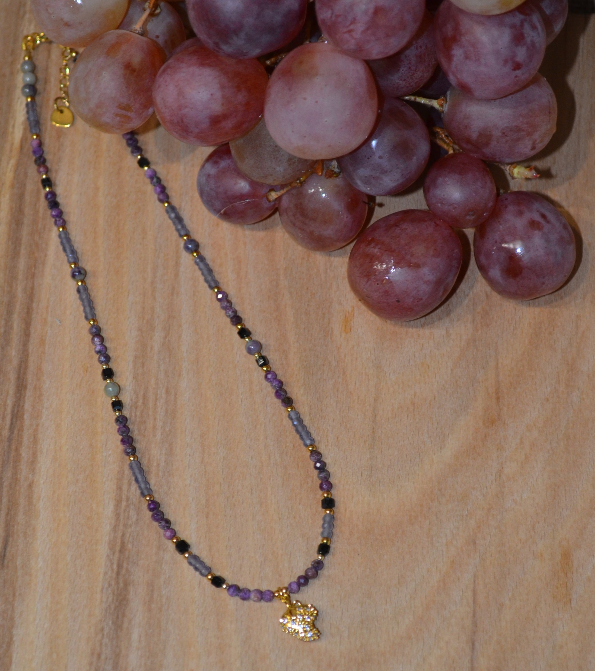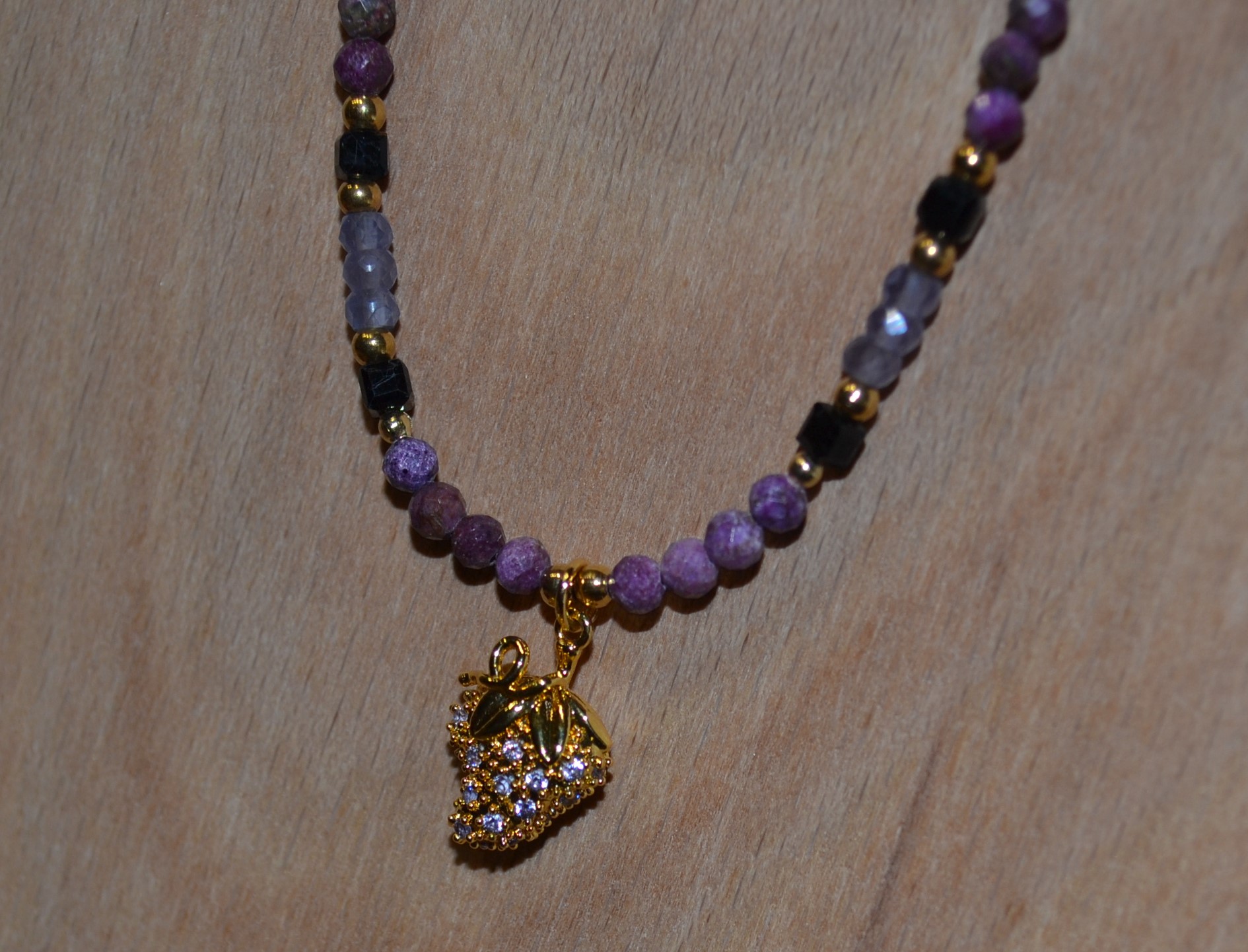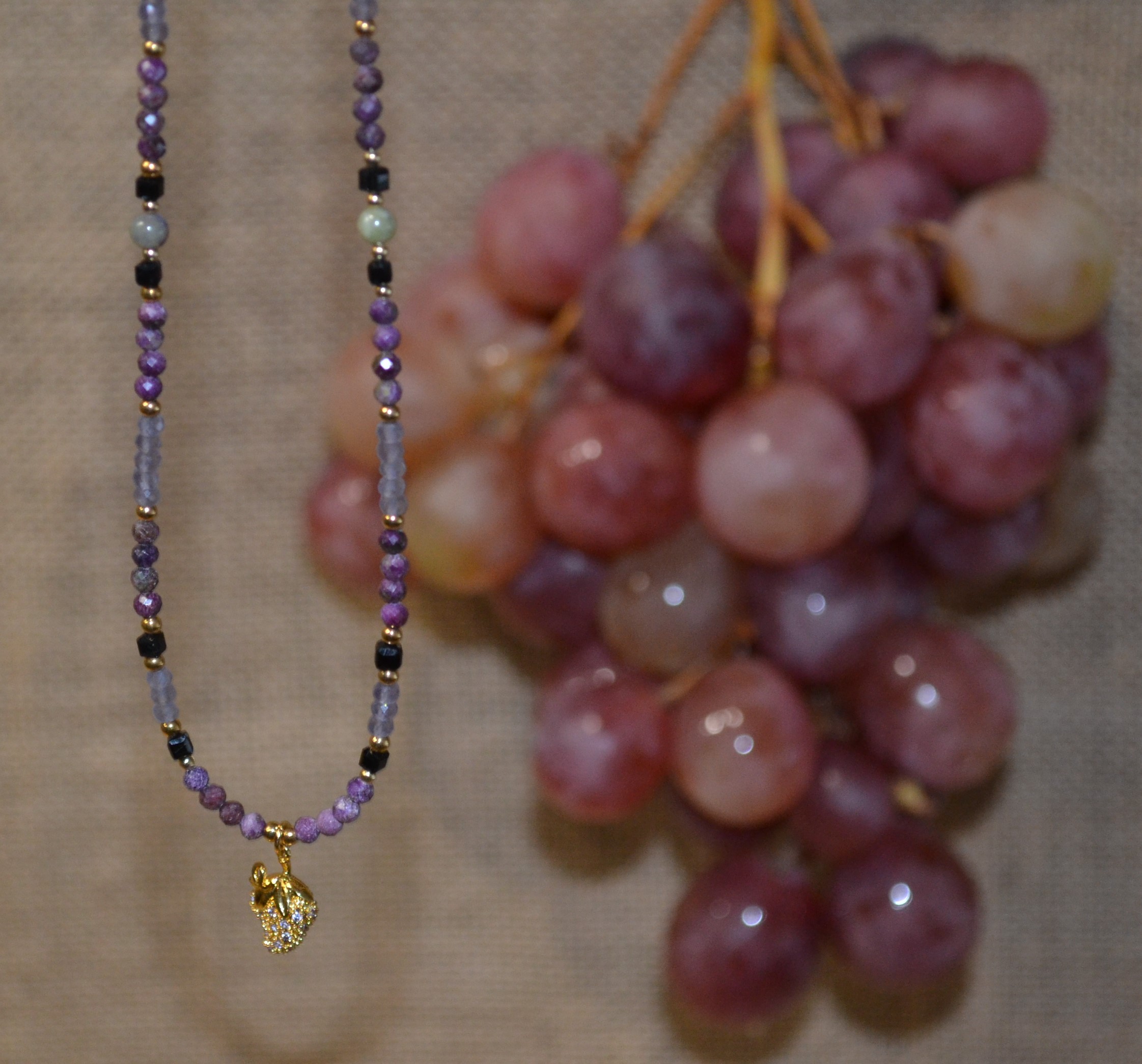 Ten piękny naszyjnik zrobiony przez nas z czaroitu , czarnego turmalinu i kociego oka został zakuty na drucie jubilerskim ze stali chirurgicznej. Dodatki oraz zapięcie w złotym kolorze wykonaliśmy zestali chirurgicznej. W centrum naszyjnika umieściliśmy wisiorek w kształcie kiści winogrona z cyrkoniami 1cm / 1 cm