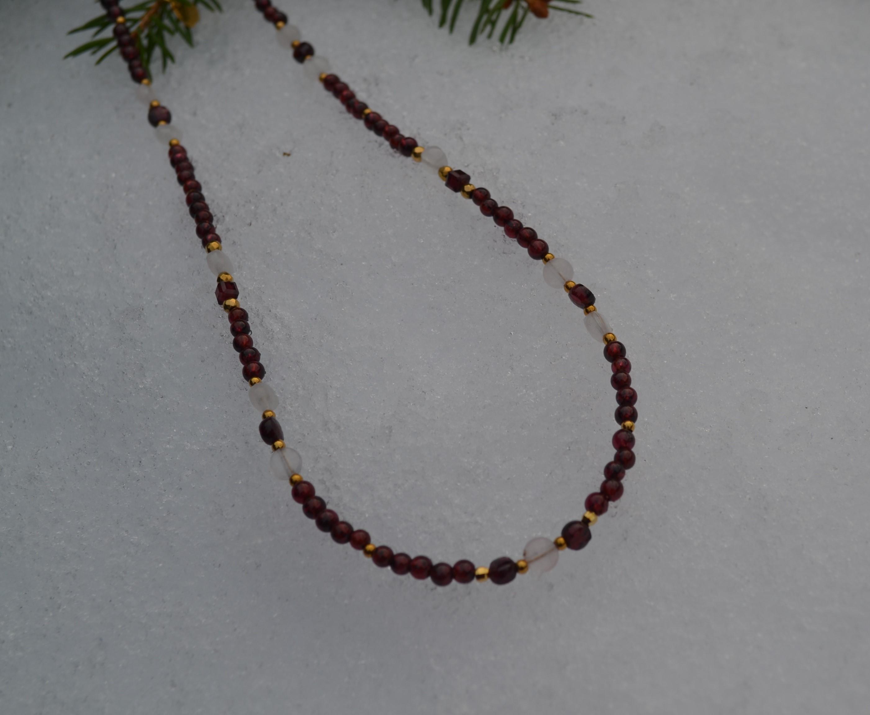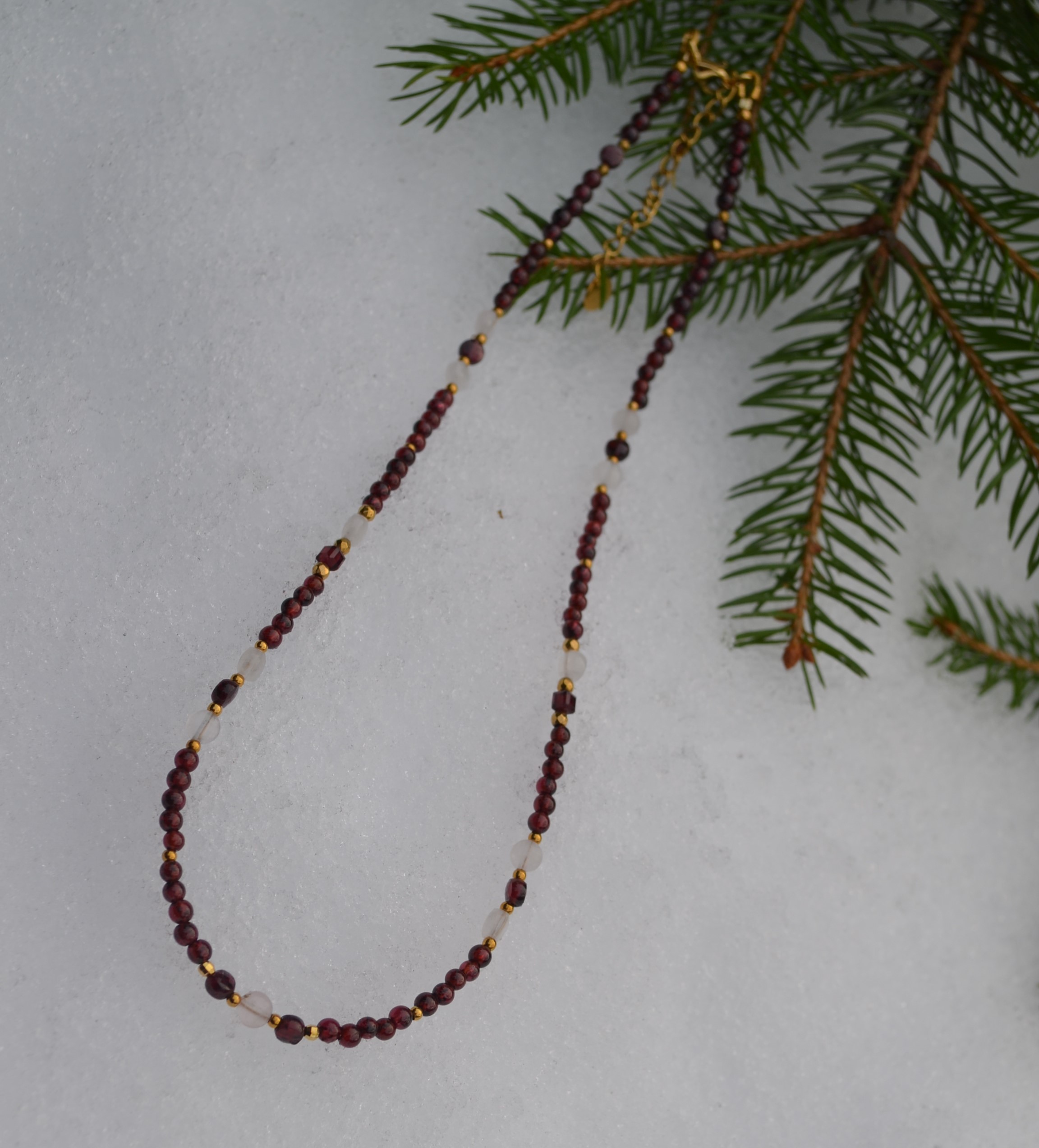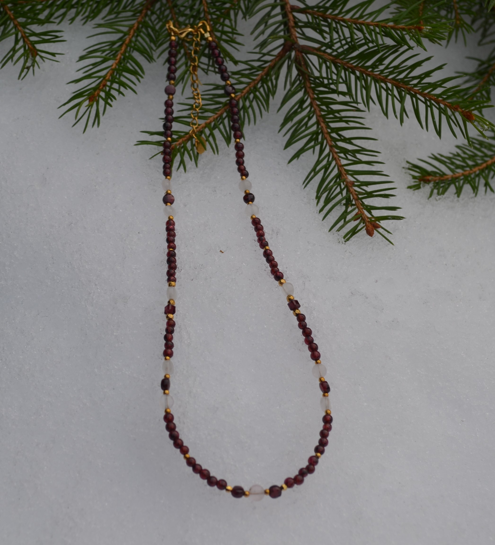 Ten piękny naszyjnik zrobiony przez nas z kamienia GRANATU I KWARCU RÓZOWEGO zakuty na drucie jubilerskim ze stali chirurgicznej. Dodatki oraz zapięcie w złotym kolorze wykonaliśmy zestali chirurgicznej.