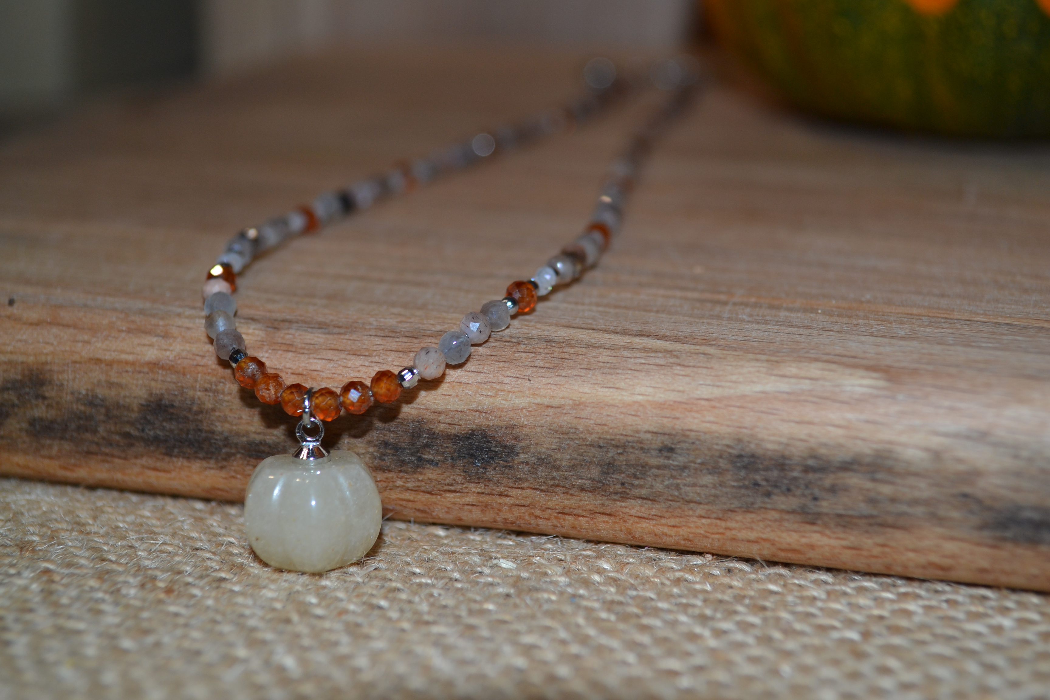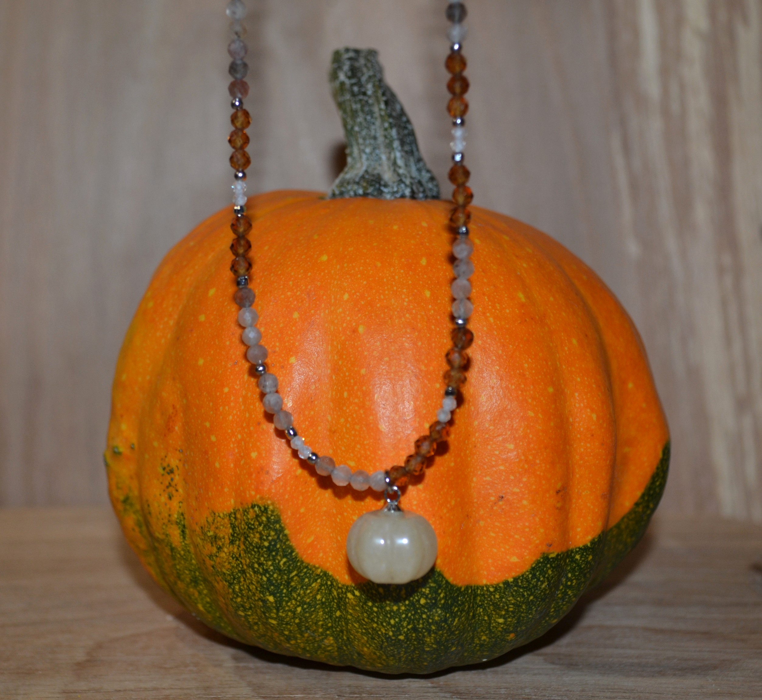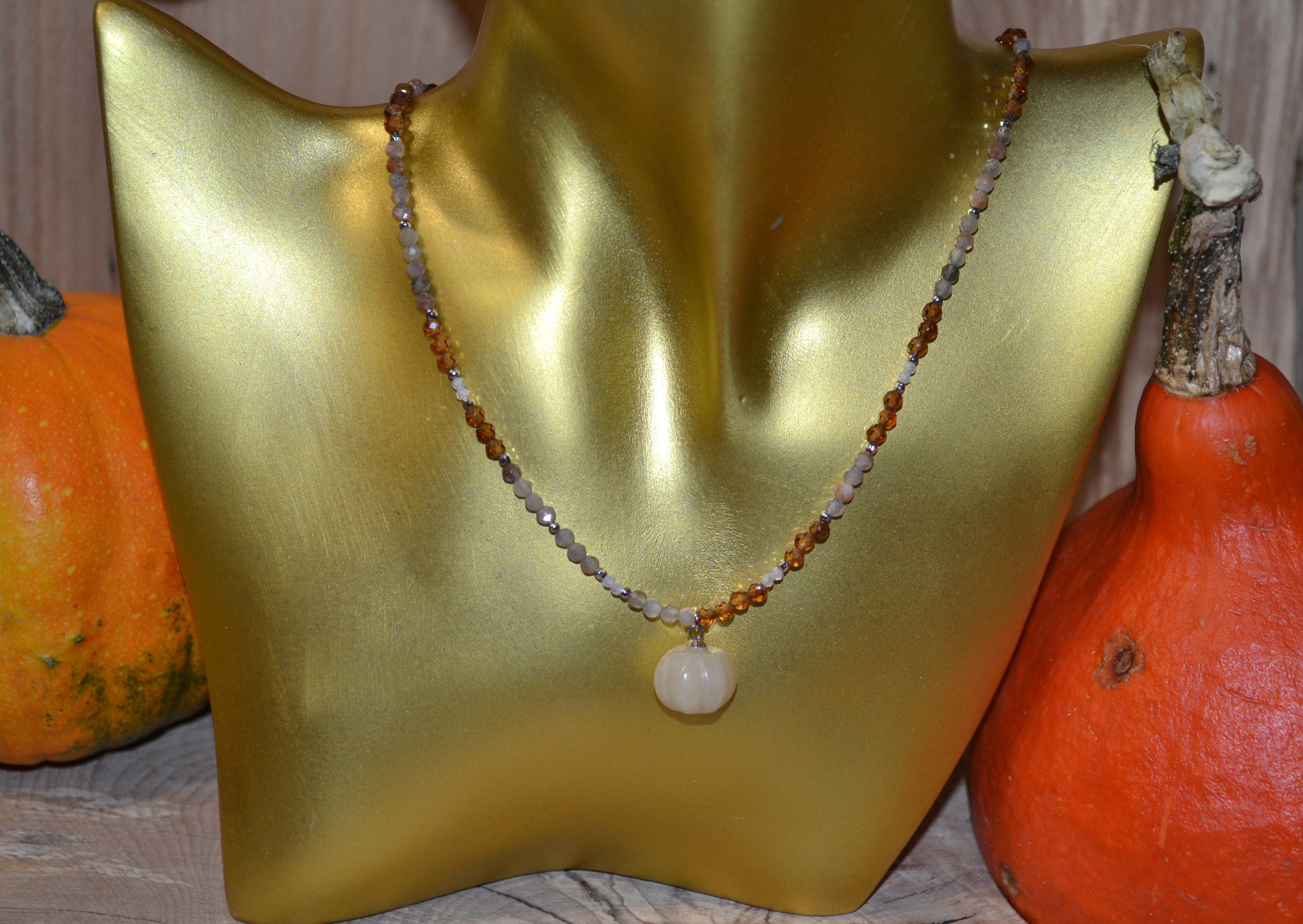 Ten piękny naszyjnik zrobiony przez nas z kamieni granatu , kamienia słonecznego i białej cyrkonii, zakuty został na drucie jubilerskim ze stali chirurgicznej. Dodatki oraz zapięcie w srebrnym kolorze wykonaliśmy zestali chirurgicznej. W centrum naszyjnika umieściliśmy wisiorek w kształcie dyni wykonany z jadeitu 1,5cm / 1,5 cm