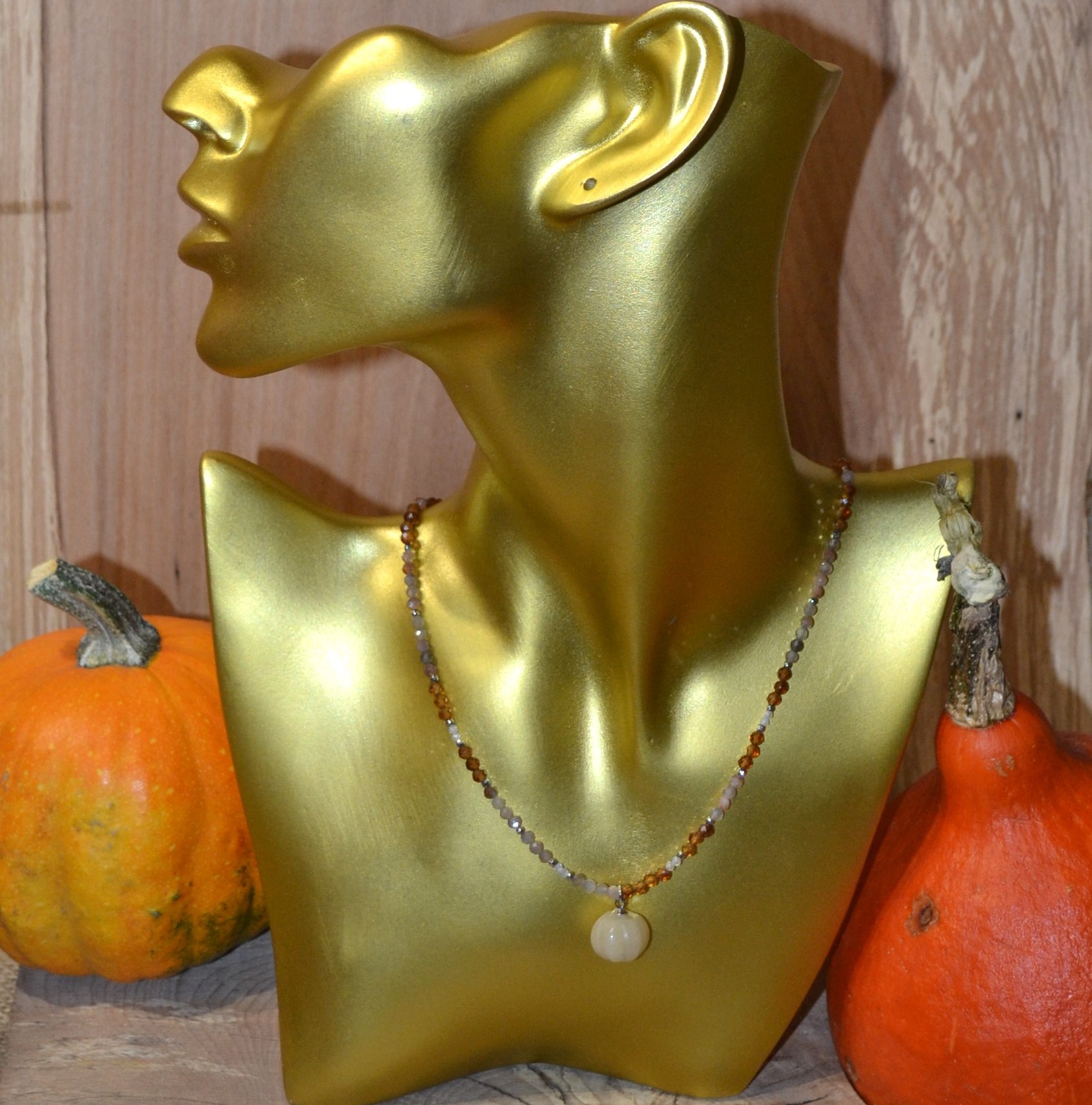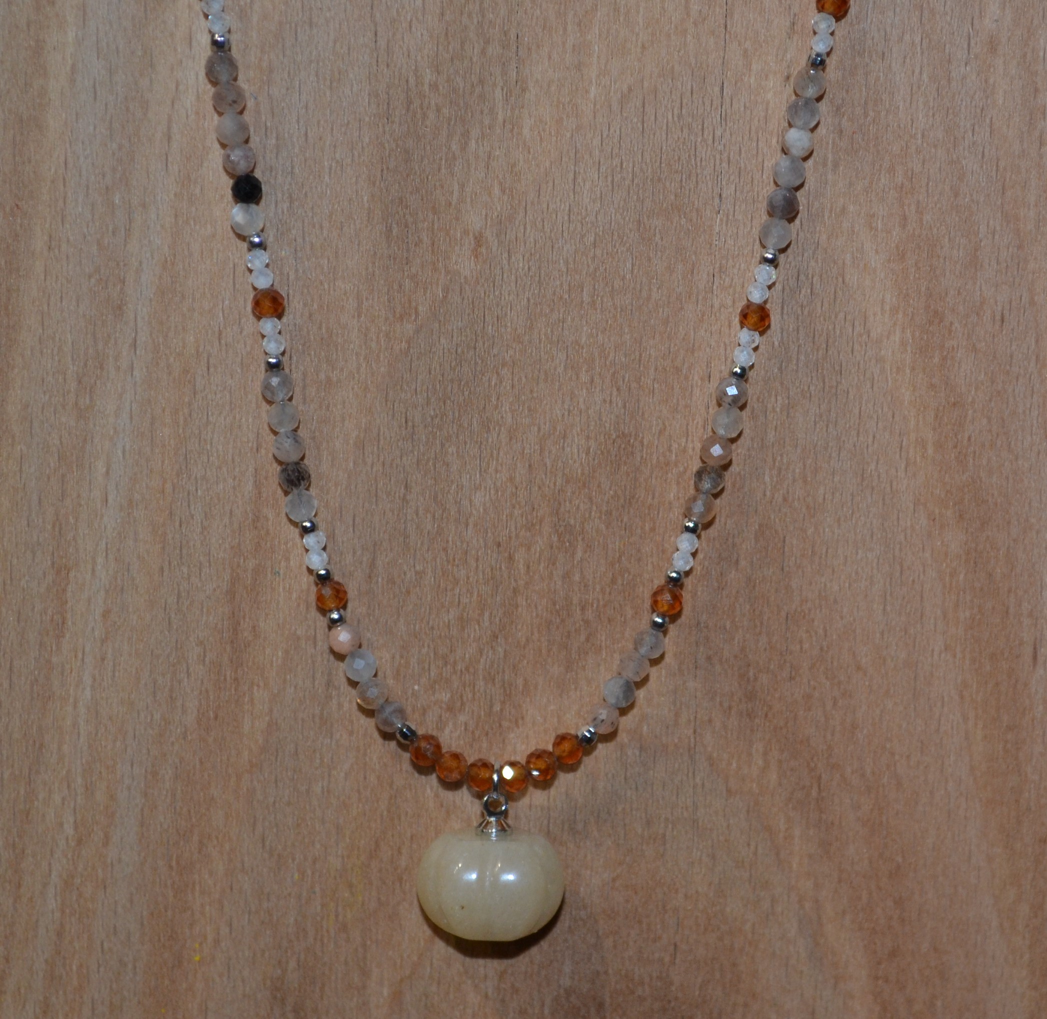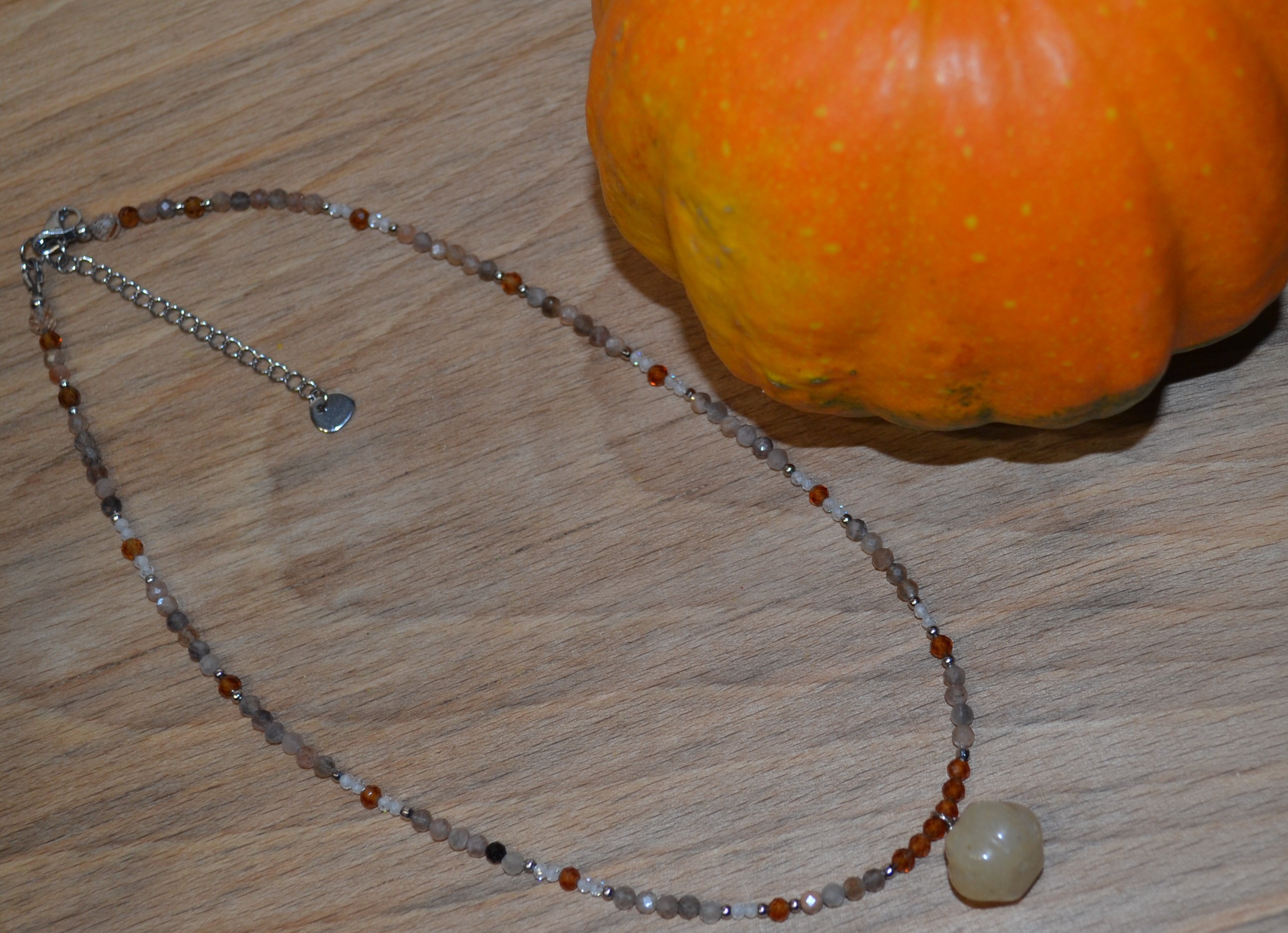 Ten piękny naszyjnik zrobiony przez nas z kamieni granatu , kamienia słonecznego i białej cyrkonii, zakuty został na drucie jubilerskim ze stali chirurgicznej. Dodatki oraz zapięcie w srebrnym kolorze wykonaliśmy zestali chirurgicznej. W centrum naszyjnika umieściliśmy wisiorek w kształcie dyni wykonany z jadeitu 1,5cm / 1,5 cm