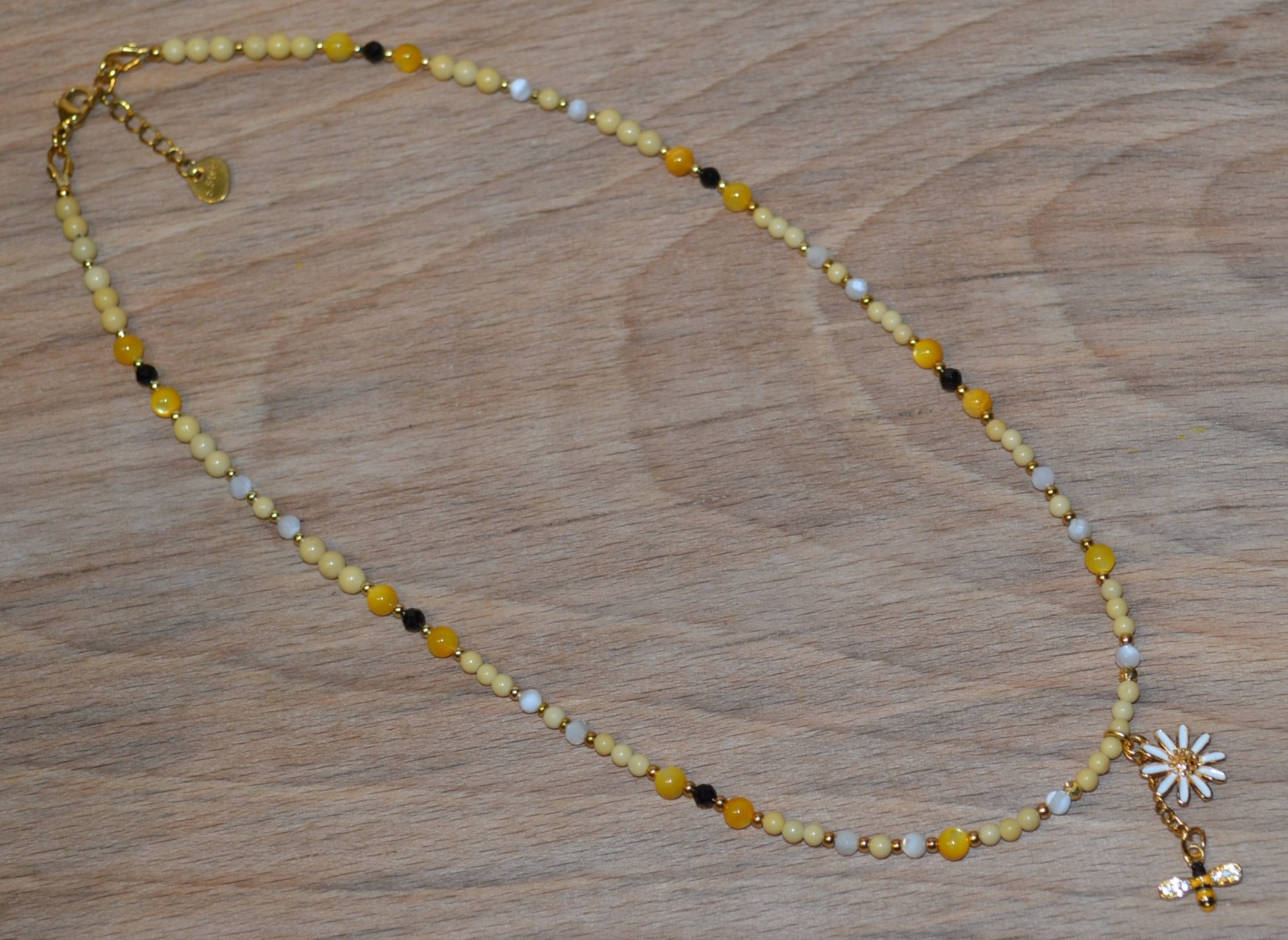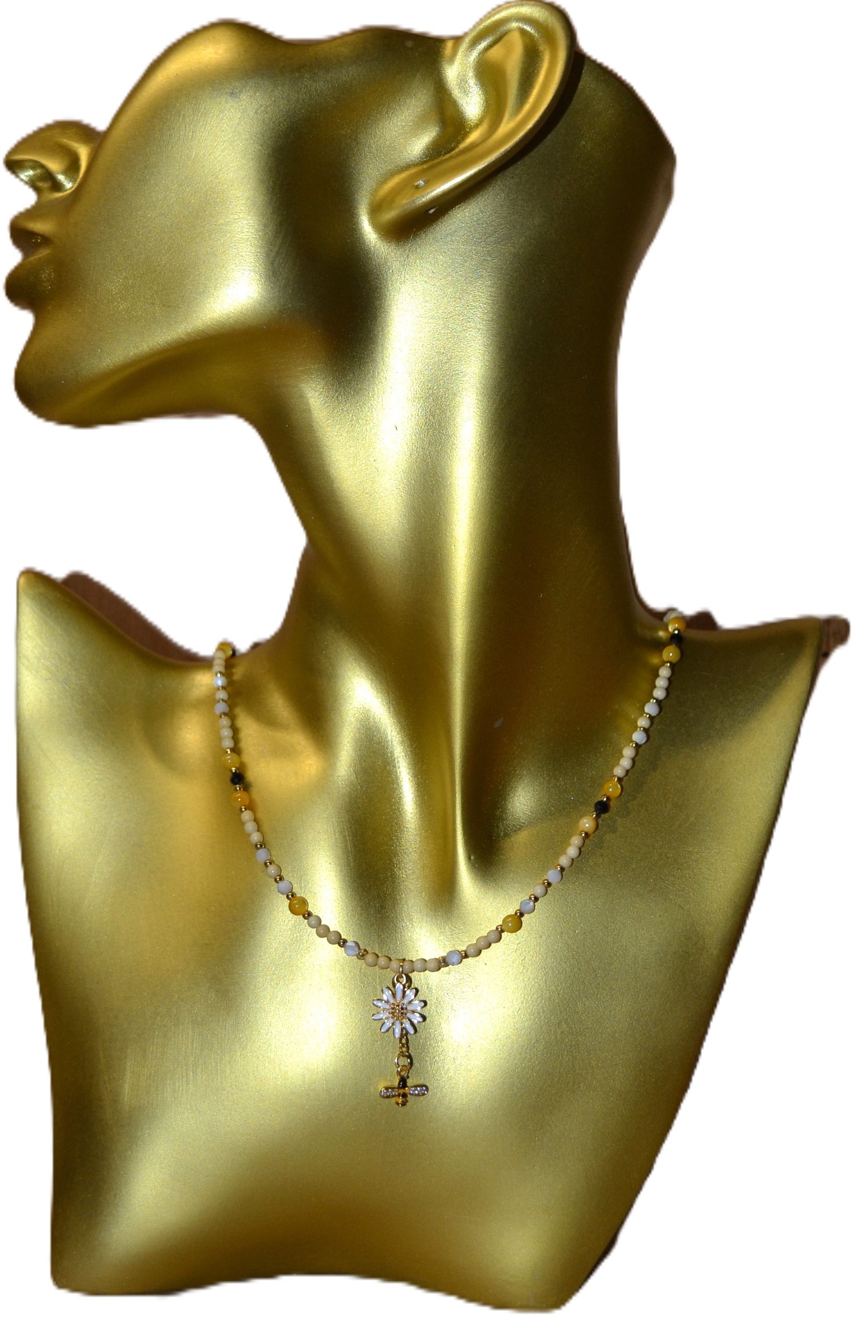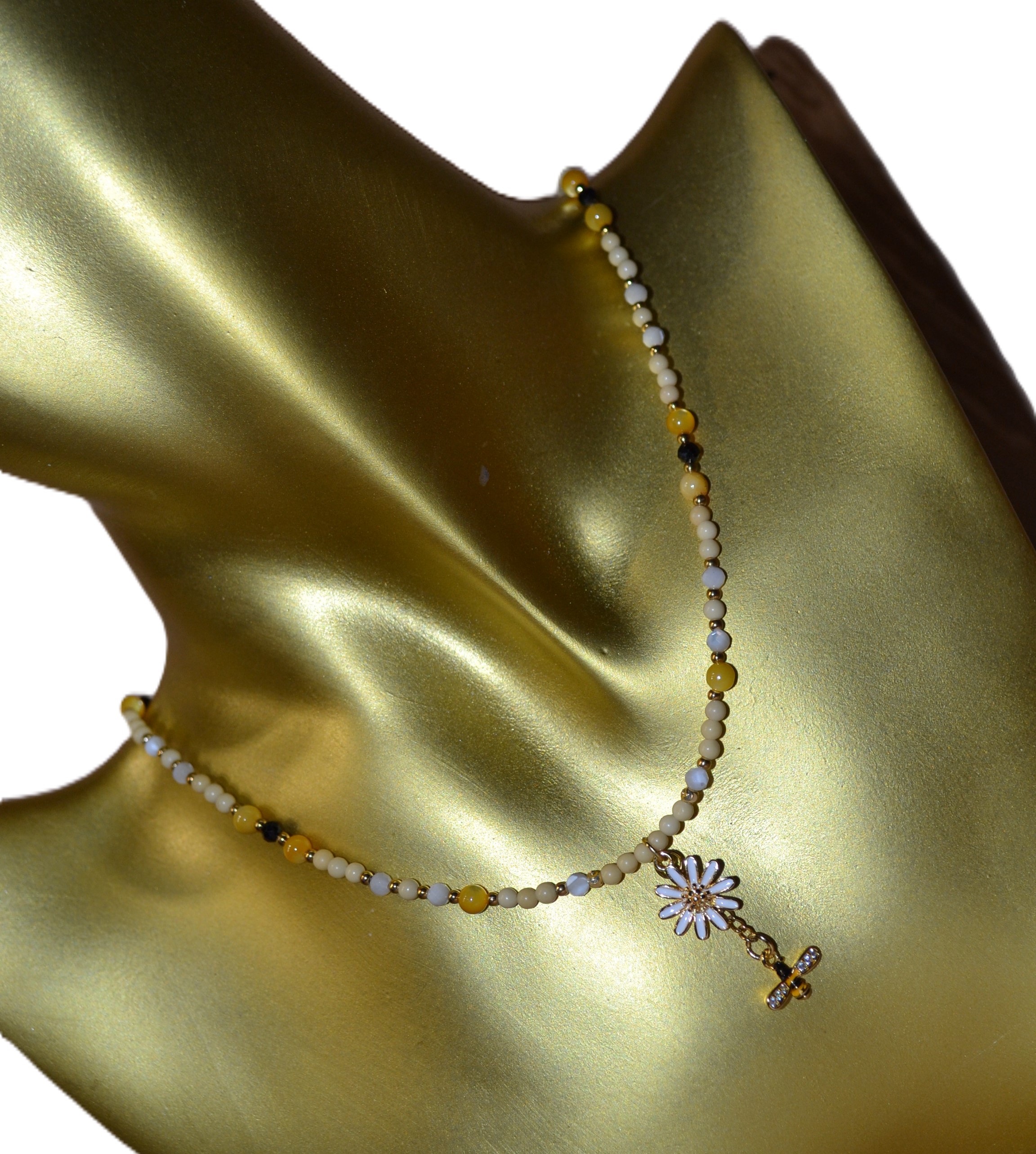 Ten piękny naszyjnik zrobiony przez nas z jadeitu , czarnego turmalinu i masy perłowej został zakuty na drucie jubilerskim ze stali chirurgicznej. Dodatki oraz zapięcie w złotym kolorze wykonaliśmy zestali chirurgicznej. W centrum naszyjnika umieściliśmy wisiorek w kształcie kwiatu 1,5 cm / 1,5 cm