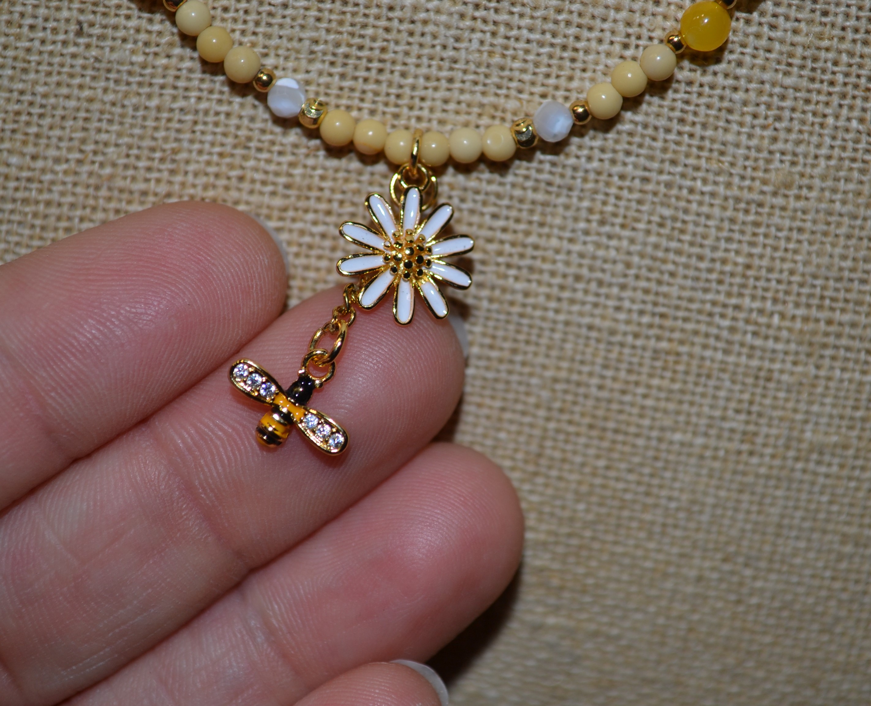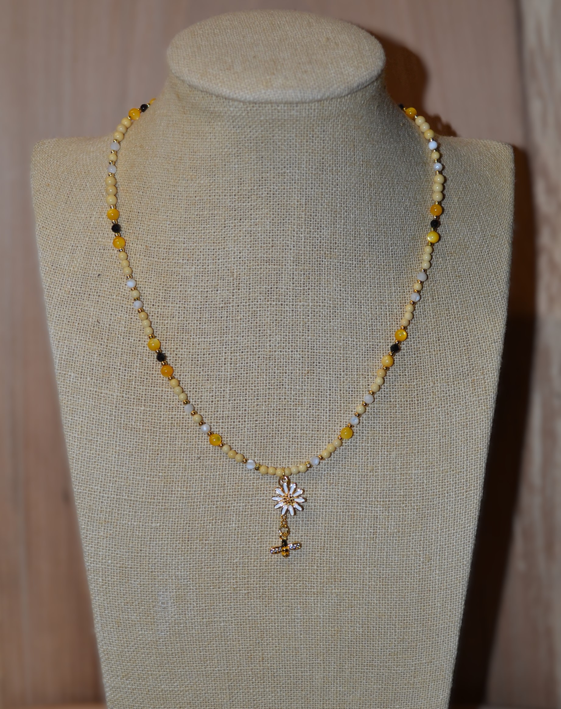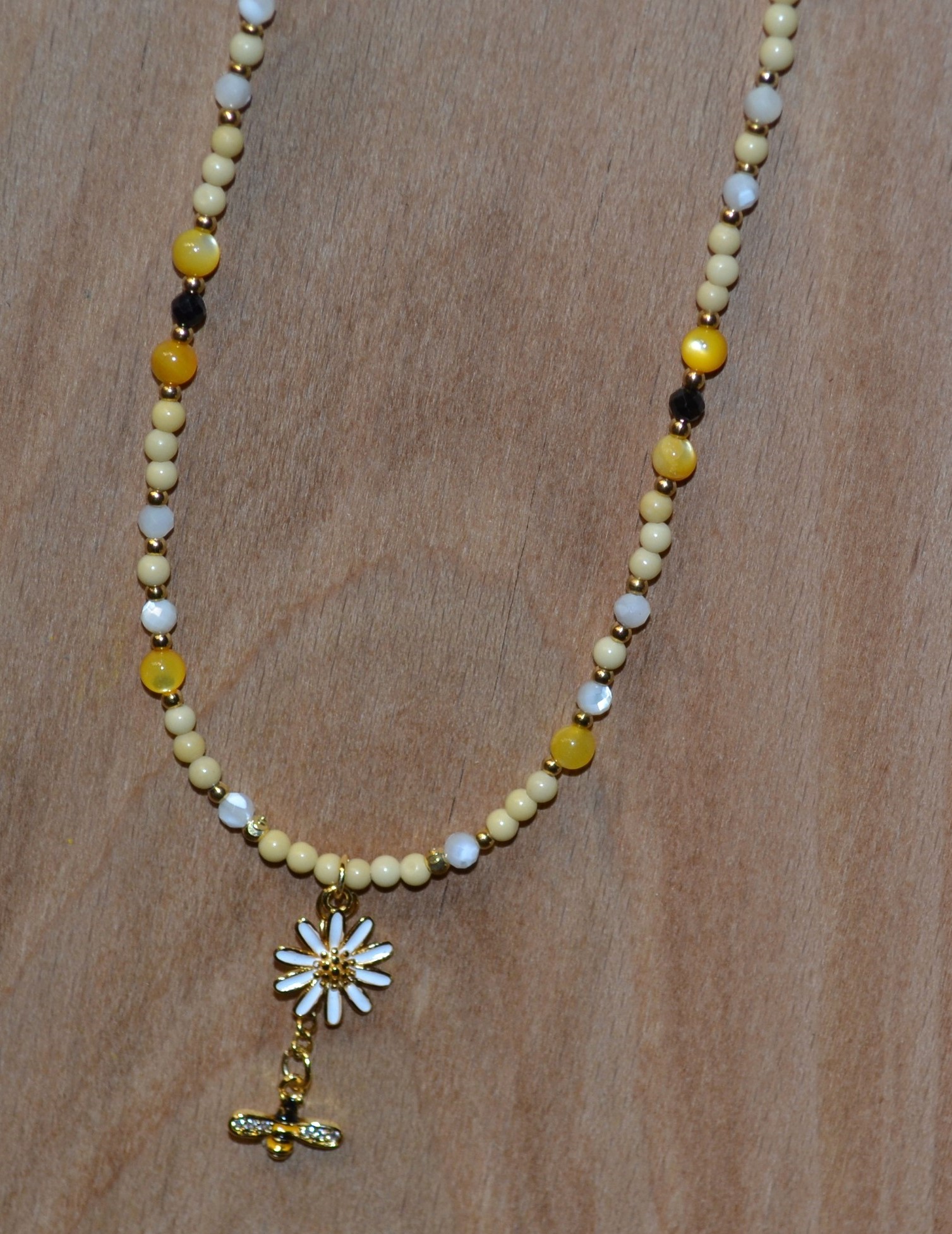 Ten piękny naszyjnik zrobiony przez nas z jadeitu , czarnego turmalinu i masy perłowej został zakuty na drucie jubilerskim ze stali chirurgicznej. Dodatki oraz zapięcie w złotym kolorze wykonaliśmy zestali chirurgicznej. W centrum naszyjnika umieściliśmy wisiorek w kształcie kwiatu 1,5 cm / 1,5 cm