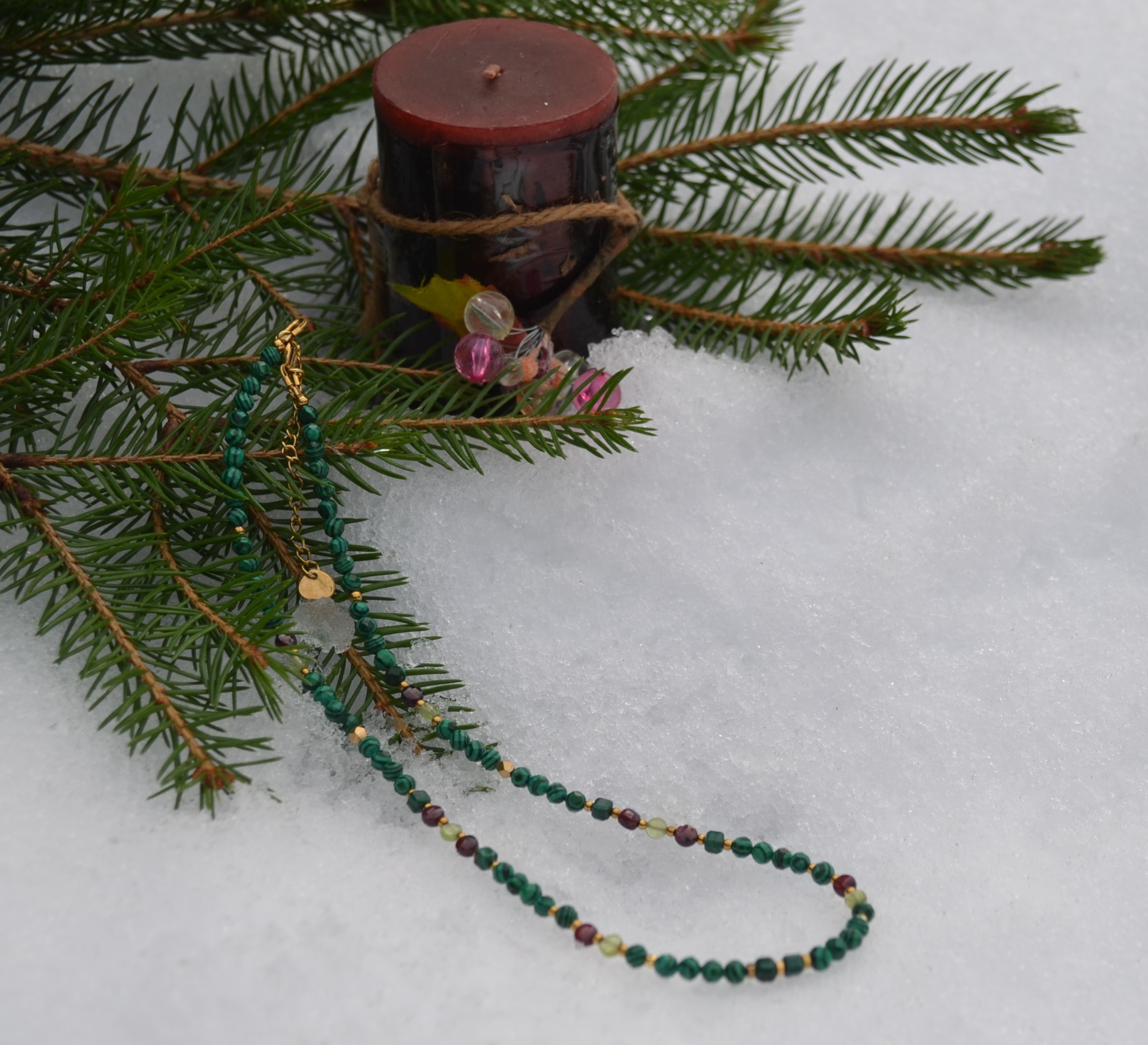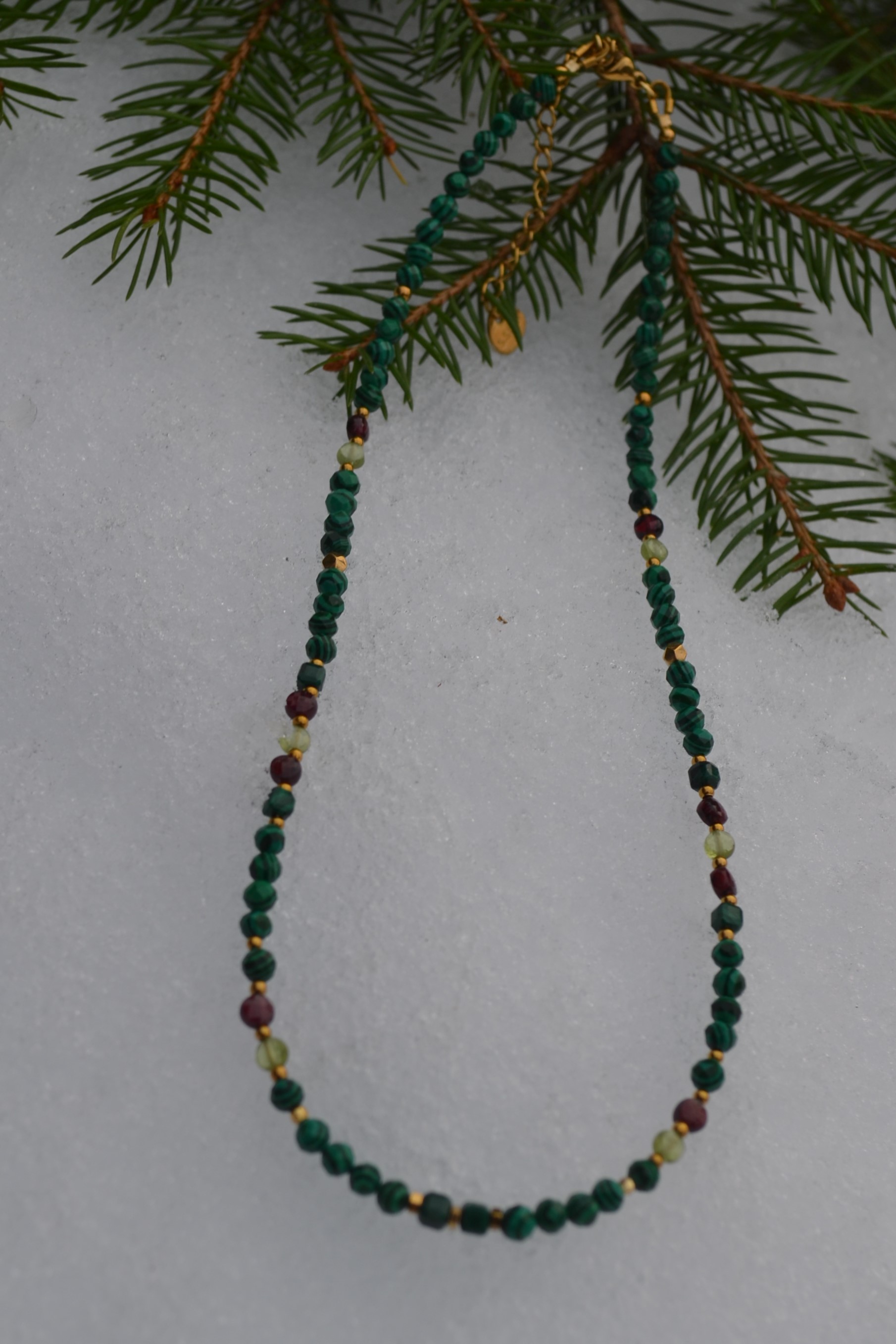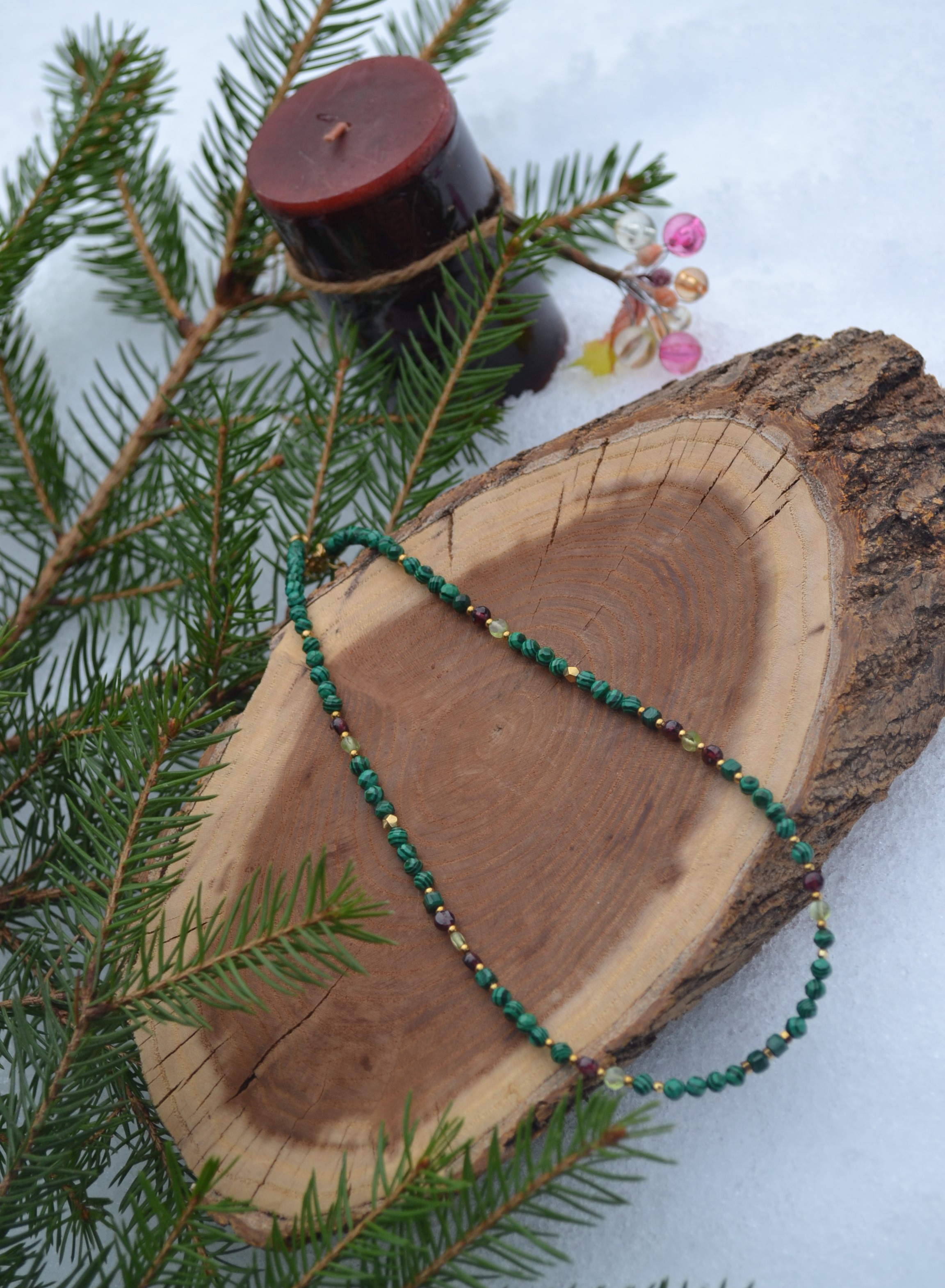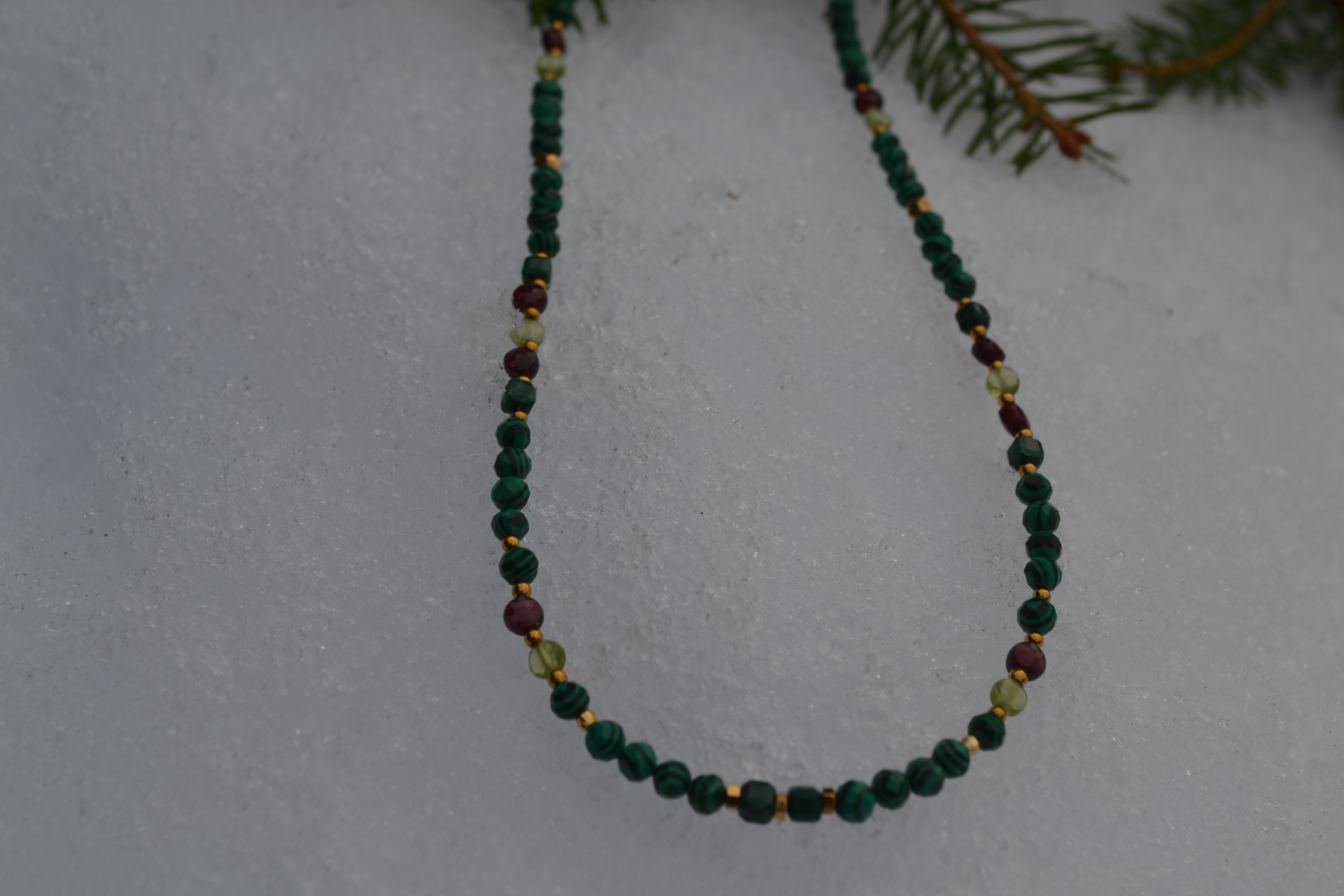 Ten piękny naszyjnik zrobiony przez nas z kamienia MALACHITU,PERIODYTU I GRANATU zakuty na drucie jubilerskim ze stali chirurgicznej. Dodatki oraz zapięcie w złotym kolorze wykonaliśmy zestali chirurgicznej.