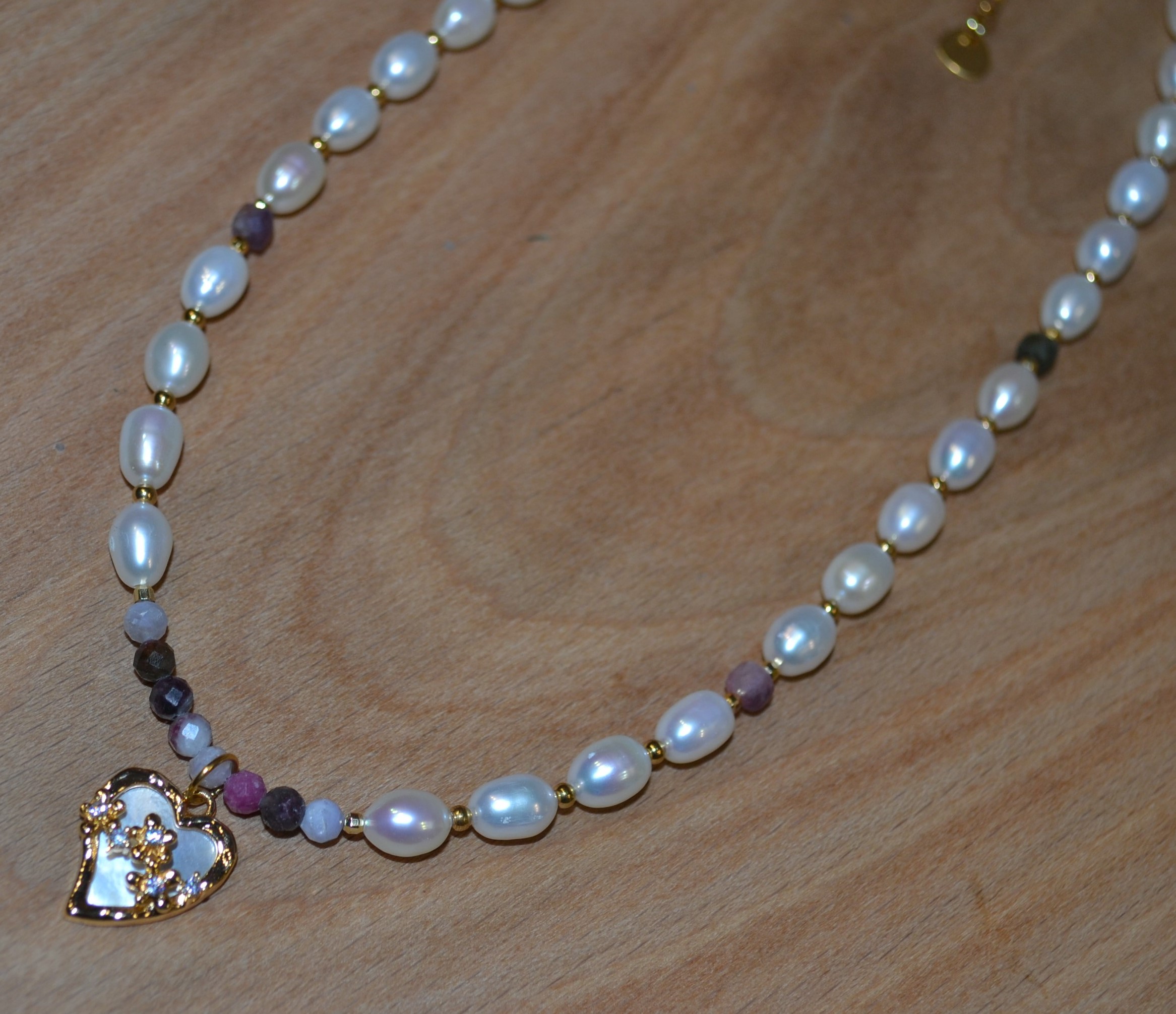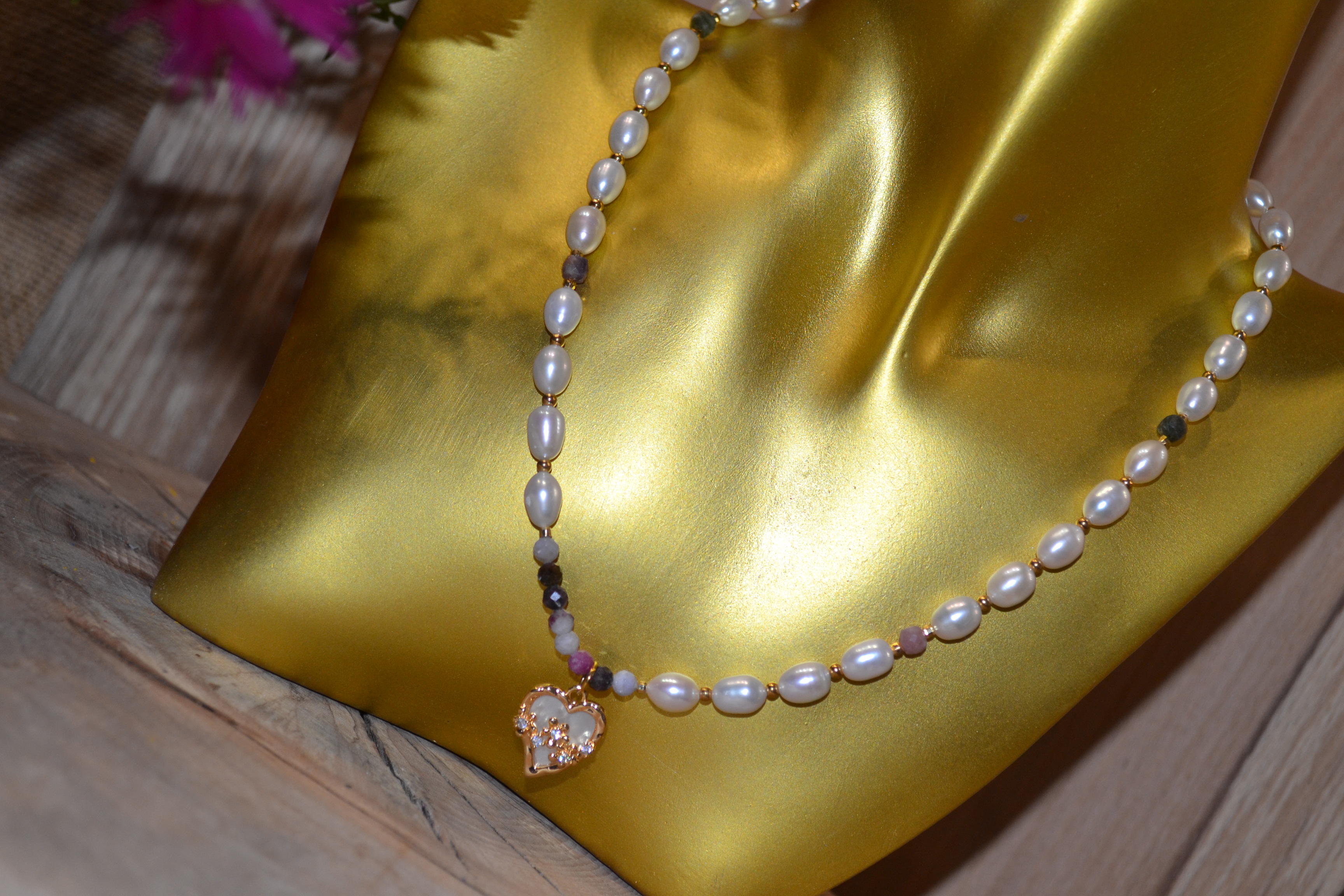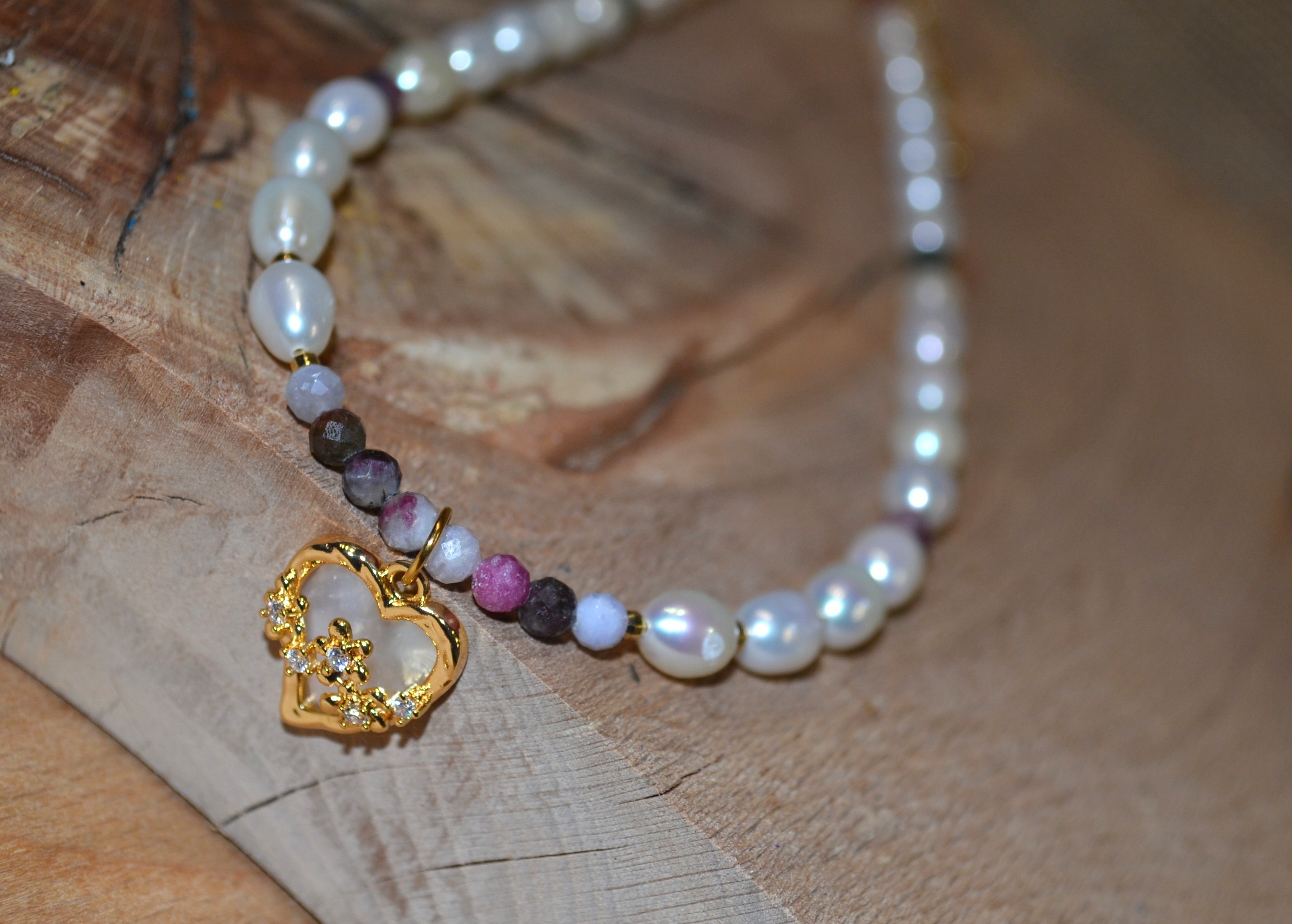 Ten piękny naszyjnik zrobiony przez nas z kamieni TURMALINU I PERŁA SŁODKOWODNA zakuty został na drucie jubilerskim ze stali chirurgicznej. Dodatki oraz zapięcie w złotym kolorze wykonaliśmy zestali chirurgicznej. W centrum naszyjnika umieściliśmy serce z cyrkoniami na masie perłowej .