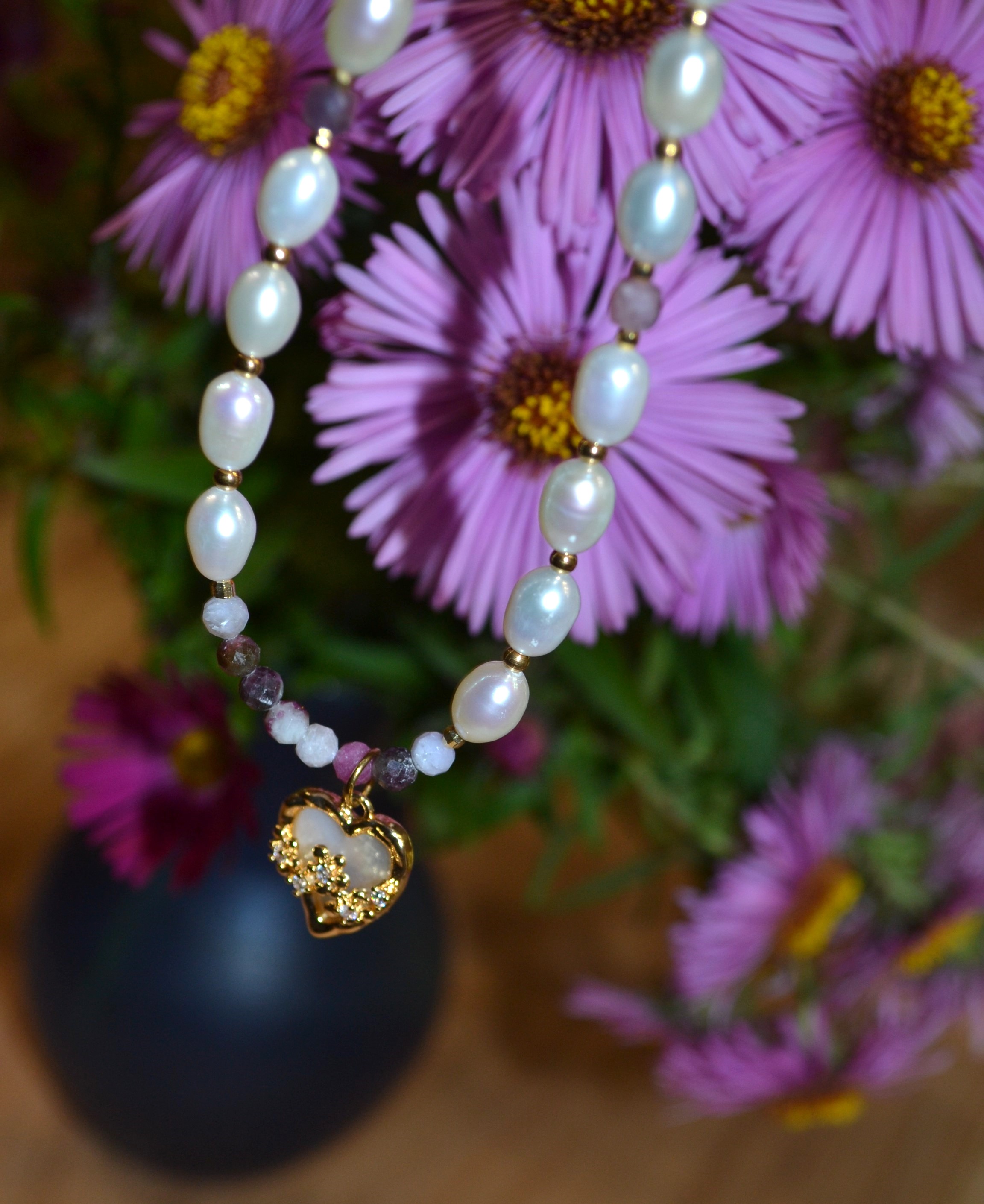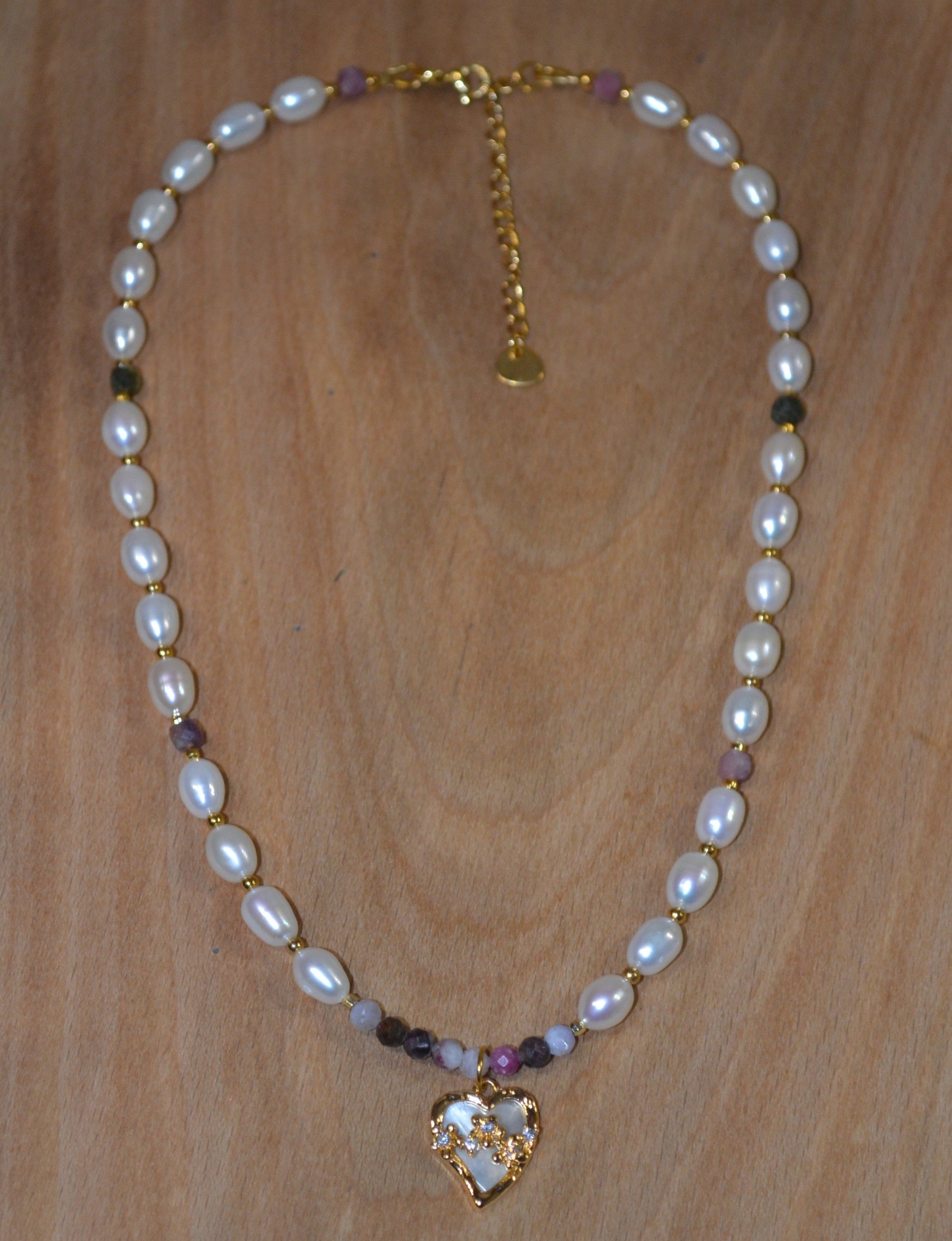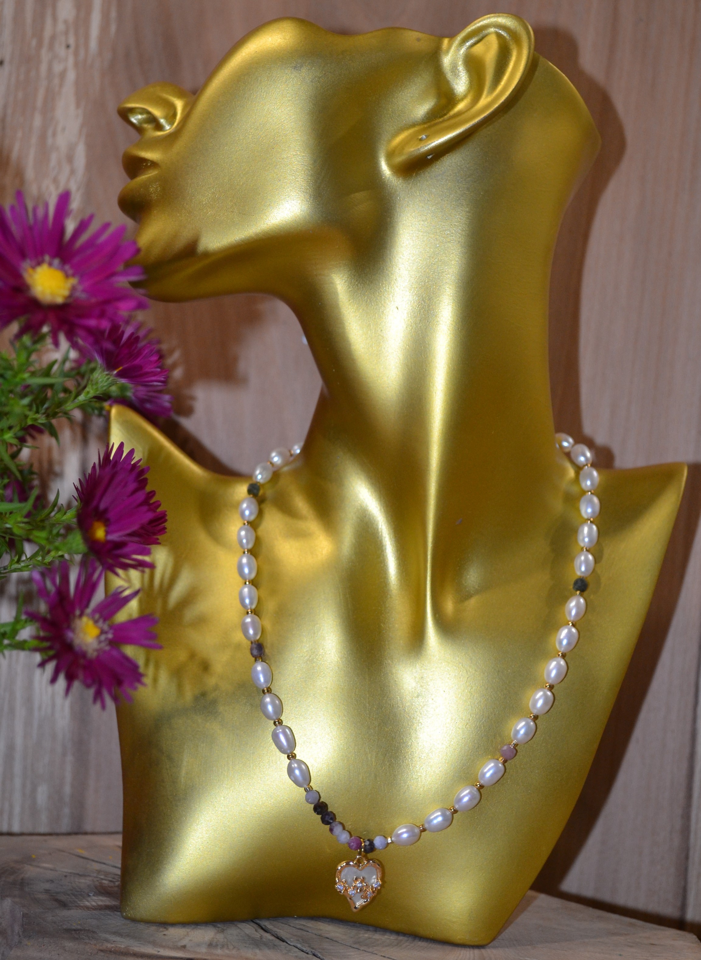 Ten piękny naszyjnik zrobiony przez nas z kamieni TURMALINU I PERŁA SŁODKOWODNA zakuty został na drucie jubilerskim ze stali chirurgicznej. Dodatki oraz zapięcie w złotym kolorze wykonaliśmy zestali chirurgicznej. W centrum naszyjnika umieściliśmy serce z cyrkoniami na masie perłowej .