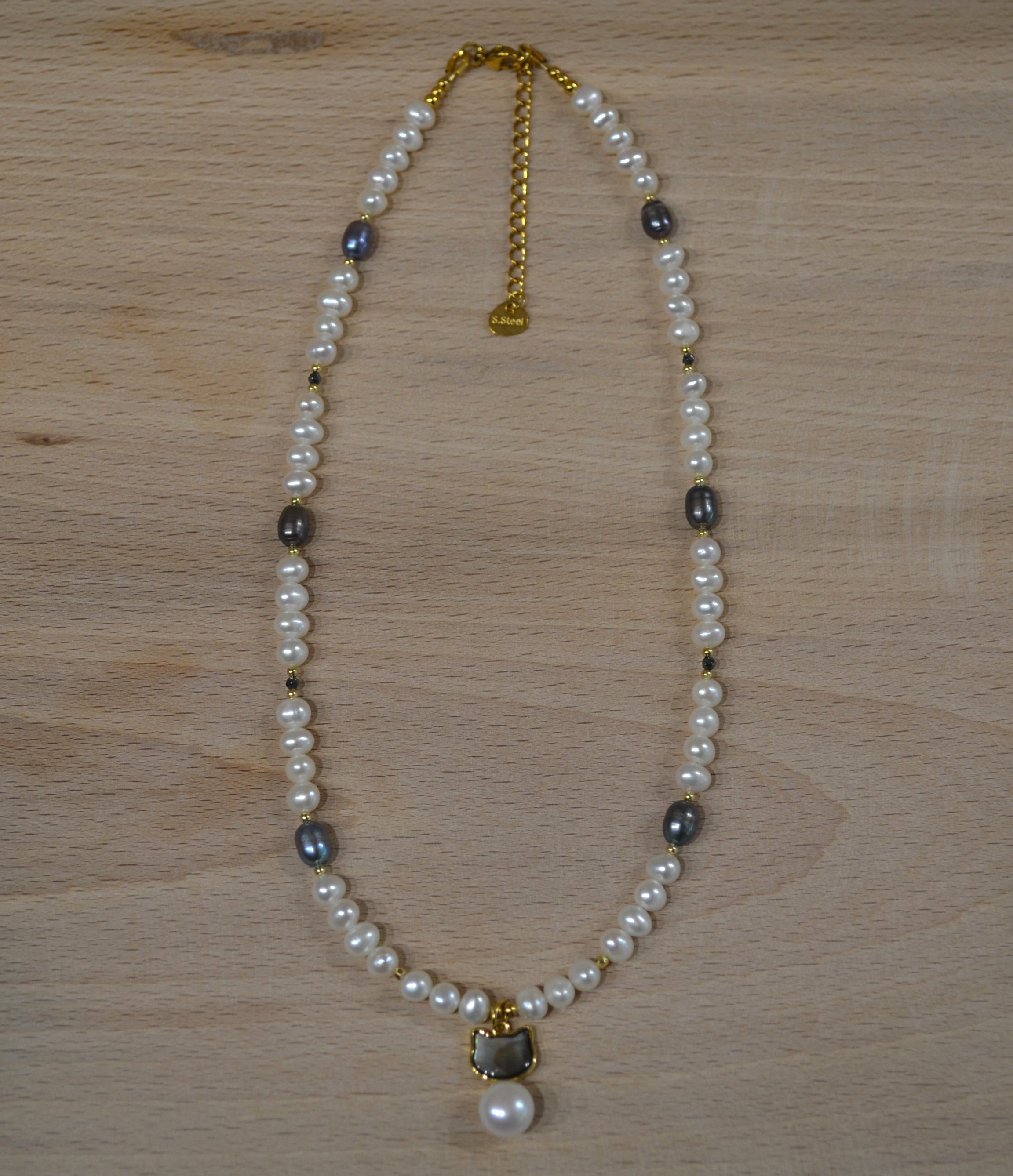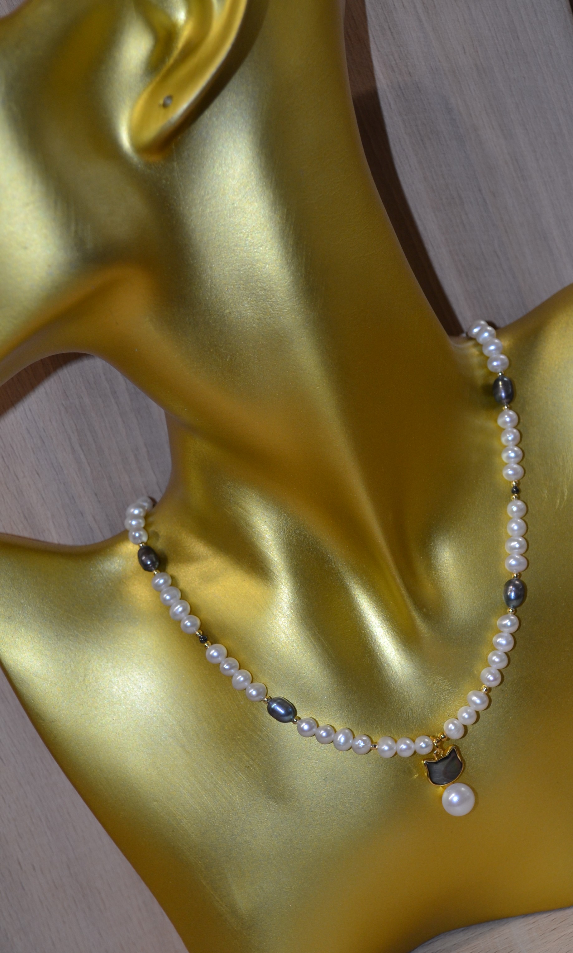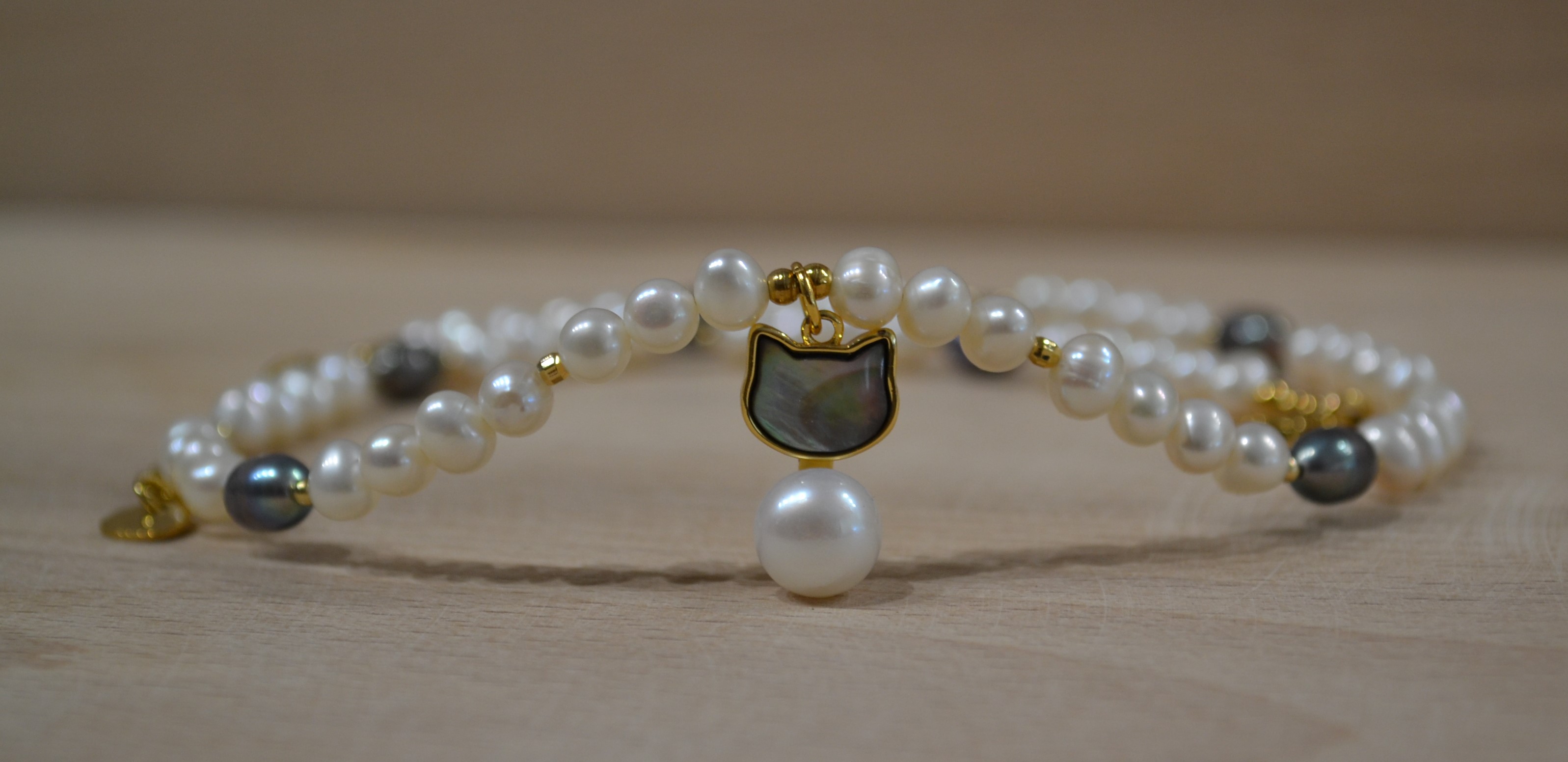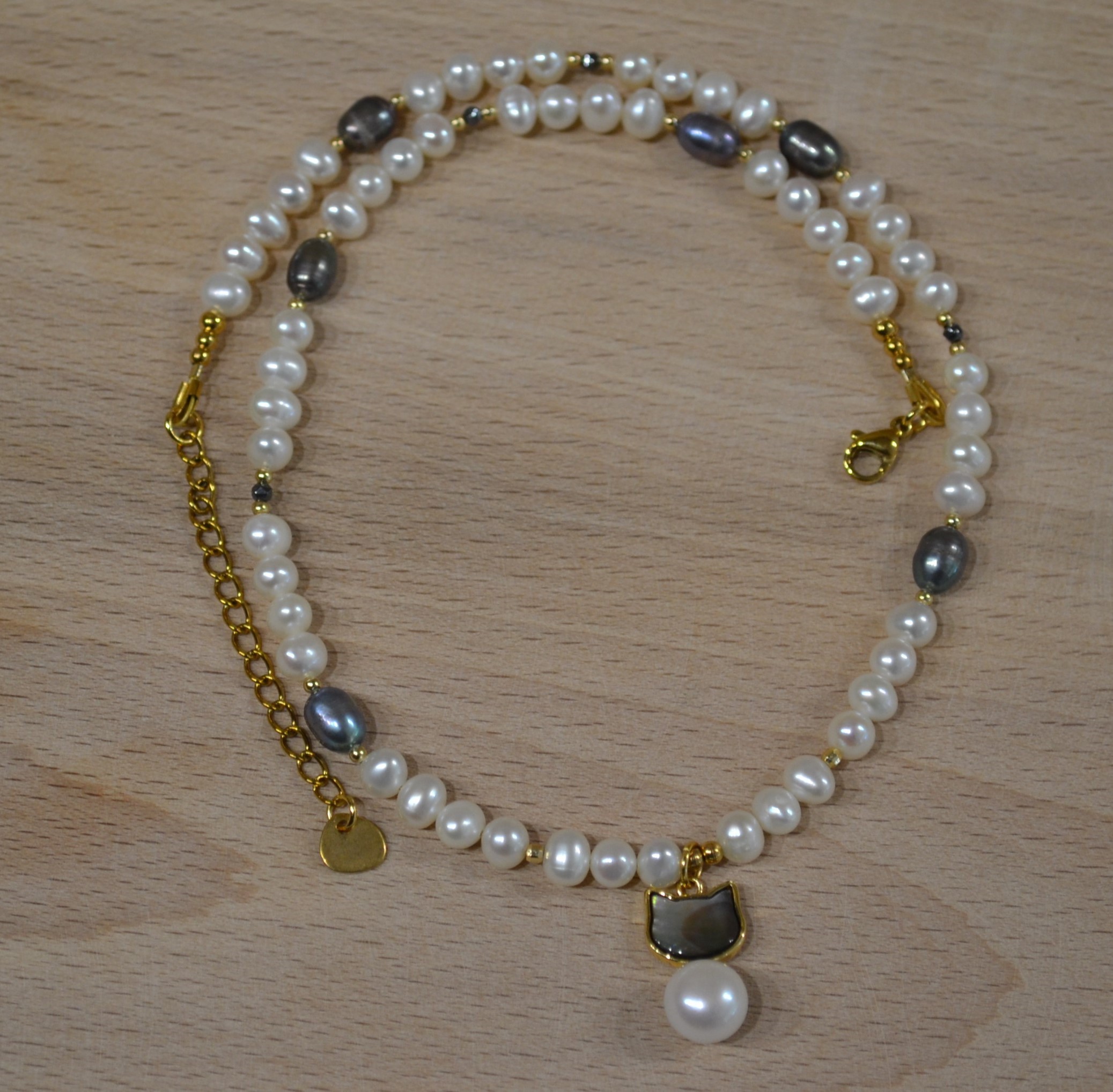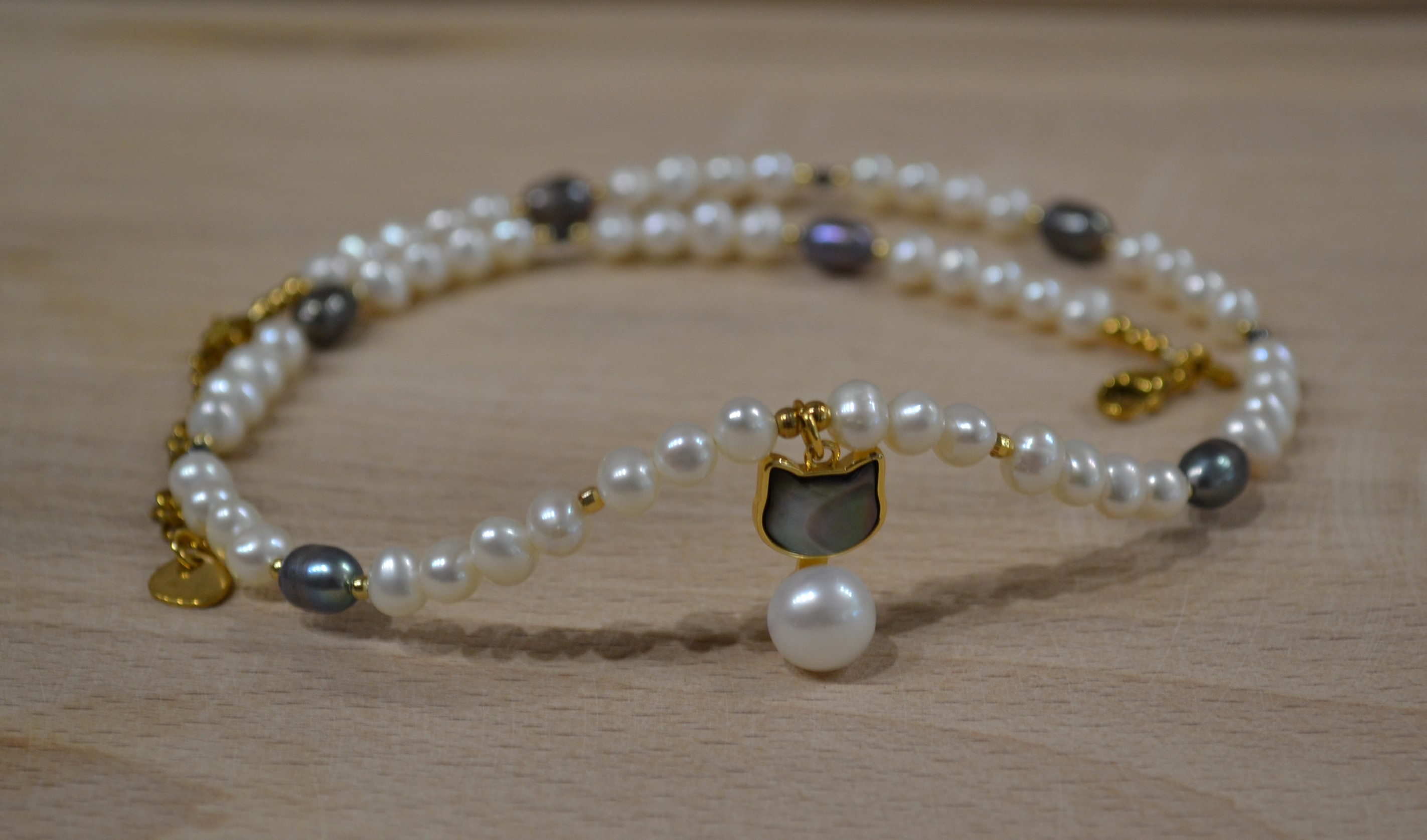Ten piękny naszyjnik zrobiony przez nas z pereł słodkowodnych zakuty został na drucie jubilerskim ze stali chirurgicznej. Dodatki oraz zapięcie w złotym kolorze wykonaliśmy zestali chirurgicznej. W centrum naszyjnika umieściliśmy wisiorek w kształcie kota z perły i masy perłowej .