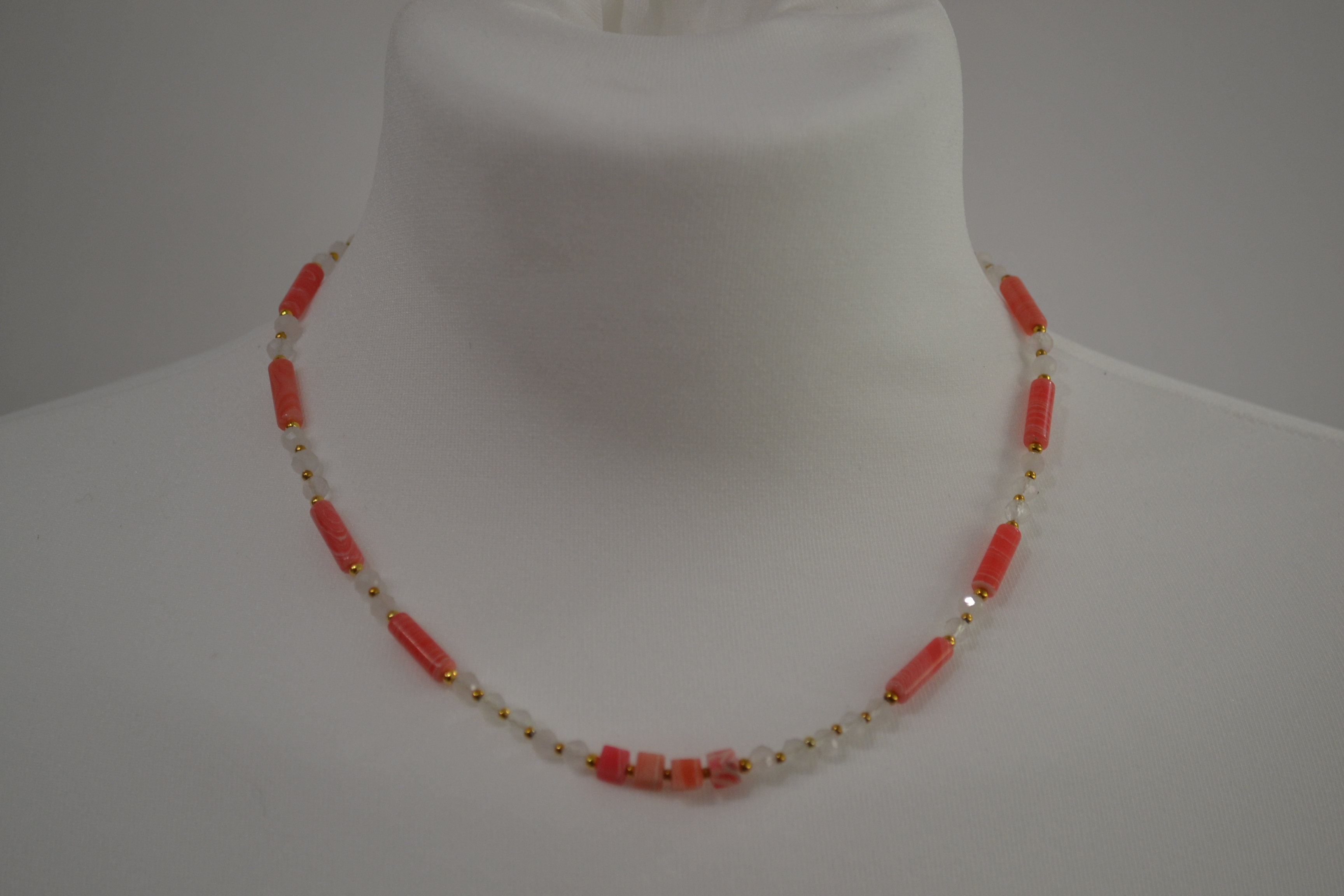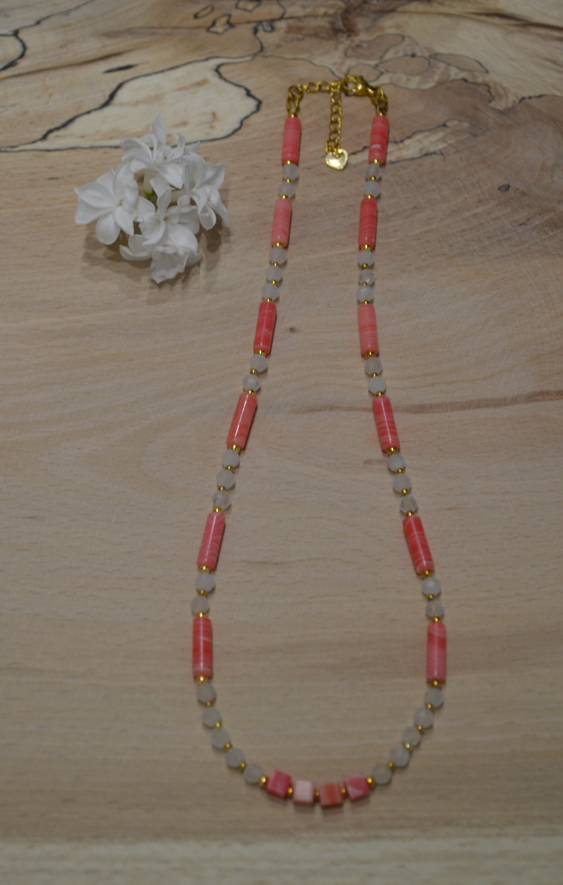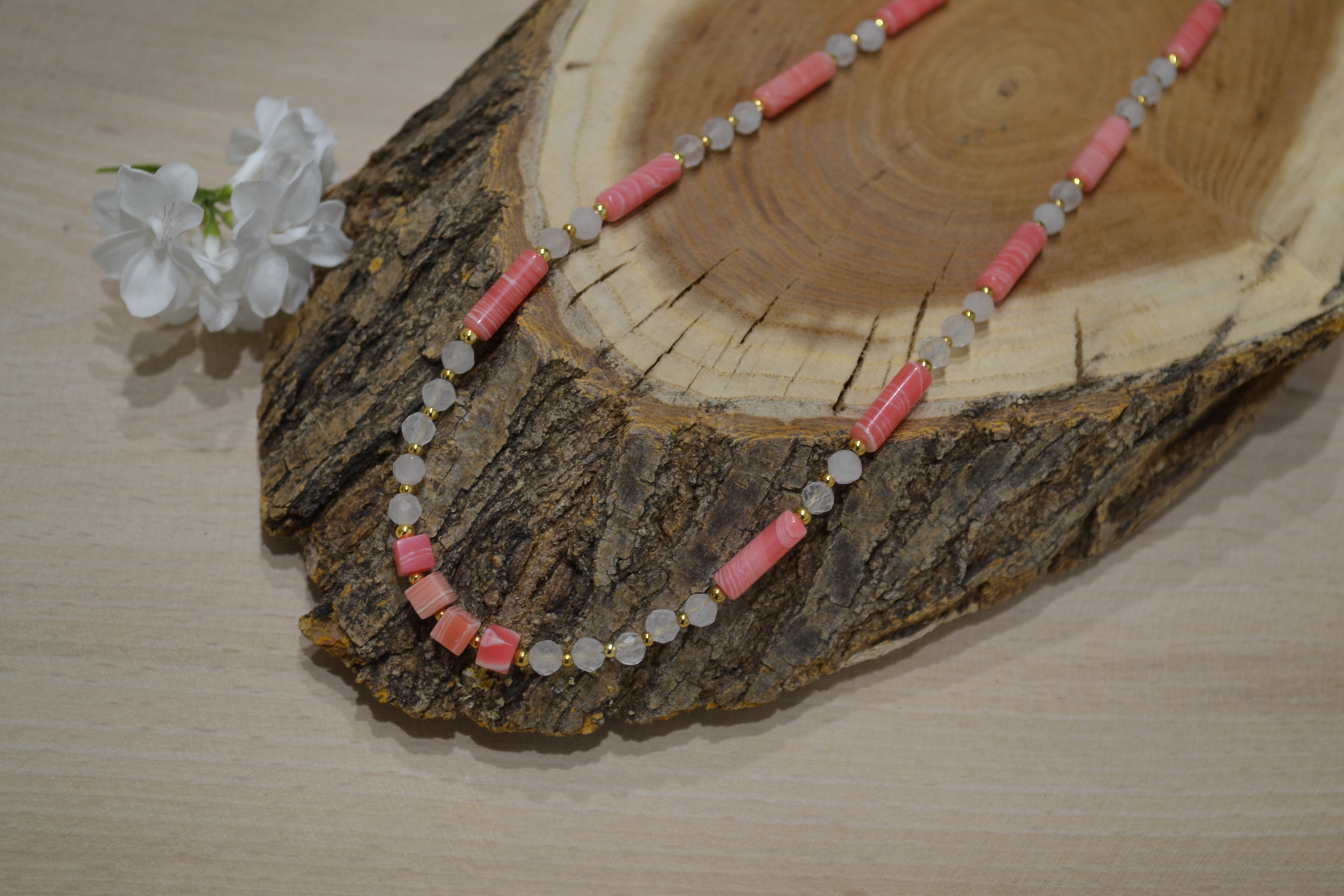 Ten piękny naszyjnik zrobiony przez nas z kamienia RODOCHRYZOT I KWARCU RÓZOWEGO zakuty na drucie jubilerskim ze stali chirurgicznej. Dodatki oraz zapięcie w złotym kolorze wykonaliśmy zestali chirurgicznej.