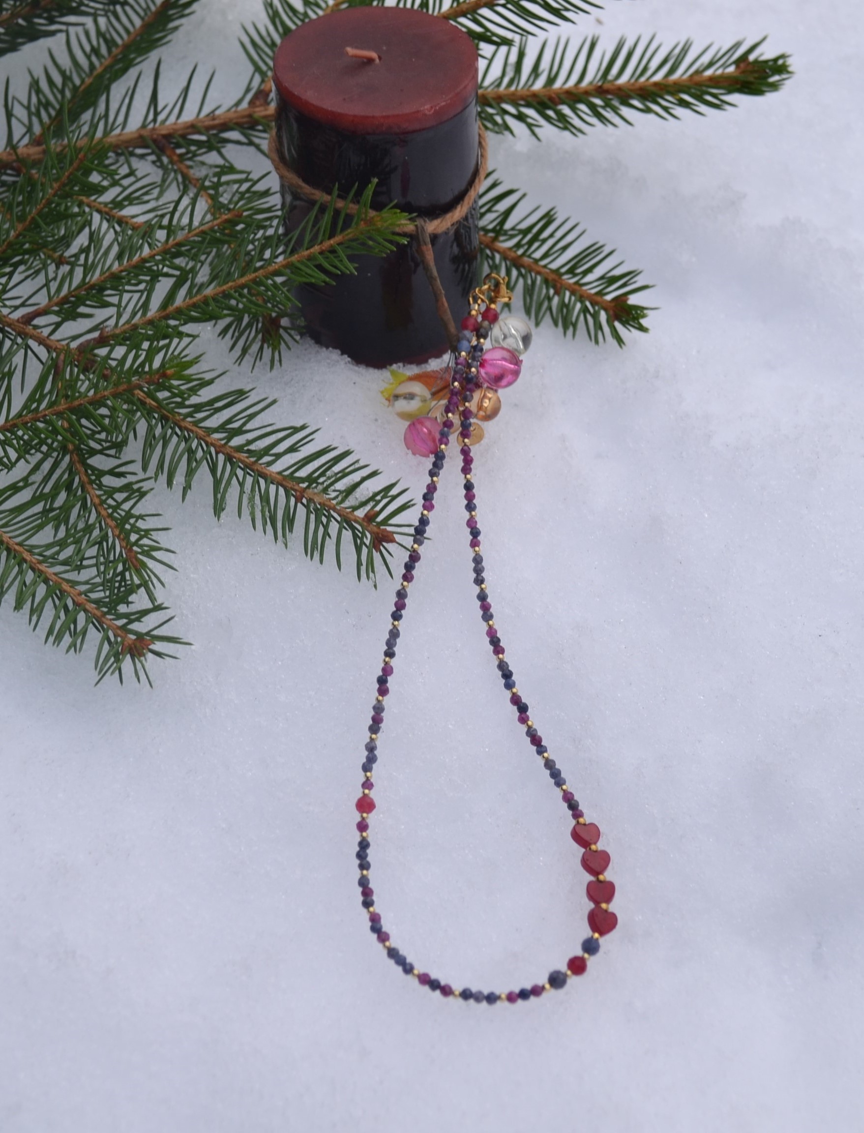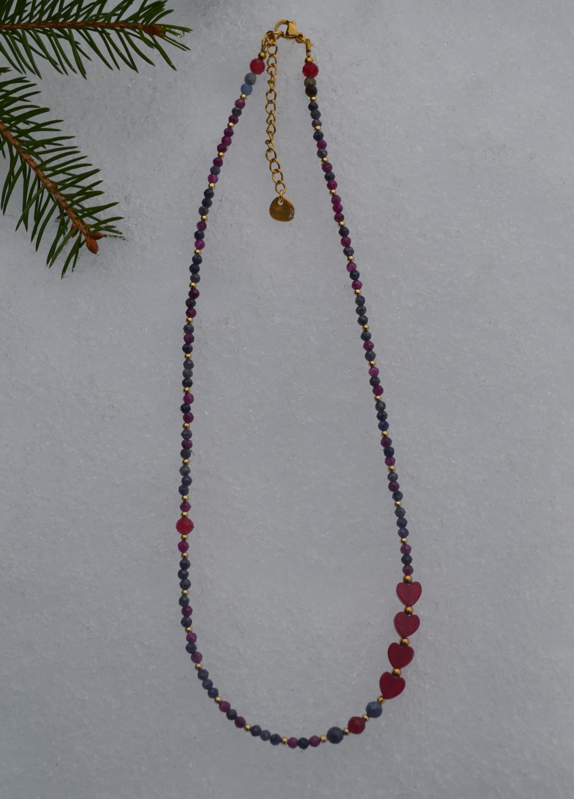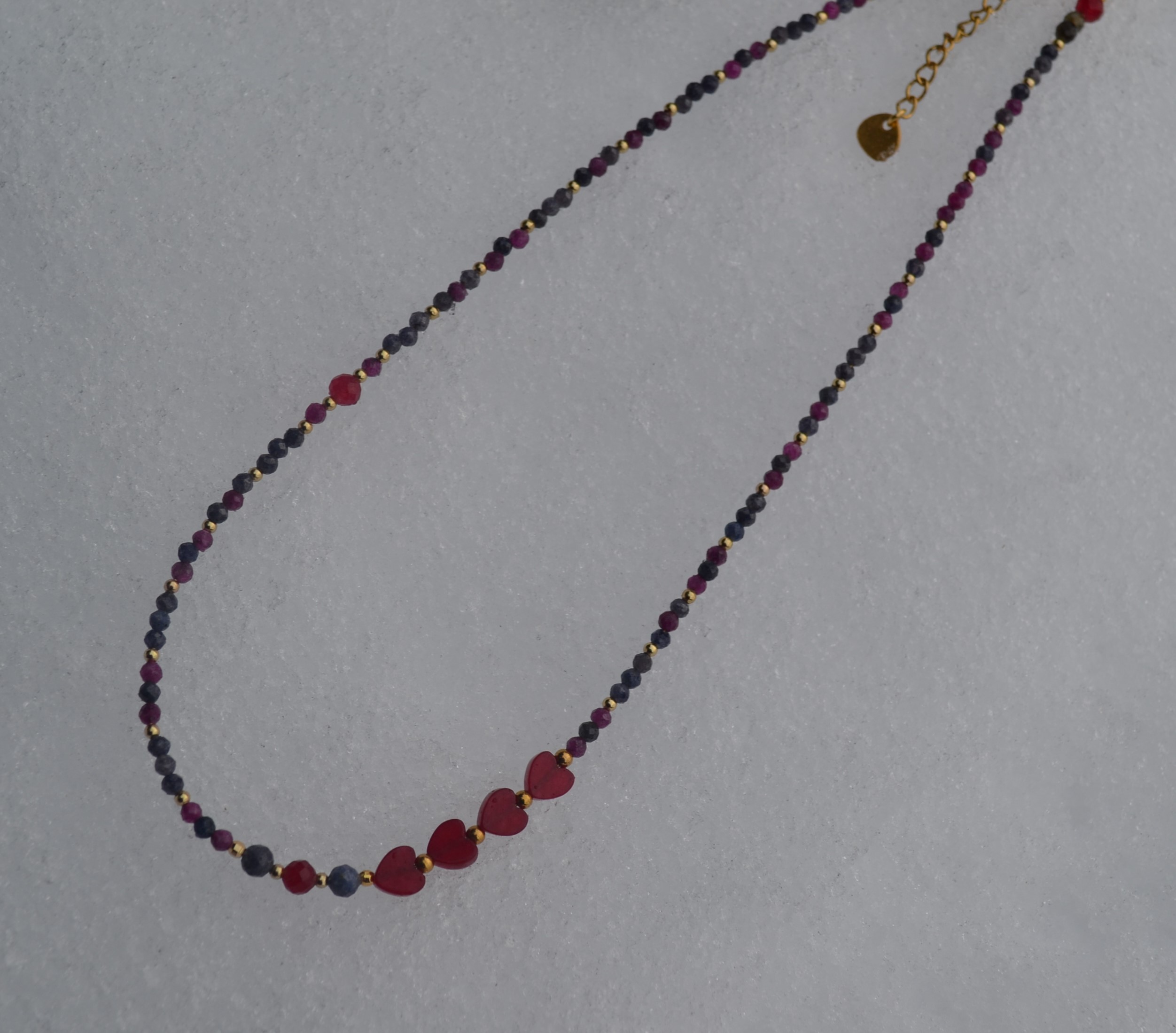 Ten piękny naszyjnik zrobiony przez nas z kamienia SZAFIRU I GRANATU zakuty na drucie jubilerskim ze stali chirurgicznej. Dodatki oraz zapięcie w złotym kolorze wykonaliśmy zestali chirurgicznej. W centralnej części umieściliśmy cztery serca wykonane z kamienia CHALCEDONU o średnicy 6 mm .