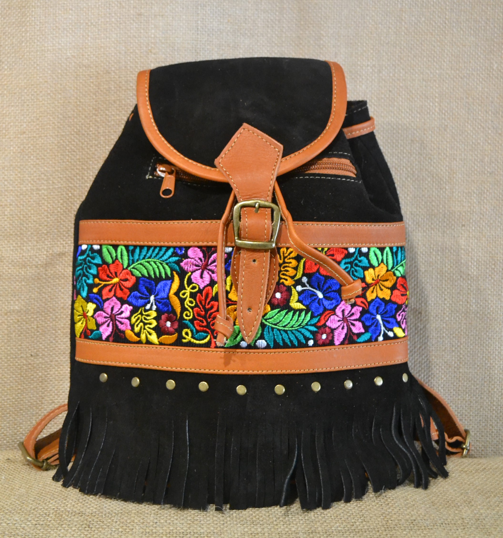 Strona główna » Wyroby ze skóry » Plecak damski boho ze skóry zamszowej w kolorze czarnym z kolorowym kwiatowym haftem.