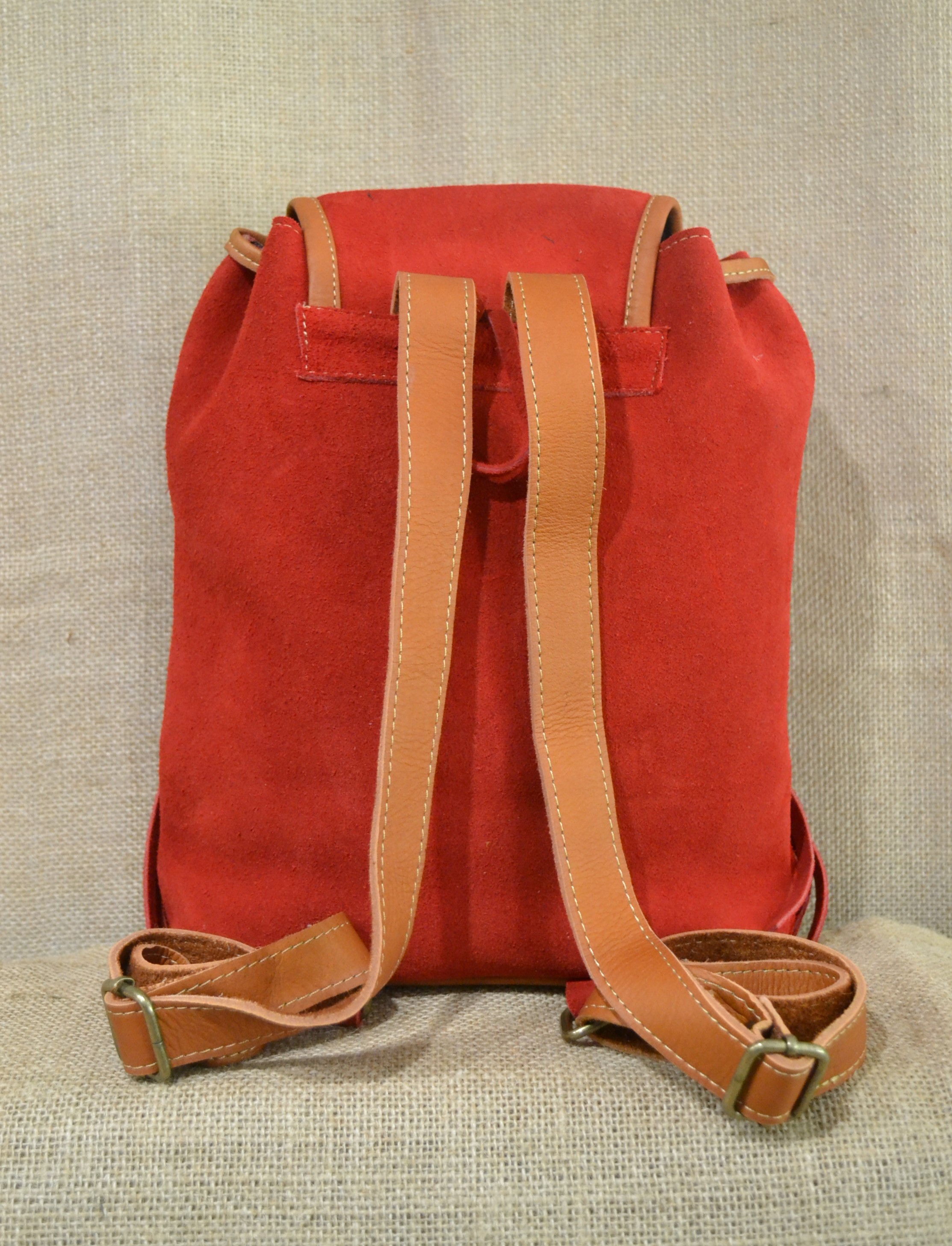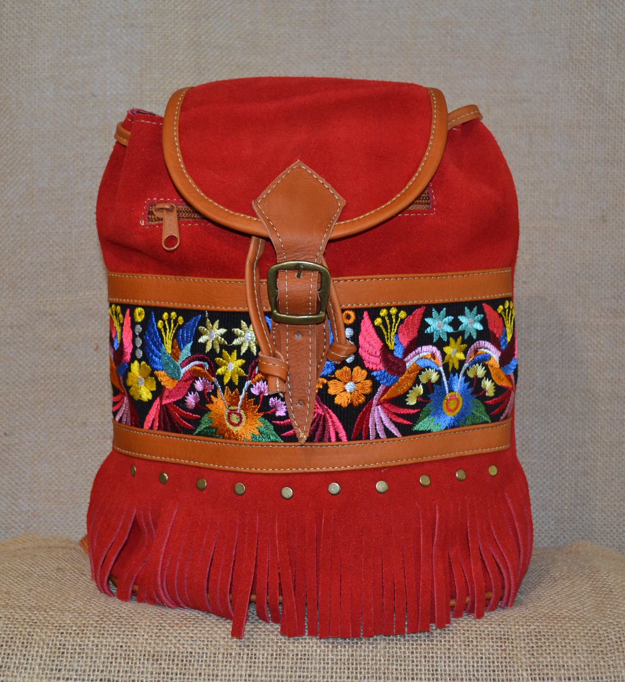 Strona główna » Wyroby ze skóry » Plecak damski boho ze skóry zamszowej w kolorze czerwonym z kolorowym kwiatowym haftem.