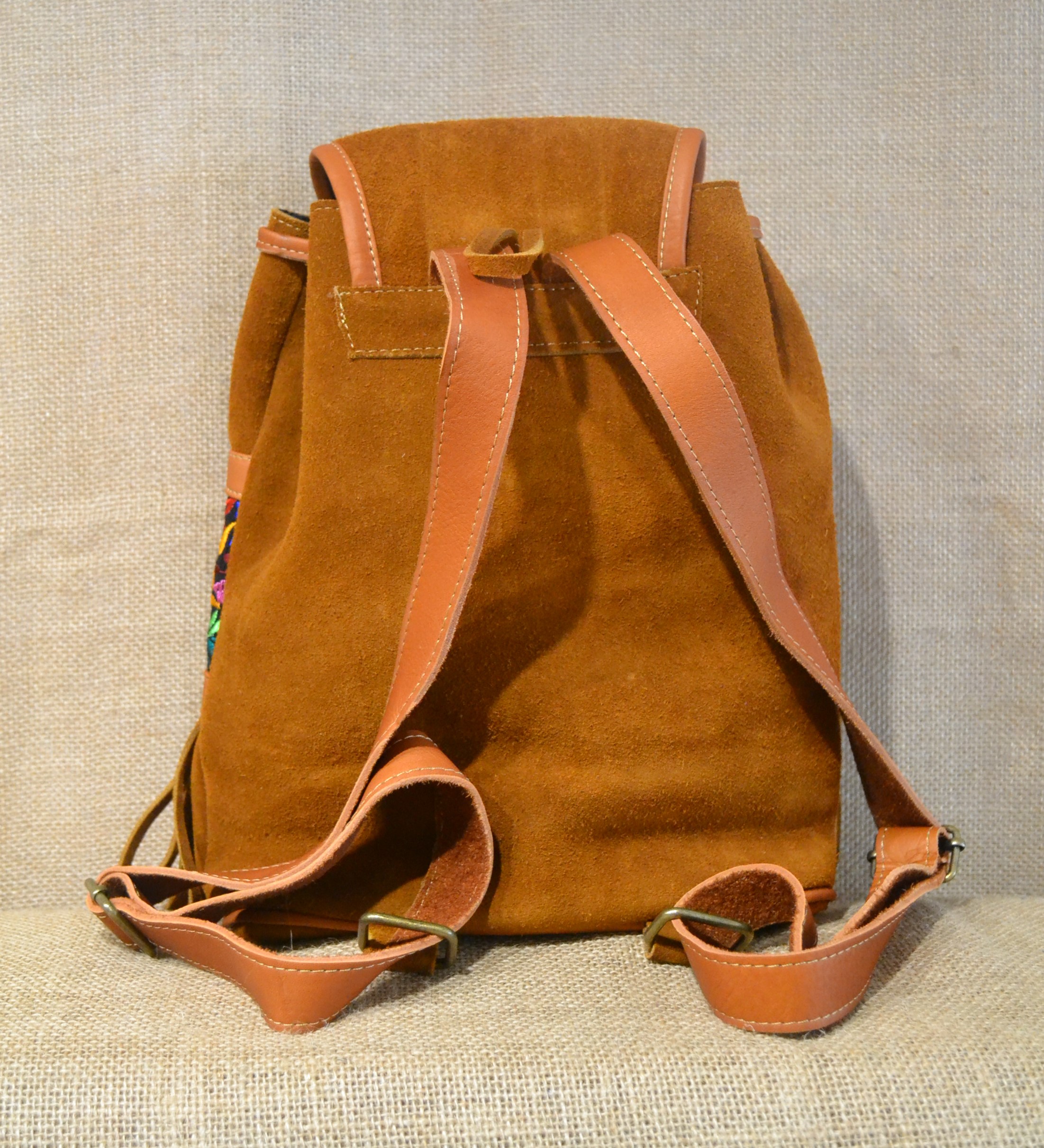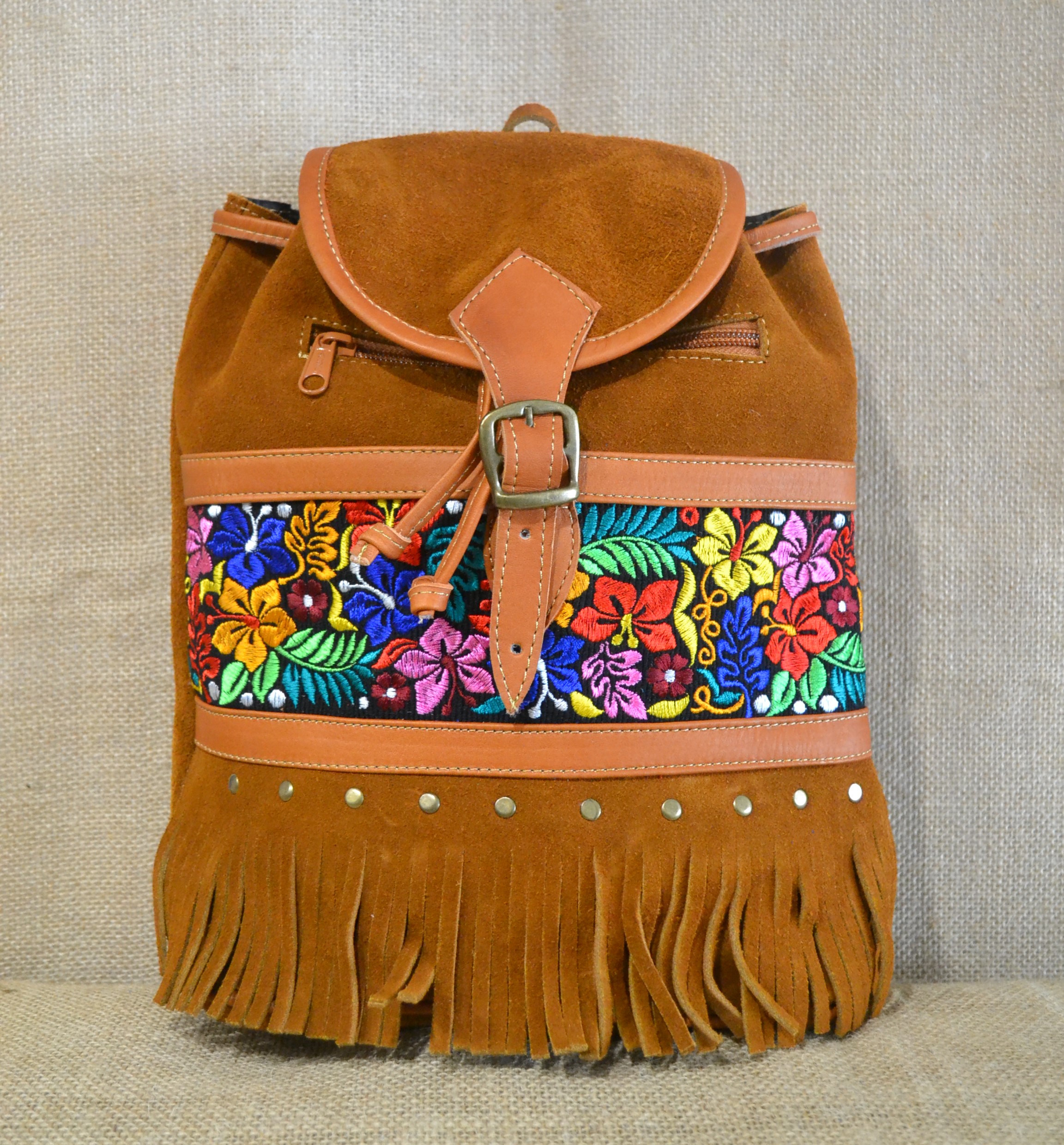 Strona główna » Wyroby ze skóry » Plecak damski boho ze skóry zamszowej w kolorze jasnobrązowym z kolorowym kwiatowym haftem.