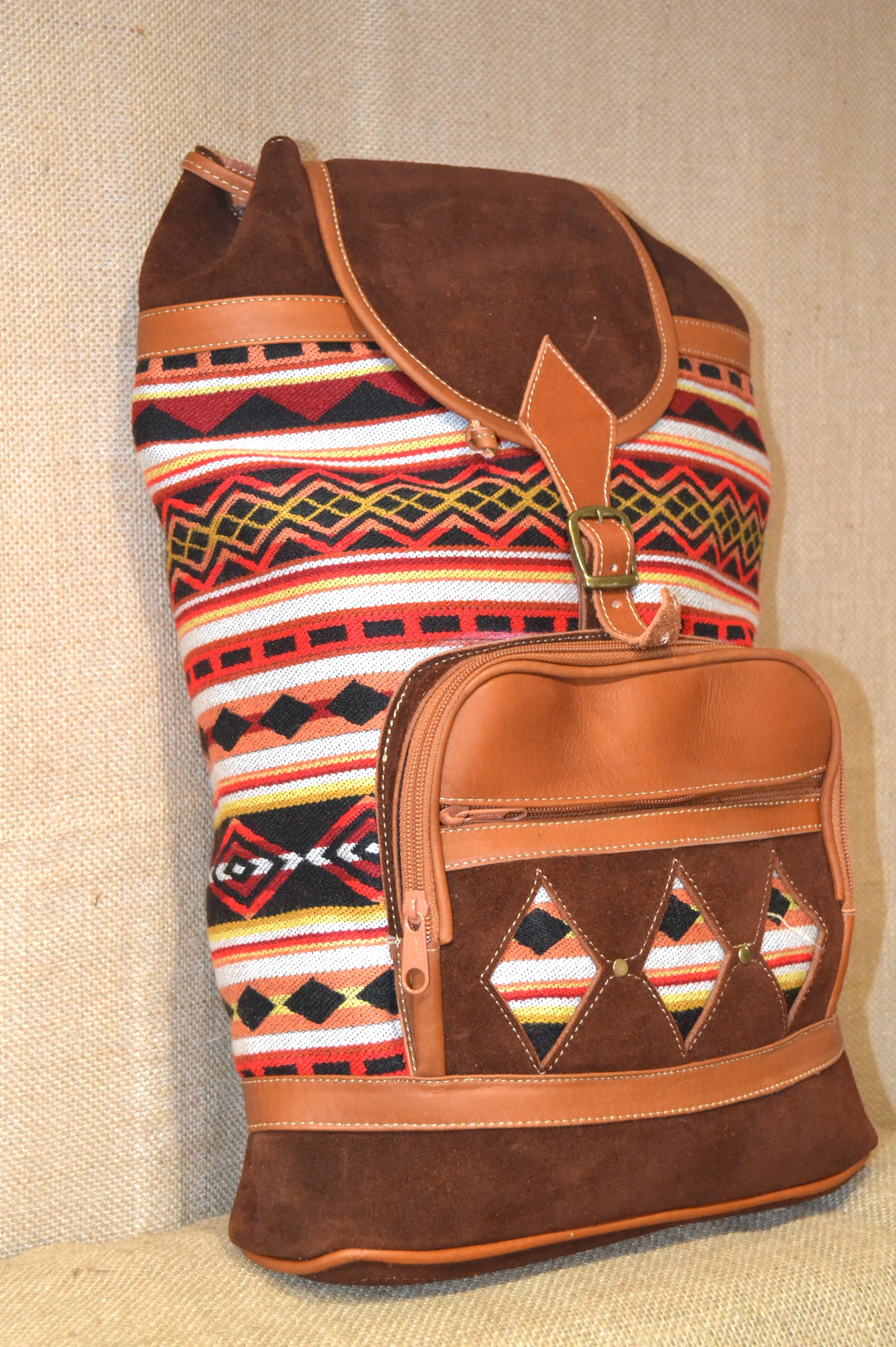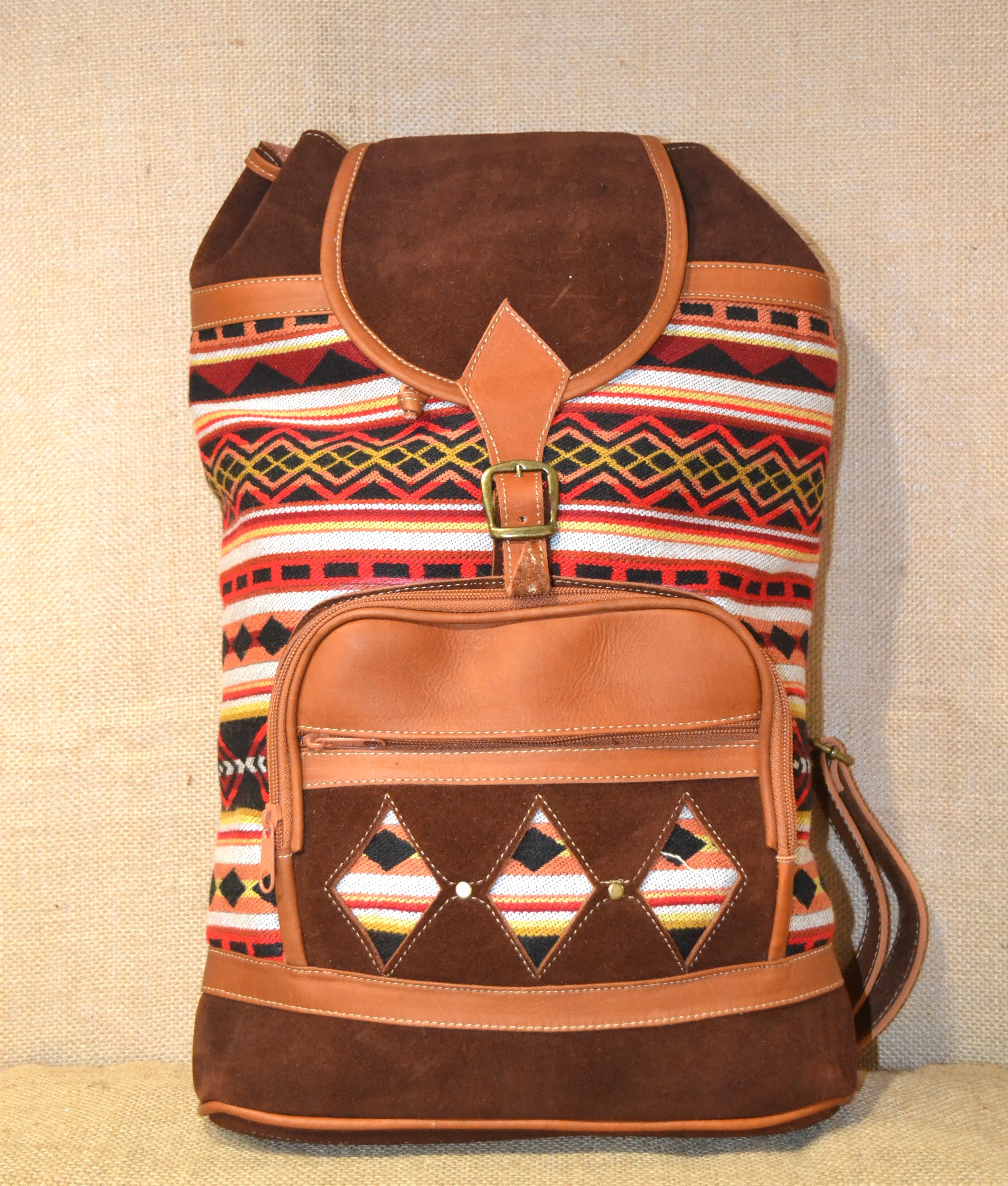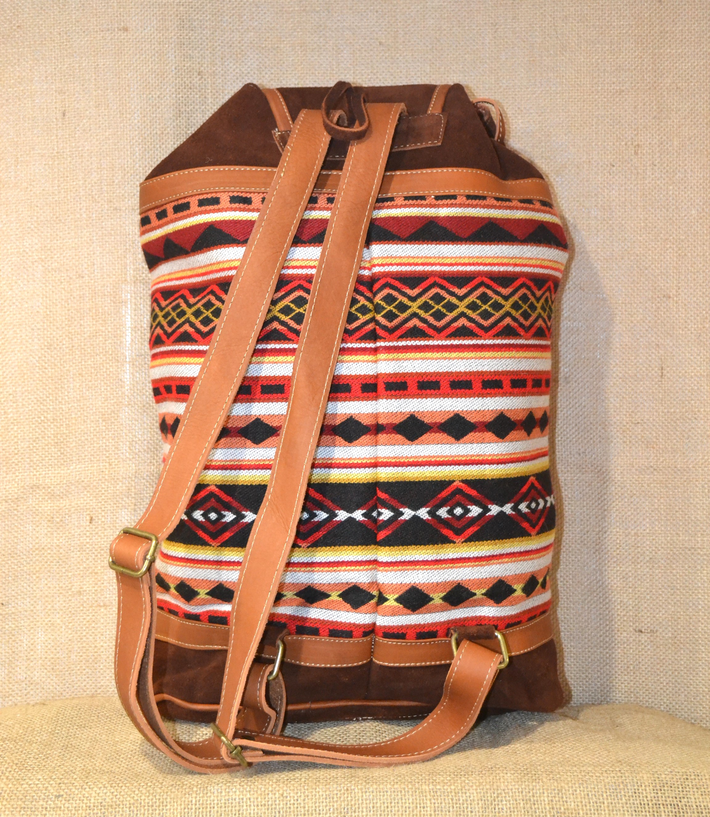 Wybierasz się na wyprawę w góry na pieszą wycieczkę do lasu . W naszym sklepie mamy dla ciebie idealny plecak. Jeśli zależy tobie na plecaku innym niż te które można kupić na chińskich stronach lub oklepanych wzorach w drogich sieciowych sklepach których funkcjonalność nie jest adekwatna do ceny jaką musisz zapłacić . Zobacz plecak wykonany w 100 % ręcznie . Szyty w Ekwadorskich Andach w małym warsztacie kaletniczym ze 100 % brązowej zamszowej skóry bydlęcej i wełnianej tkaniny . Tkanina ta utkana na krosnach z wełny owczej , pokryta etnicznymi wzorami które od setek lat używane są przez Indian Keczua i stanowią nieodłączny element ich kultury