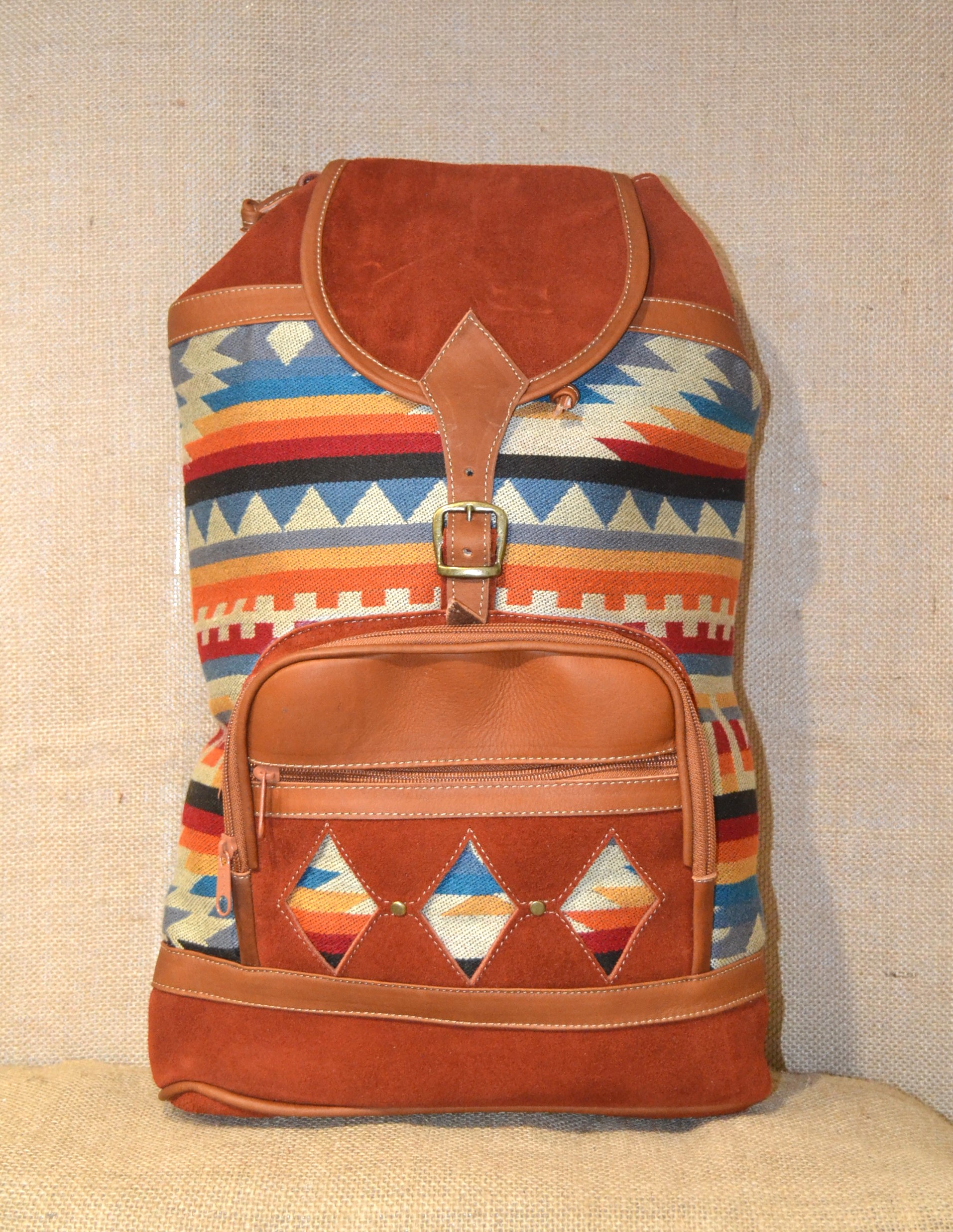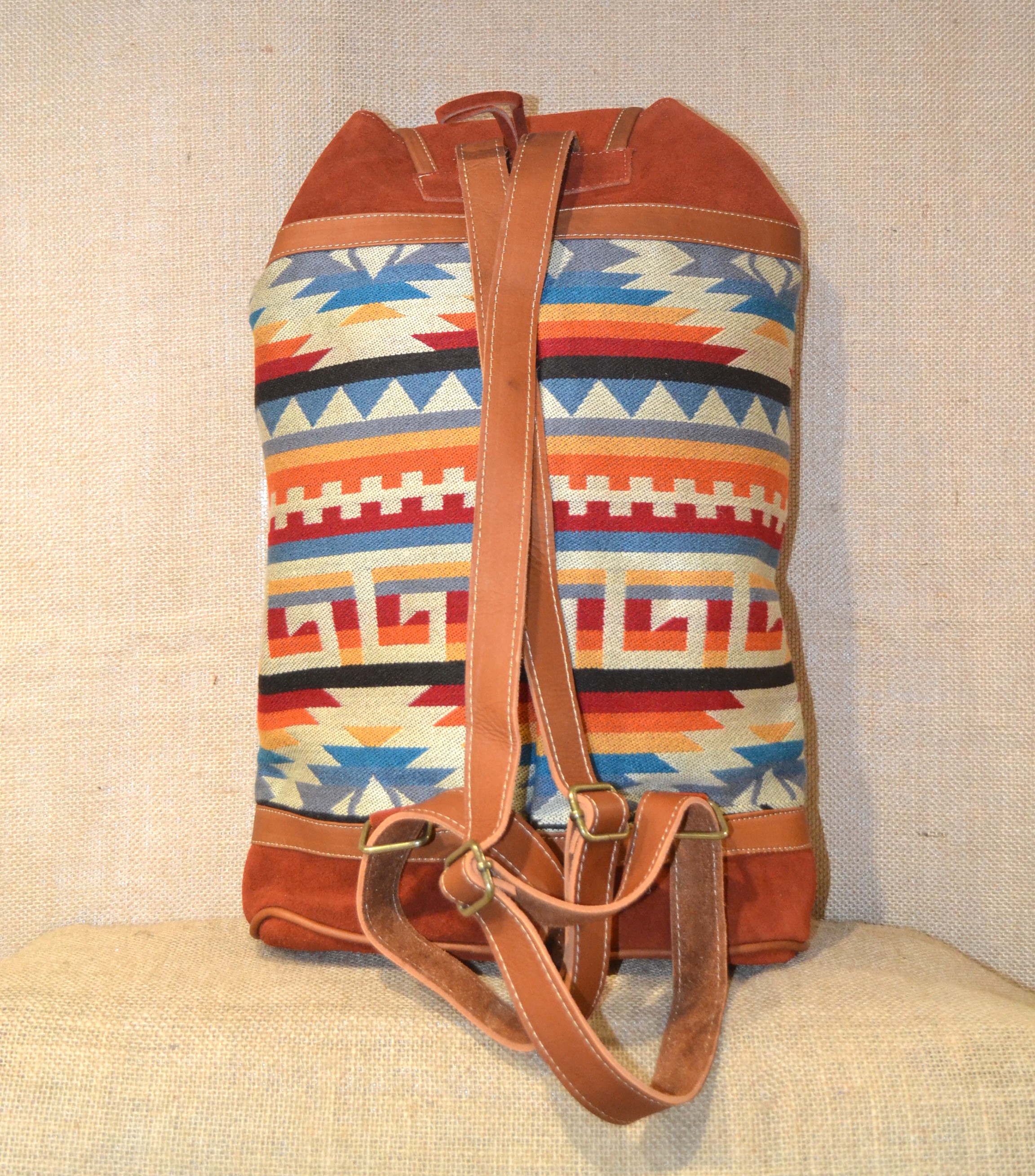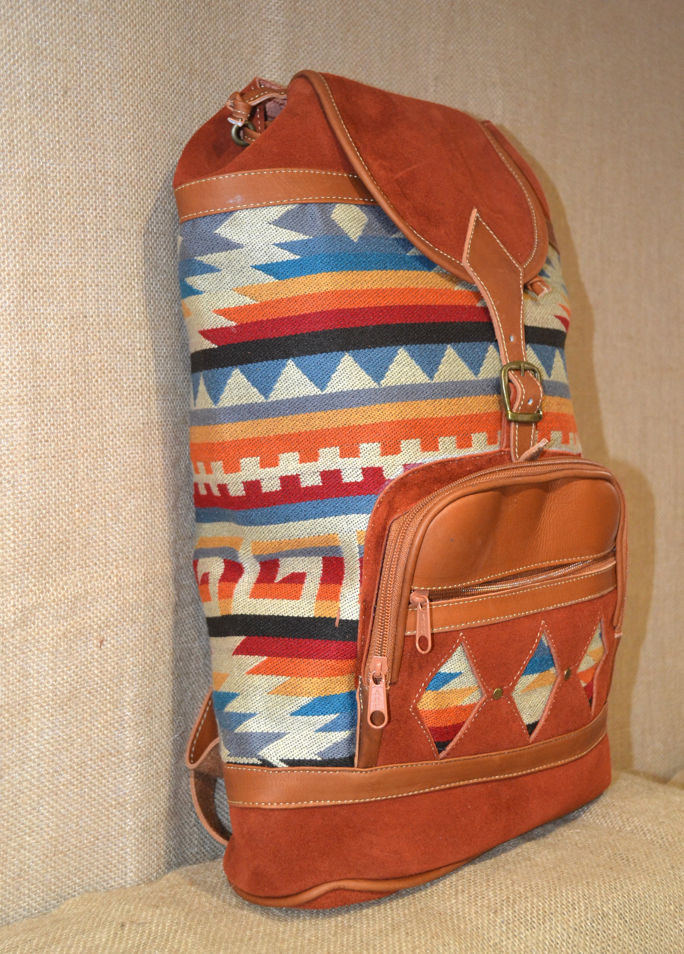 Wybierasz się na wyprawę w góry na pieszą wycieczkę do lasu . W naszym sklepie mamy dla ciebie idealny plecak. Jeśli zależy tobie na plecaku innym niż te które można kupić na chińskich stronach lub oklepanych wzorach w drogich sieciowych sklepach których funkcjonalność nie jest adekwatna do ceny jaką musisz zapłacić . Zobacz plecak wykonany w 100 % ręcznie . Szyty w Ekwadorskich Andach w małym warsztacie kaletniczym ze 100% zamszowej skóry bydlęcej w kolorze ceglastym i wełnianej tkaniny . Tkanina ta utkana na krosnach z wełny owczej , pokryta etnicznymi wzorami które od setek lat używane są przez Indian Keczua i stanowią nieodłączny element ich kultury