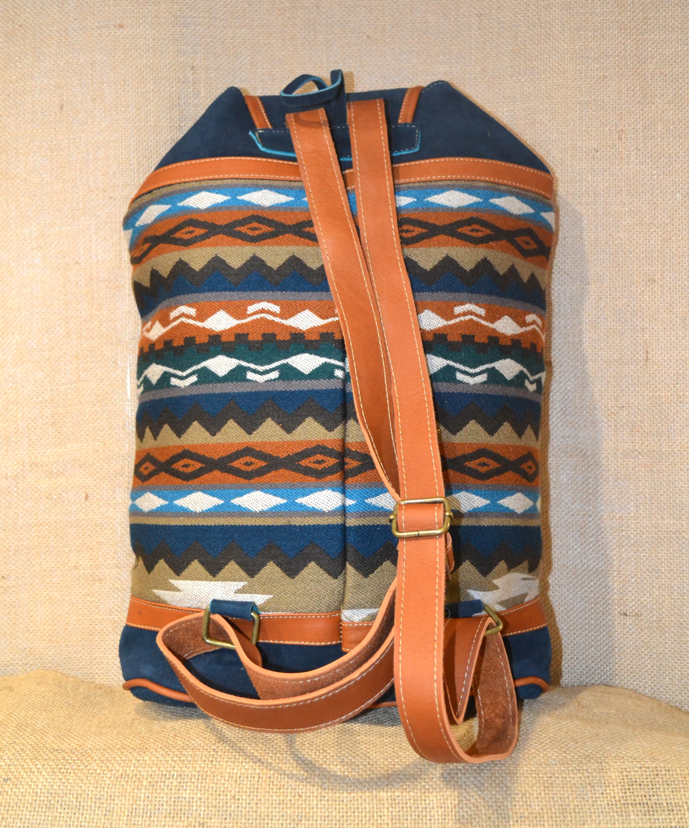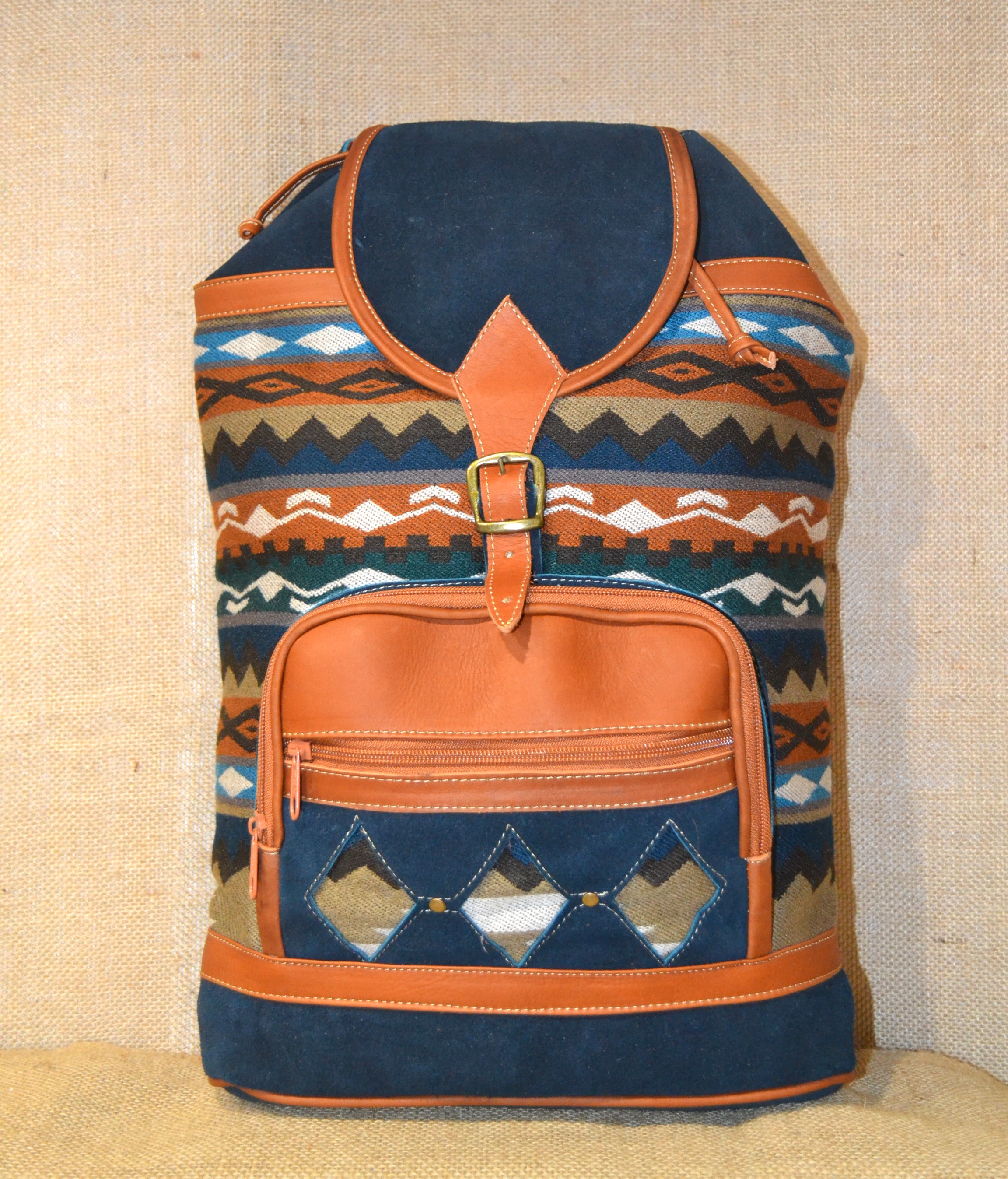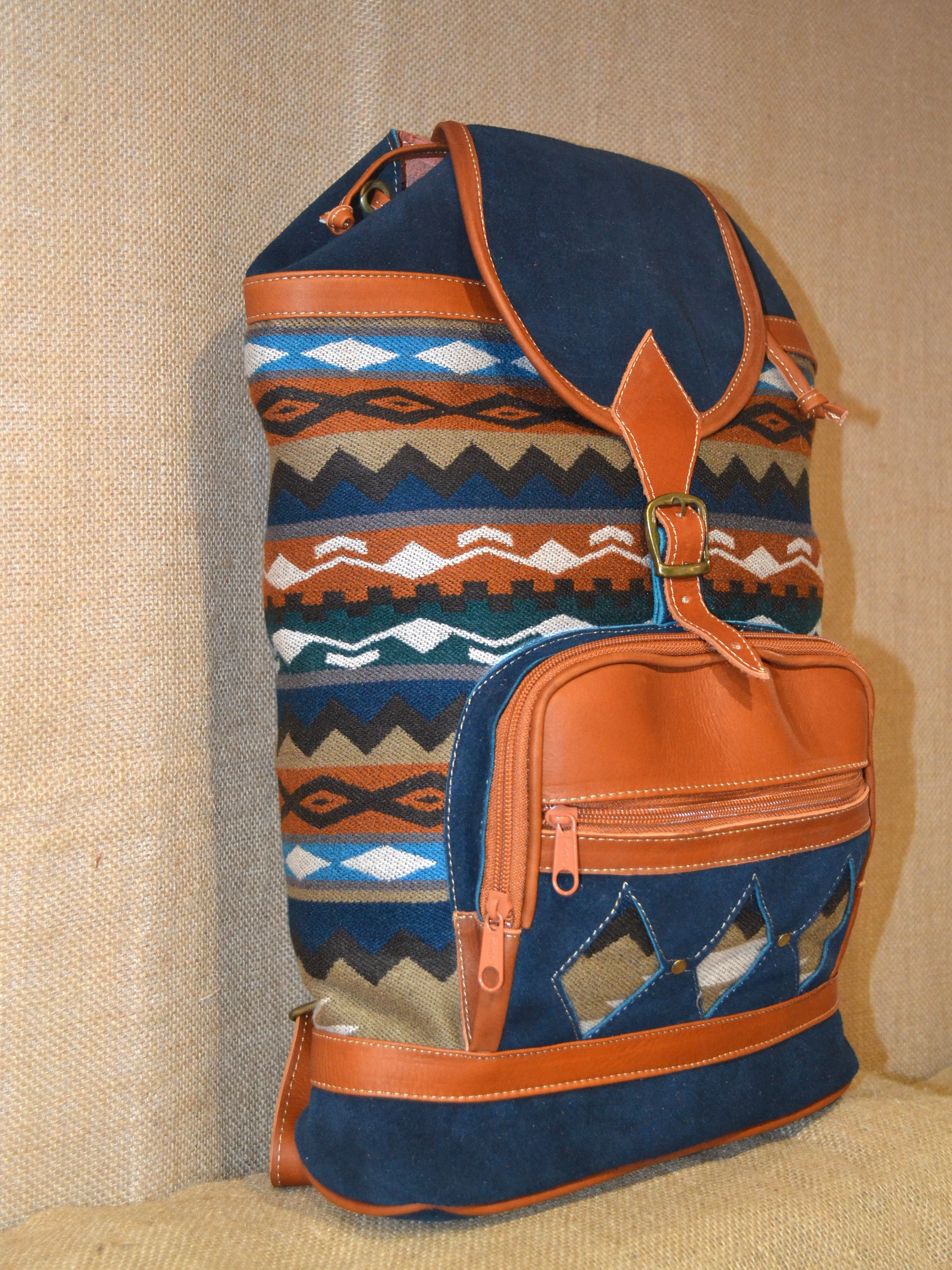 Wybierasz się na wyprawę w góry na pieszą wycieczkę do lasu . W naszym sklepie mamy dla ciebie idealny plecak. Jeśli zależy tobie na plecaku innym niż te które można kupić na chińskich stronach lub oklepanych wzorach w drogich sieciowych sklepach których funkcjonalność nie jest adekwatna do ceny jaką musisz zapłacić . Zobacz plecak wykonany w 100 % ręcznie . Szyty w Ekwadorskich Andach w małym warsztacie kaletniczym ze 100 % zamszowej skóry bydlęcej w kolorze morskim i wełnianej tkaniny . Tkanina ta utkana na krosnach z wełny owczej , pokryta etnicznymi wzorami które od setek lat używane są przez Indian Keczua i stanowią nieodłączny element ich kultury