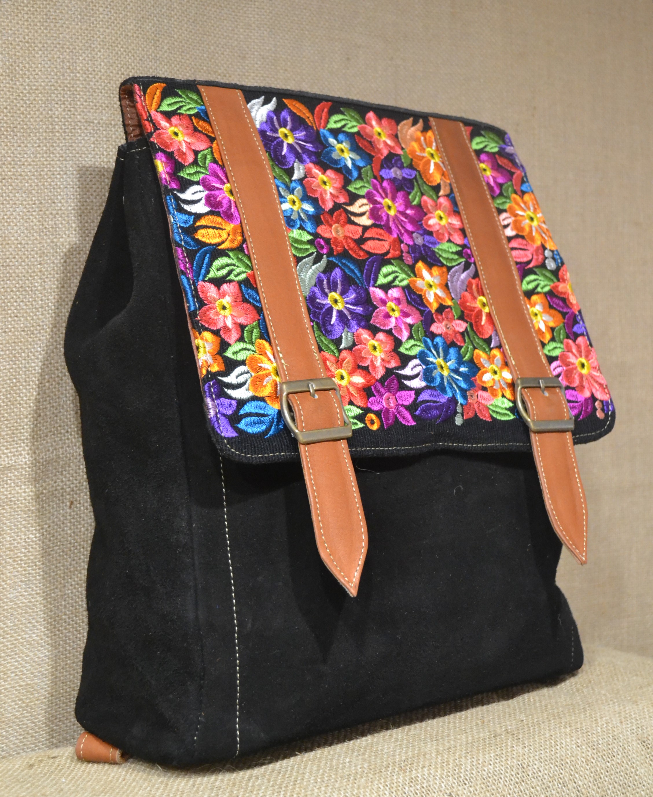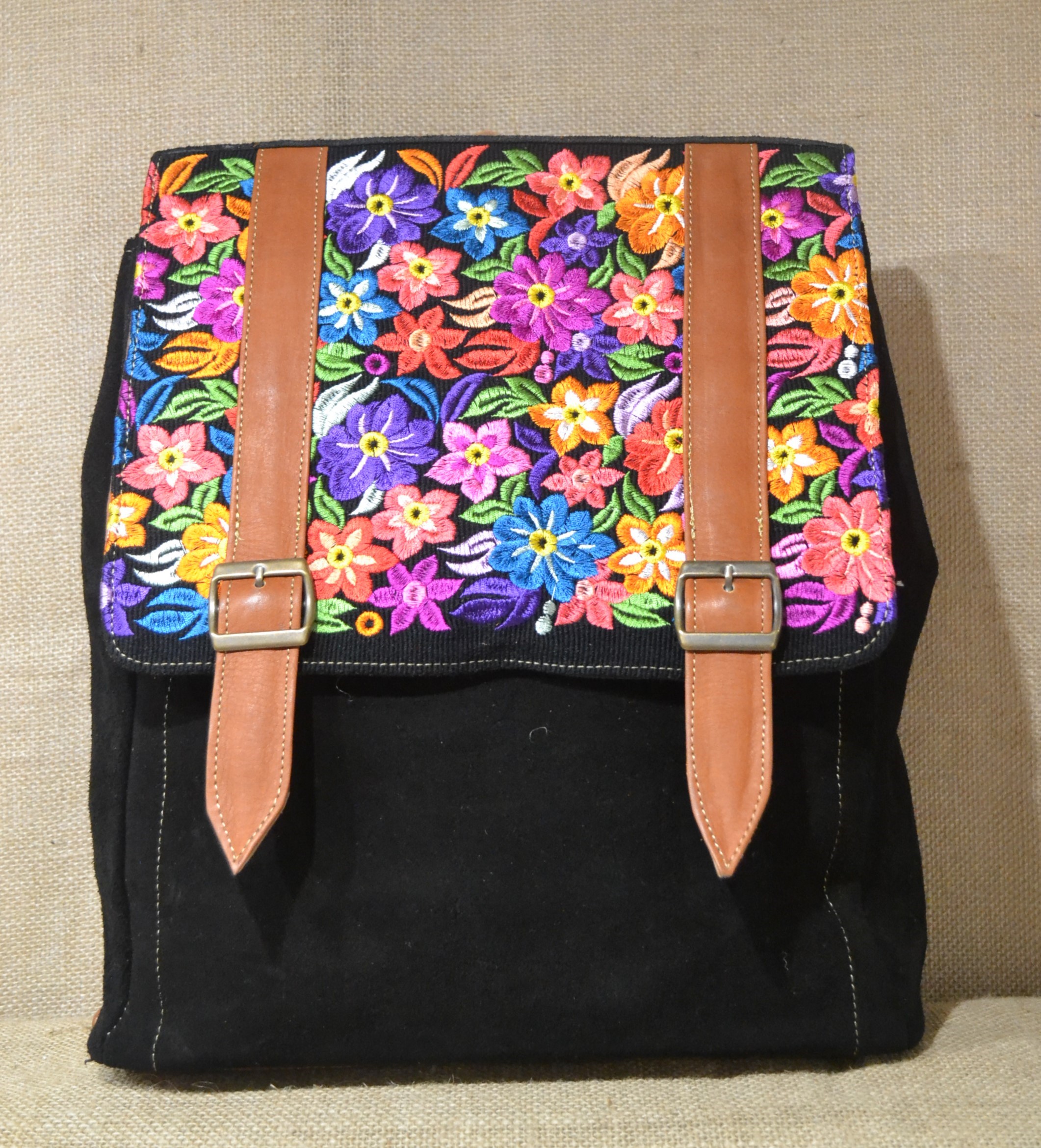 Strona główna » Wyroby ze skóry » Plecak typu kostka ze skóry zamszowej czarny z kwiatowym kolorowym haftem