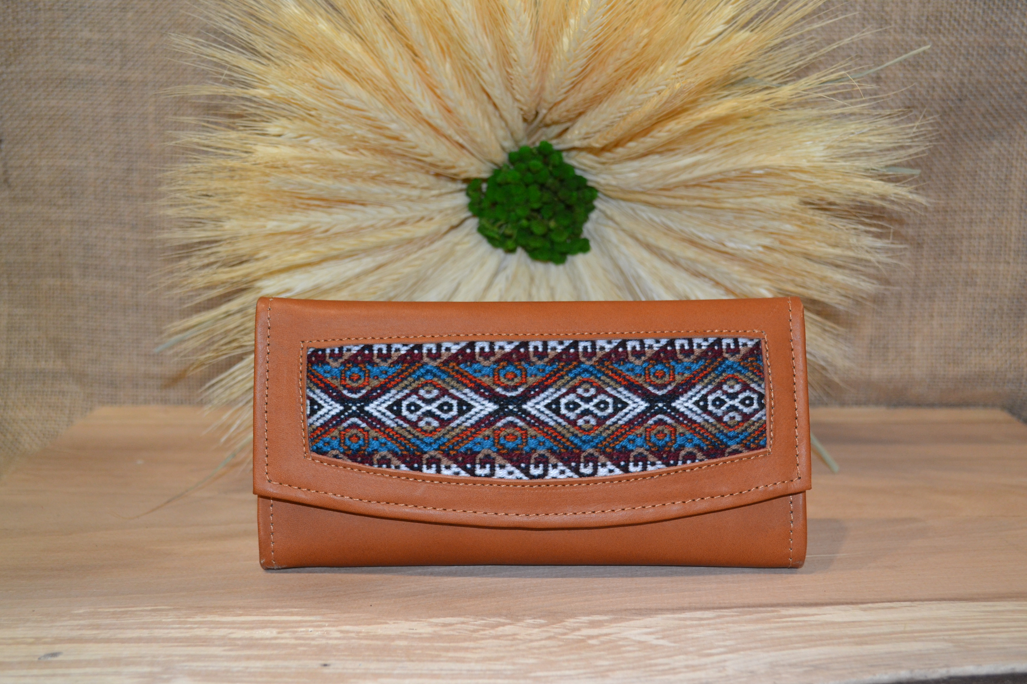 Strona główna » Wyroby ze skóry » Portfel duży skórzany brązowy z etnicznym kolorowym haftem .