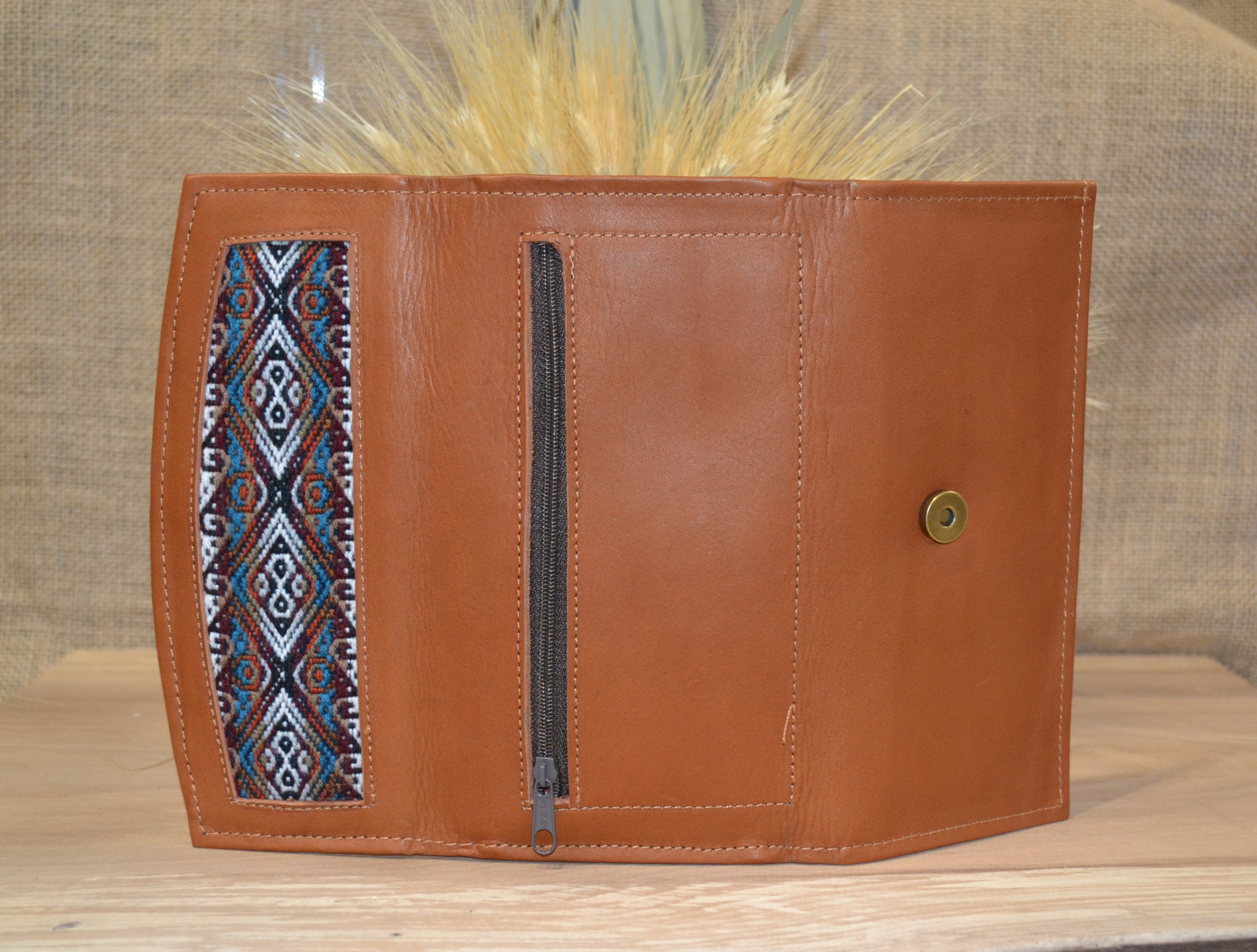 Jeśli szukasz dużego, zgrabnego , pojemnego portfela z portmonetką i lusterkiem to ten model jest dla ciebie . 100% naturalna  brązowa  skóra pokryta etnicznym haftem . Zaprojektowany i uszyty wysoko w Ekwadorskich Andach przez mały rzemieślniczy warsztat kaletniczy. Portfel posiada przegrodę na banknoty i na monety a także kieszonki na karty płatnicze.