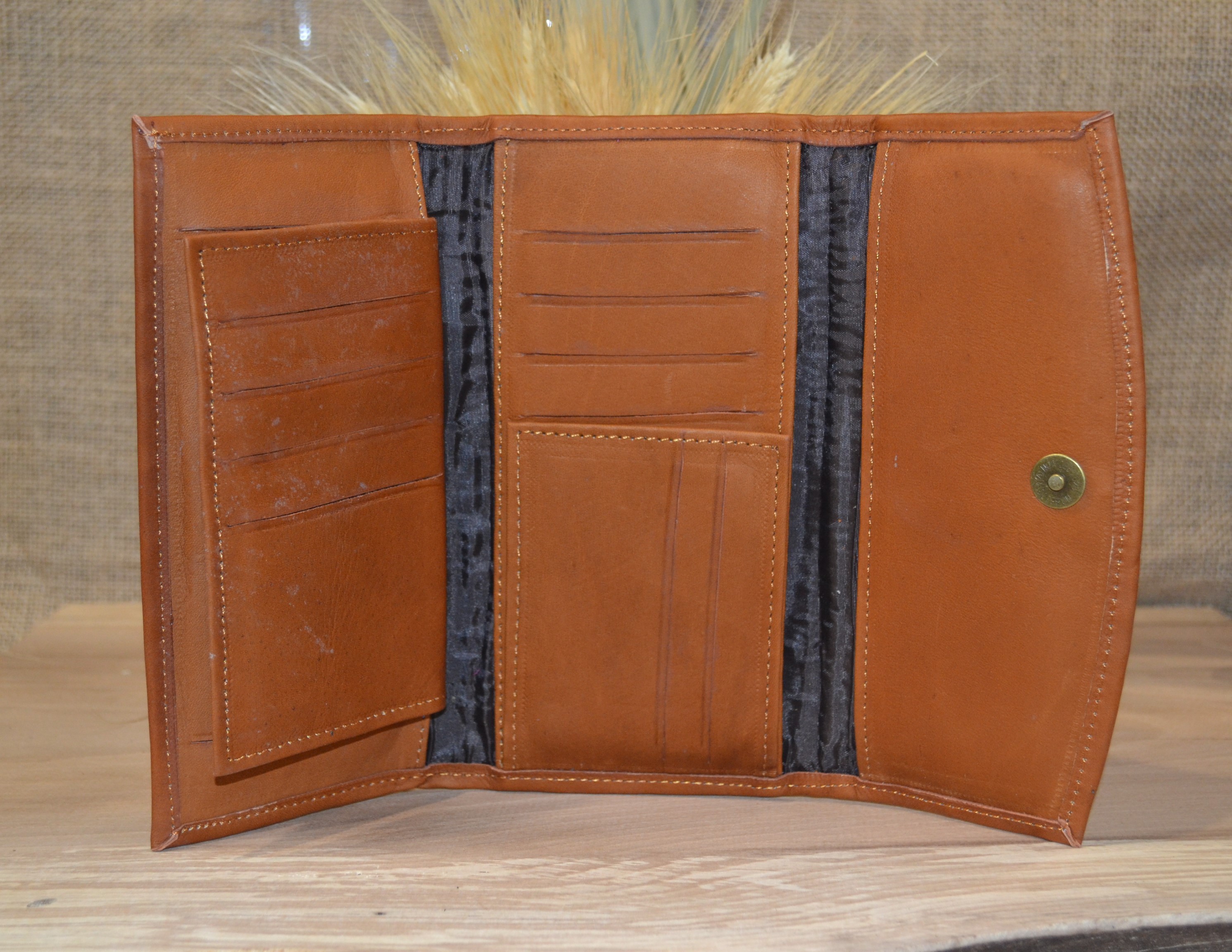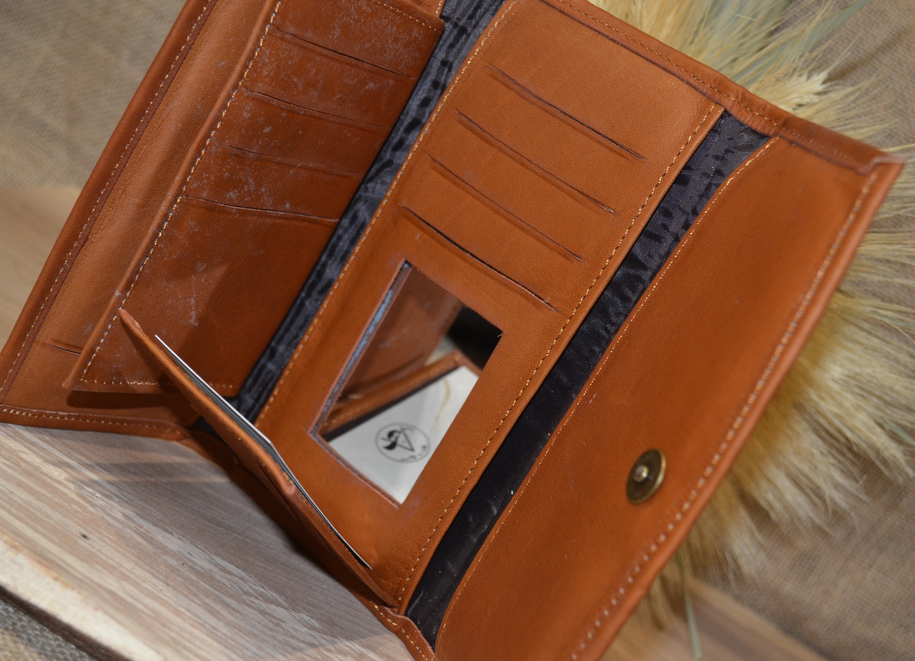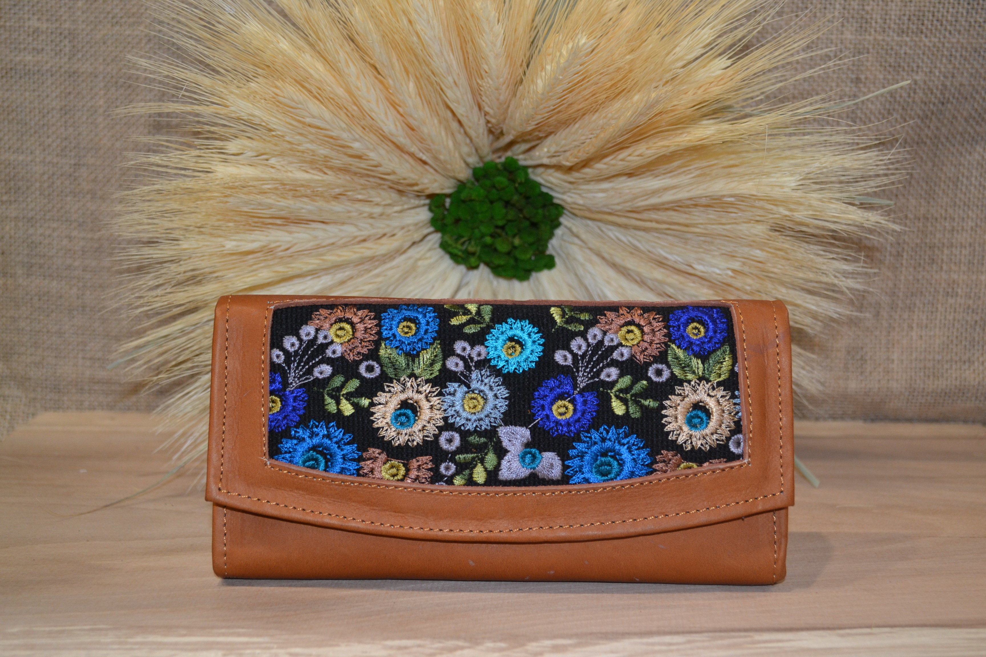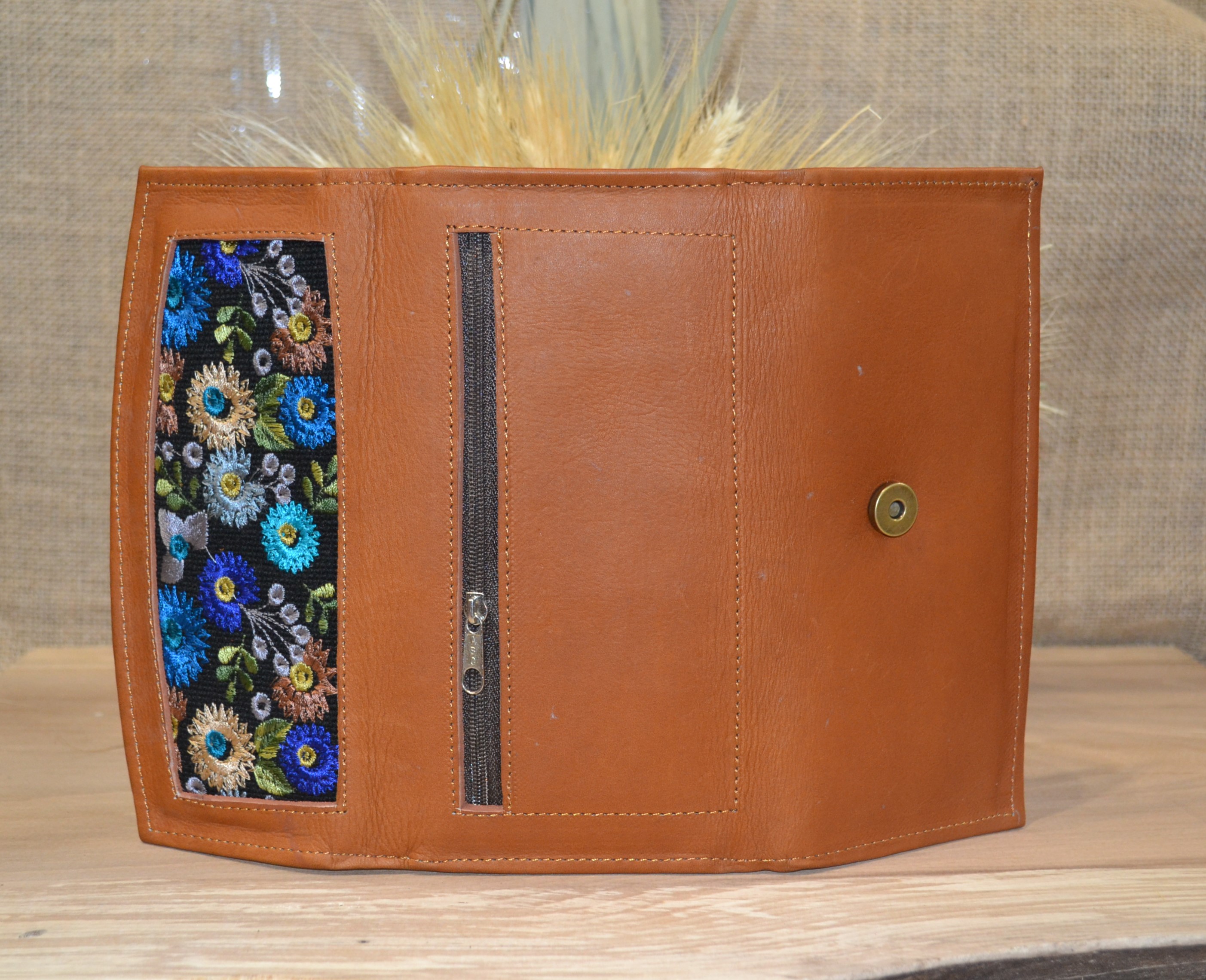 Jeśli szukasz dużego, zgrabnego , pojemnego portfela z portmonetką i lusterkiem to ten model jest dla ciebie . 100% naturalna brązowa  skóra pokryta kwiatowym haftem . Zaprojektowany i uszyty wysoko w Ekwadorskich Andach przez mały rzemieślniczy warsztat kaletniczy. Portfel posiada przegrodę na banknoty i na monety a także kieszonki na karty płatnicze.