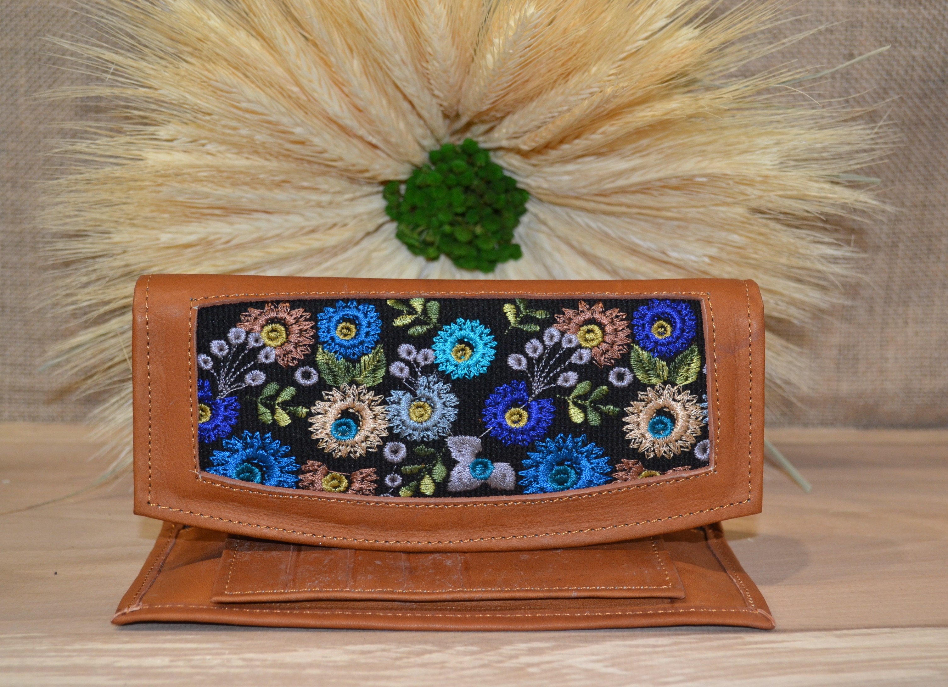 Strona główna » Wyroby ze skóry » Portfel duży skórzany brązowy z kwiatowym kolorowym haftem .