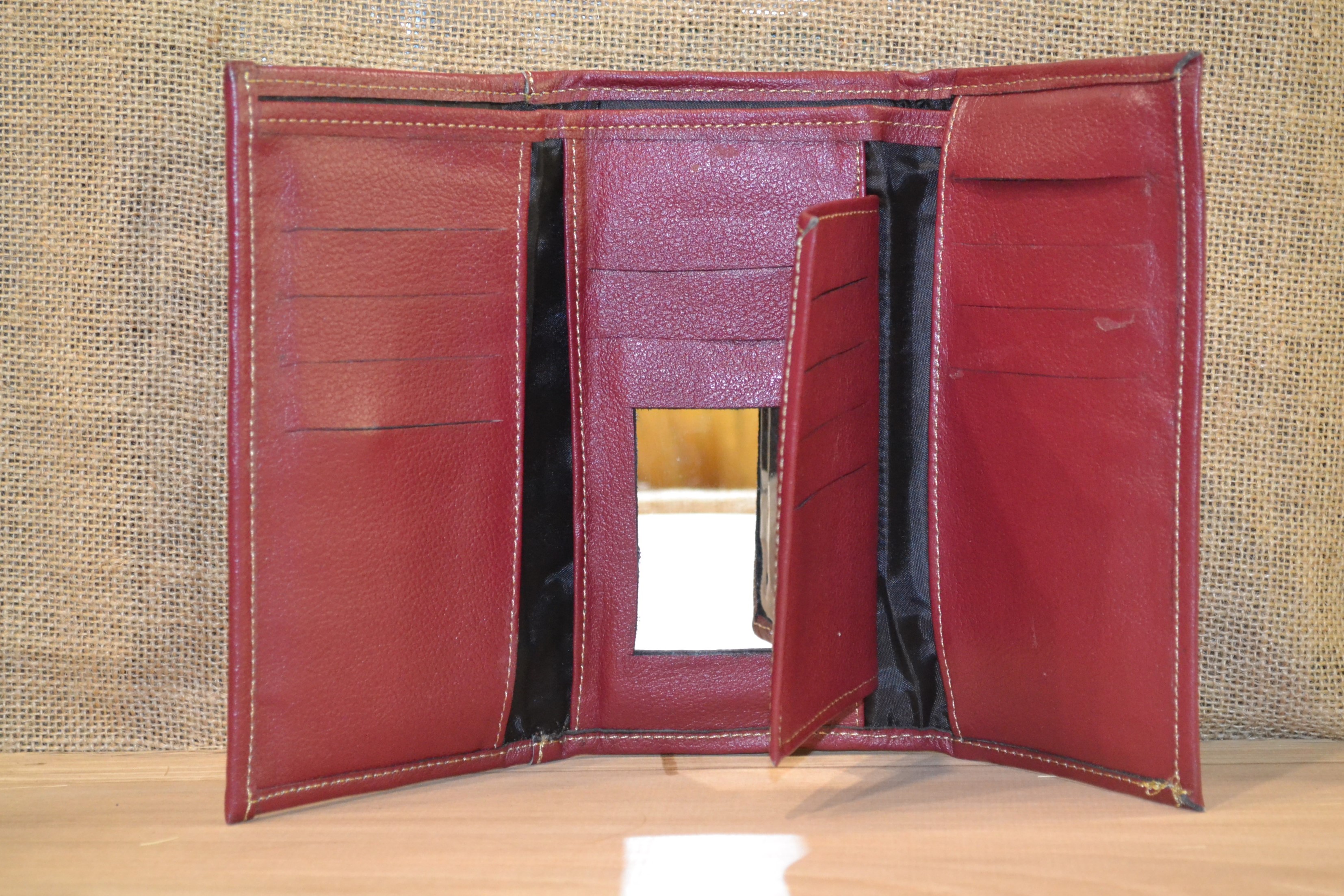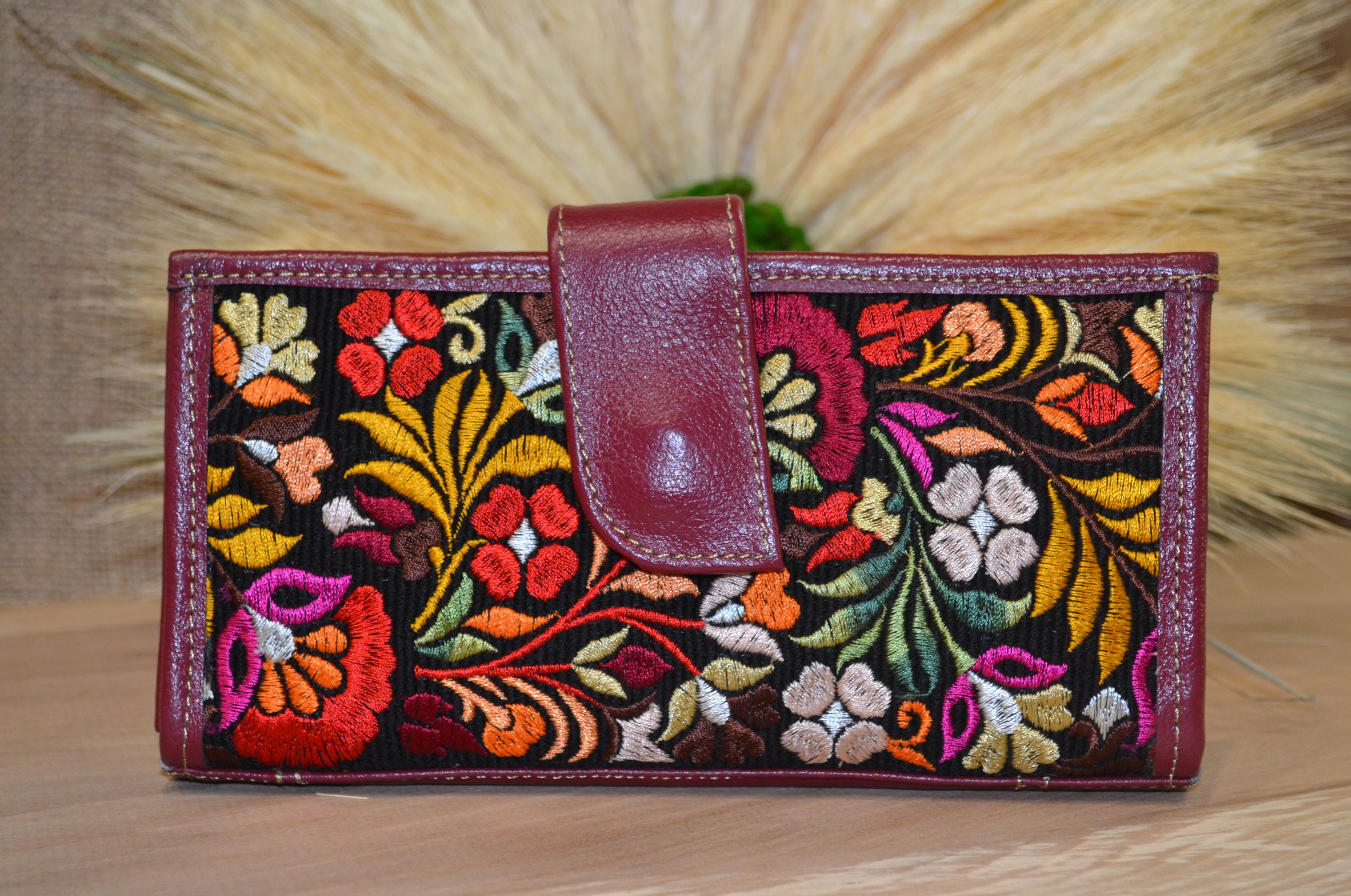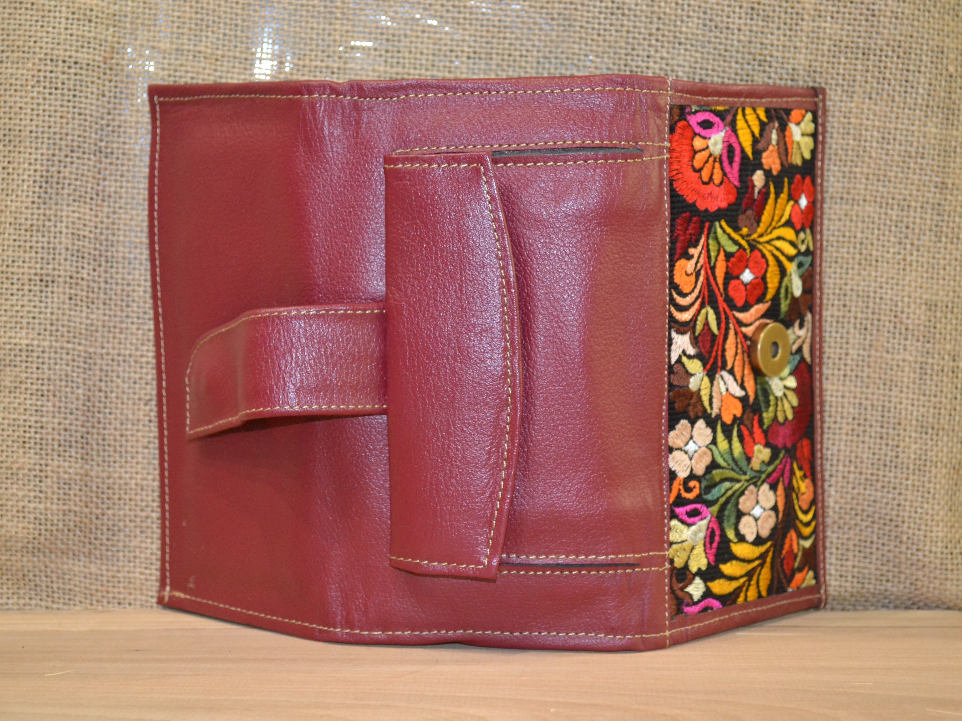 Jeśli szukasz dużego, zgrabnego , pojemnego portfela z portmonetką i lusterkiem to ten model jest dla ciebie . 100% naturalna ciemno czerwona skóra pokryta kwiatowym haftem . Zaprojektowany i uszyty wysoko w Ekwadorskich Andach przez mały rzemieślniczy warsztat kaletniczy. Portfel posiada przegrodę na banknoty i na monety a także kieszonki na karty płatnicze.