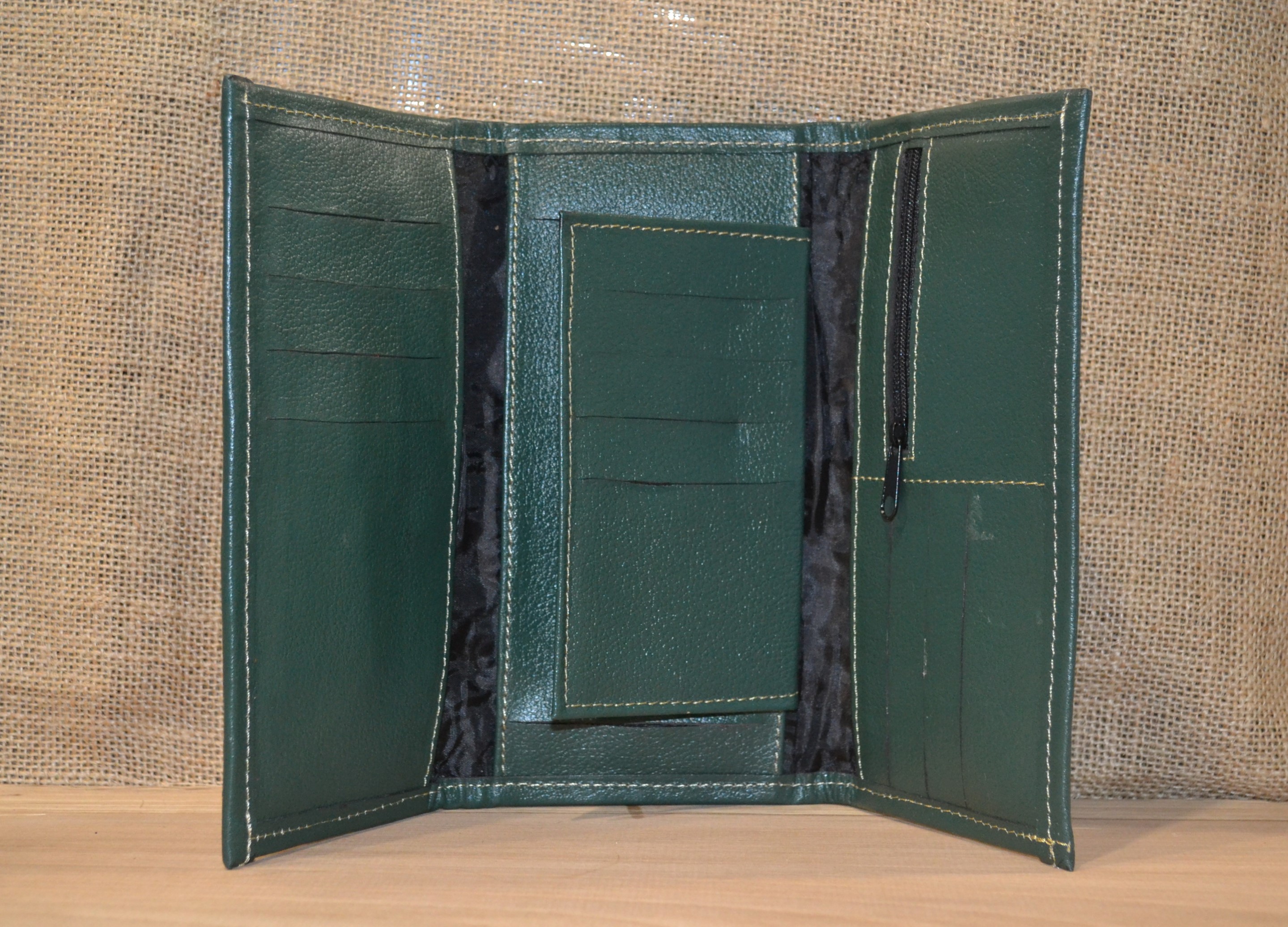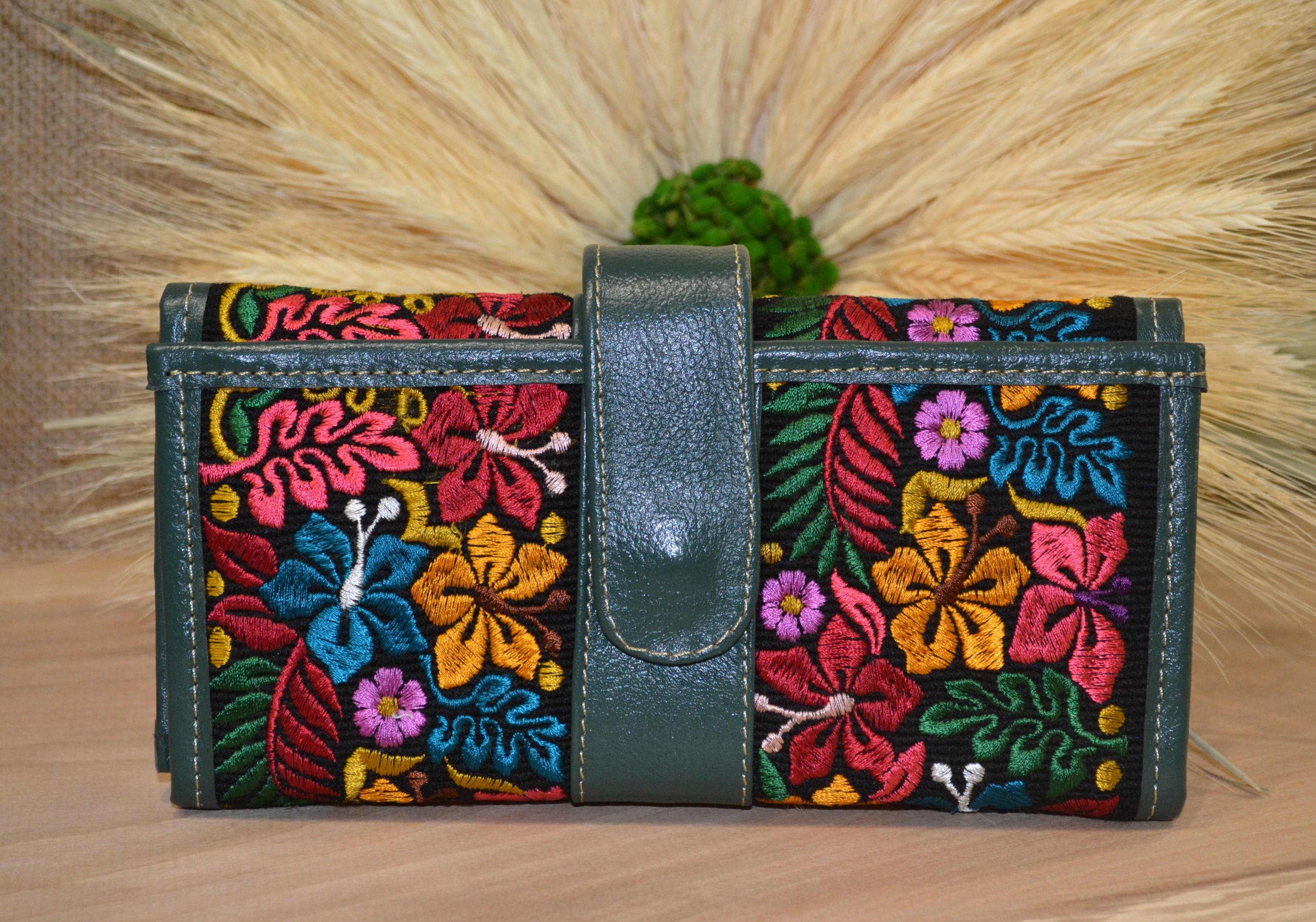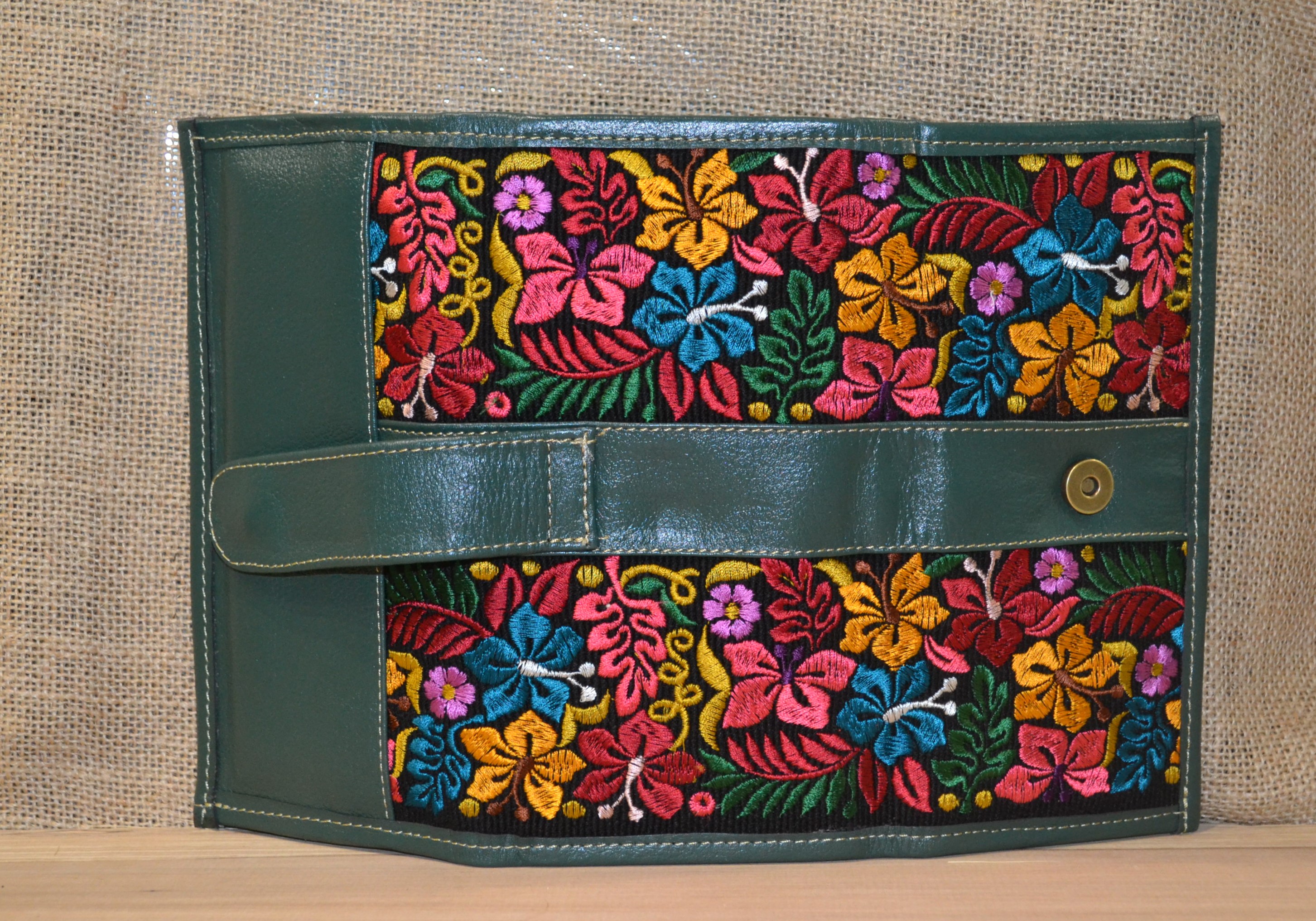 Jeśli szukasz dużego, zgrabnego , pojemnego portfela z portmonetką i lusterkiem to ten model jest dla ciebie . 100% naturalna ciemno zielona skóra pokryta kwiatowym haftem . Zaprojektowany i uszyty wysoko w Ekwadorskich Andach przez mały rzemieślniczy warsztat kaletniczy. Portfel posiada przegrodę na banknoty i na monety a także kieszonki na karty płatnicze.