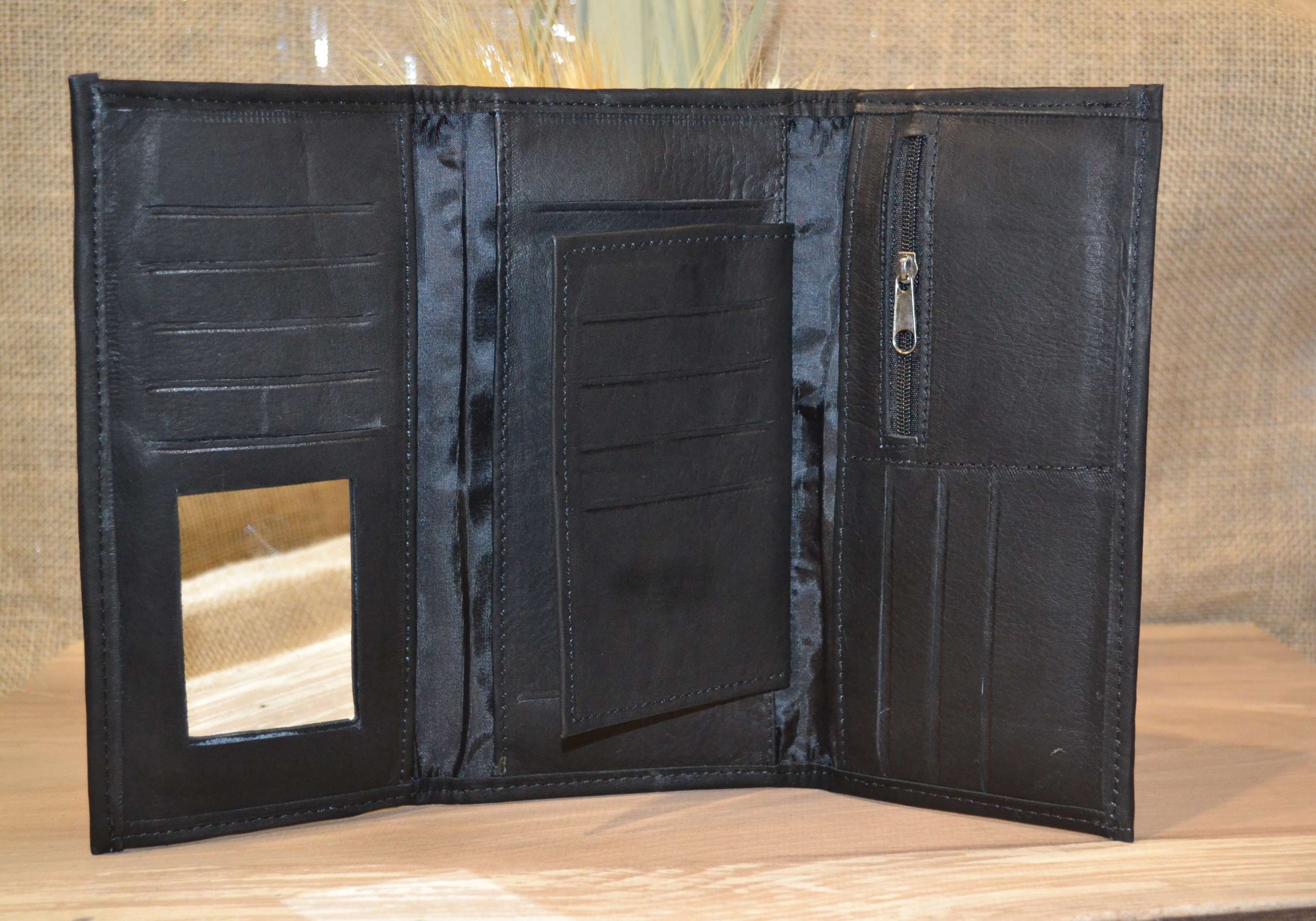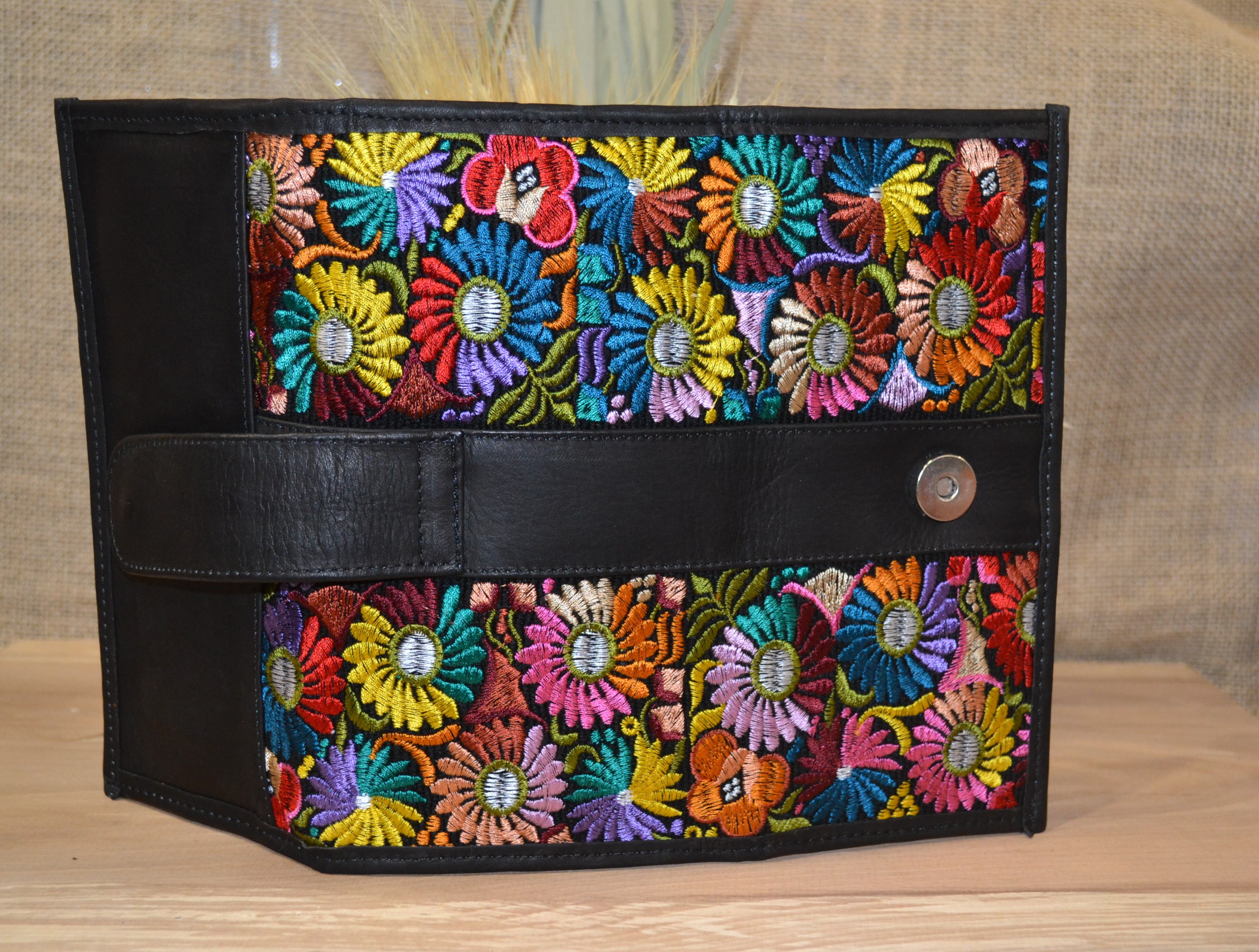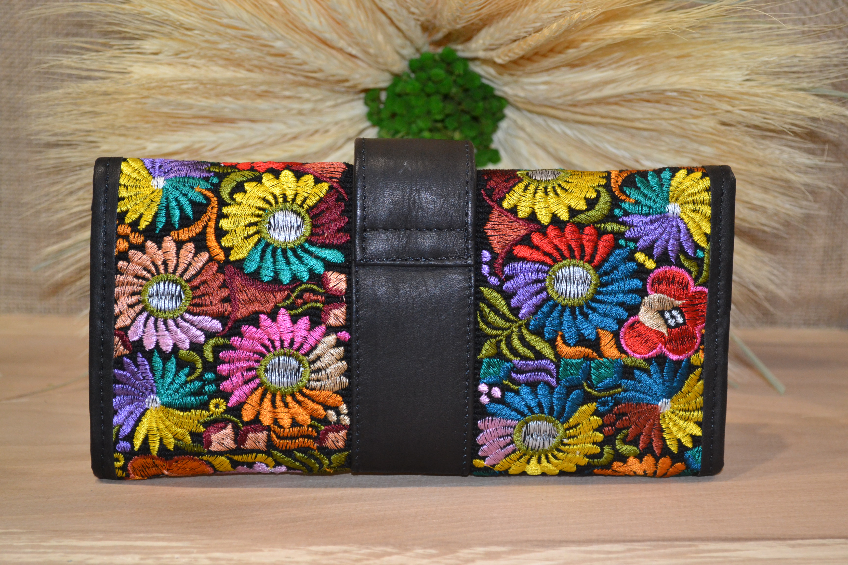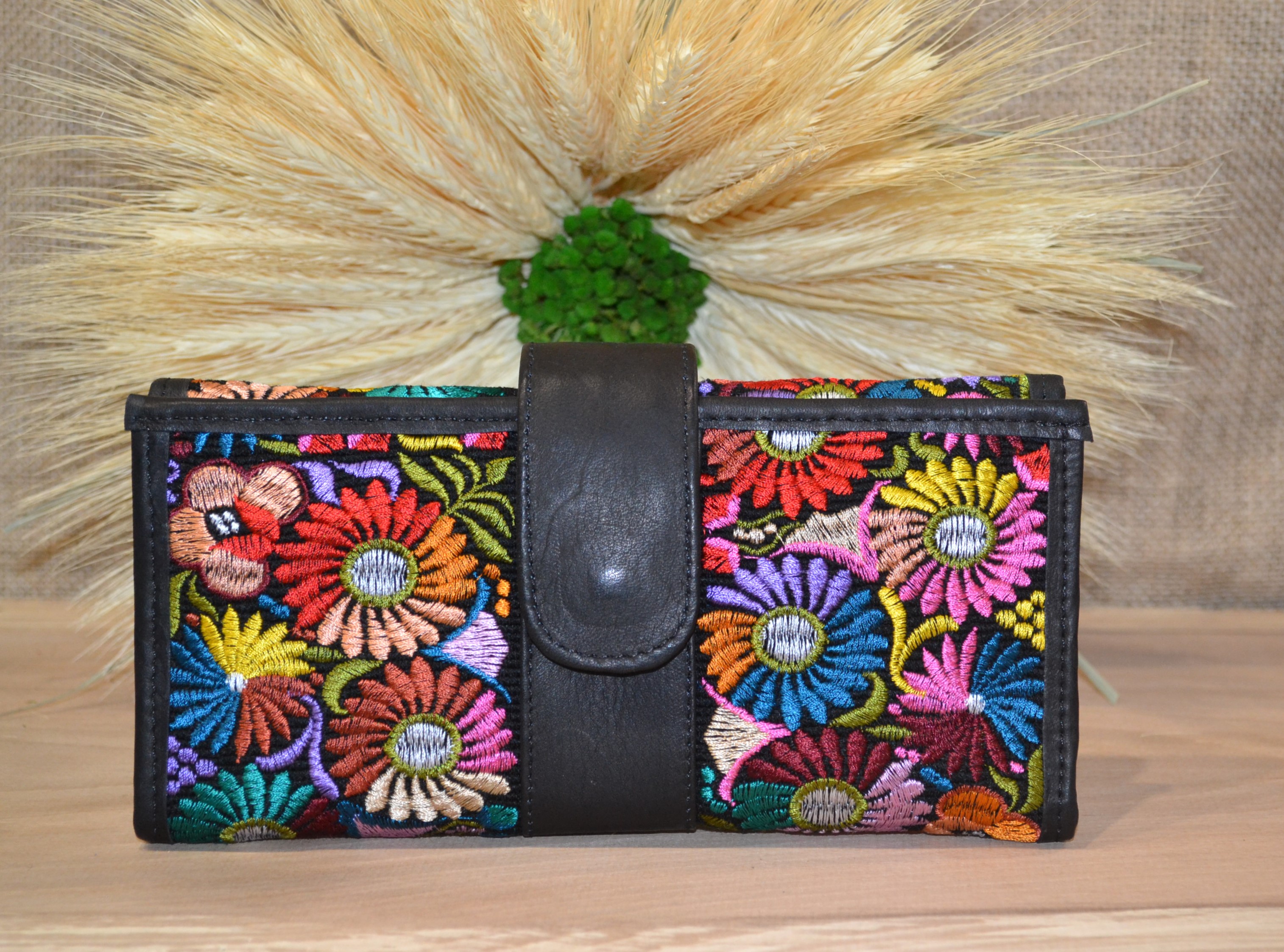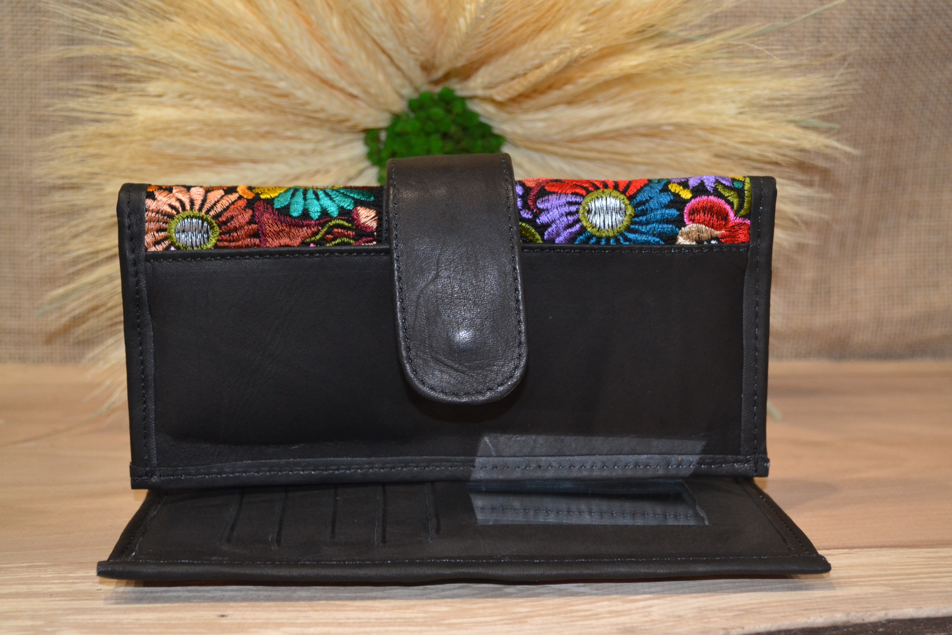 Jeśli szukasz dużego, zgrabnego , pojemnego portfela z portmonetką i lusterkiem to ten model jest dla ciebie . 100% naturalna  ciemnobrązowa  skóra pokryta kwiatowym haftem . Zaprojektowany i uszyty wysoko w Ekwadorskich Andach przez mały rzemieślniczy warsztat kaletniczy. Portfel posiada przegrodę na banknoty i na monety a także kieszonki na karty płatnicze.