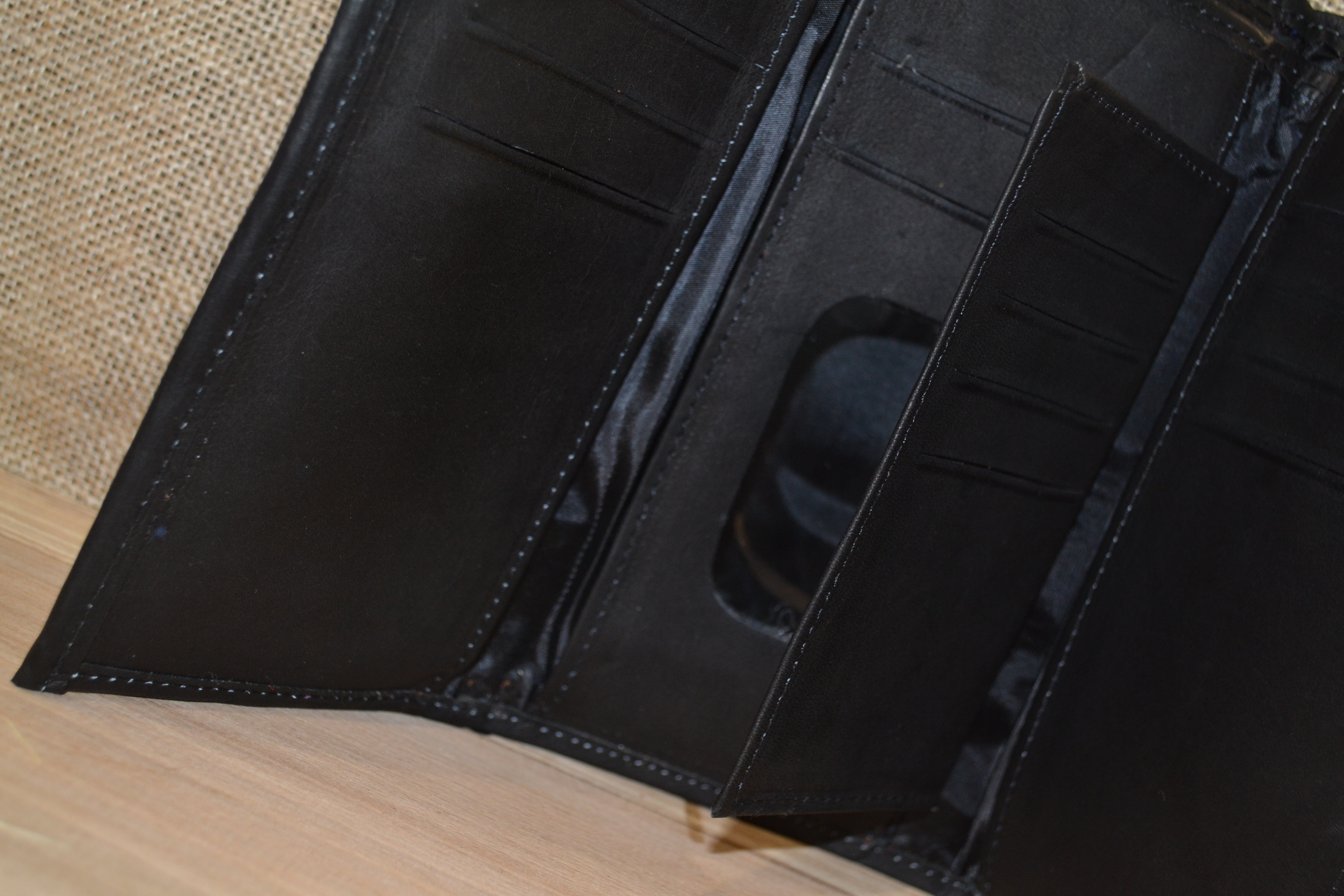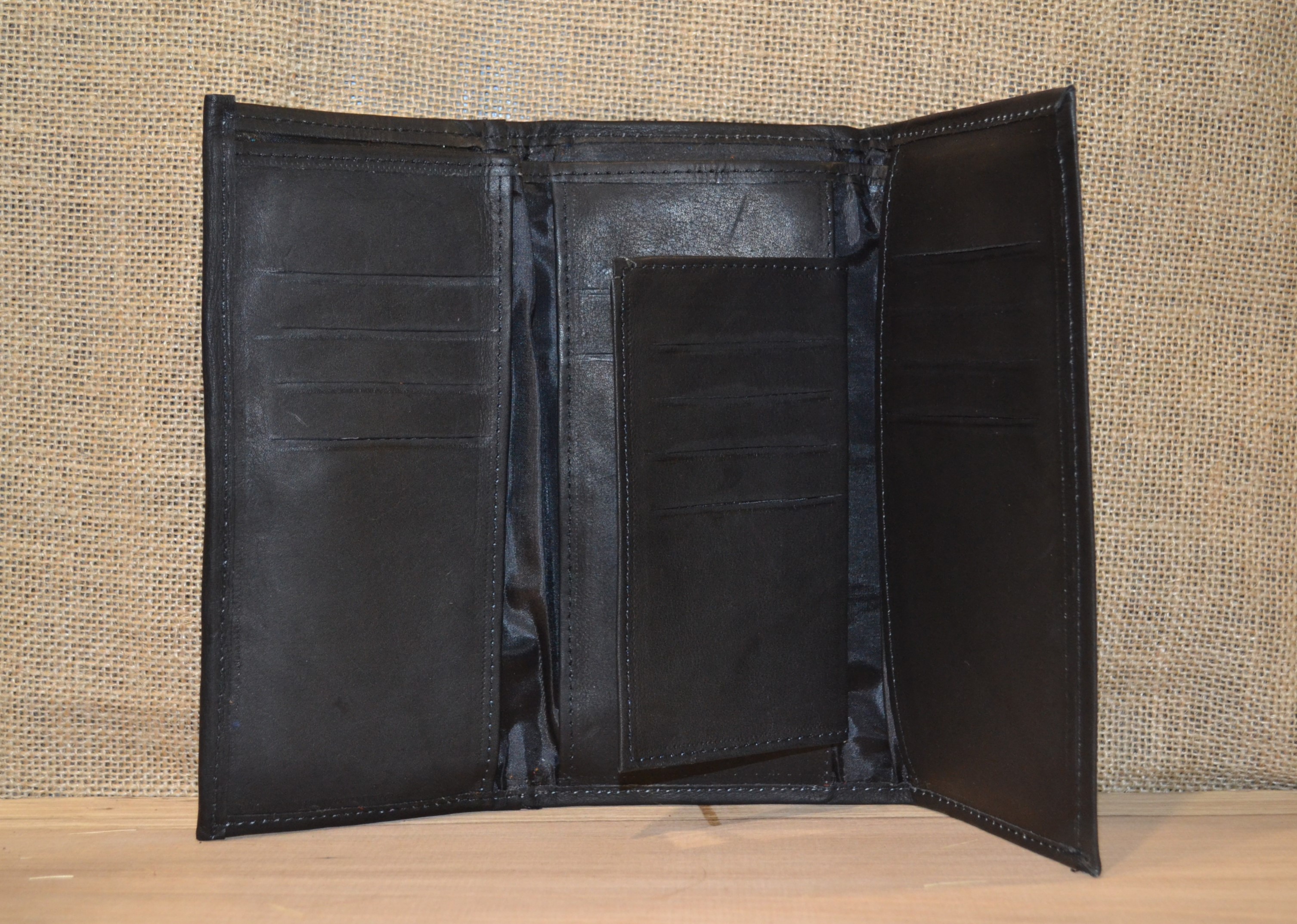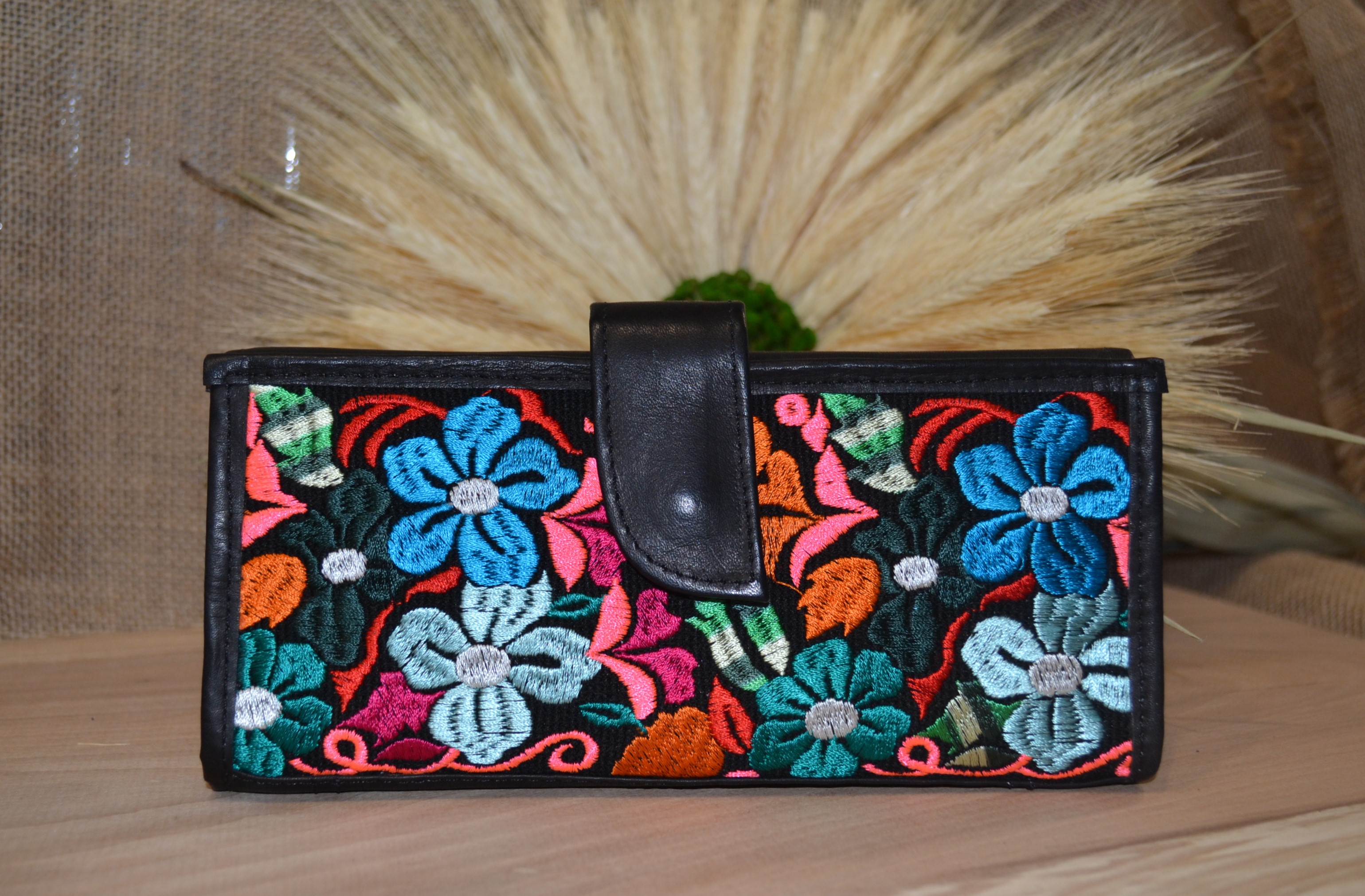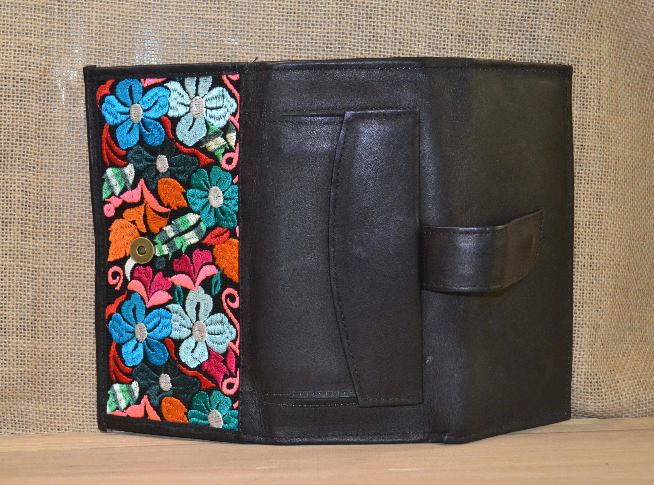 Jeśli szukasz dużego, zgrabnego , pojemnego portfela z portmonetką i lusterkiem to ten model jest dla ciebie . 100% naturalna czarna skóra pokryta kwiatowym haftem . Zaprojektowany i uszyty wysoko w Ekwadorskich Andach przez mały rzemieślniczy warsztat kaletniczy. Portfel posiada przegrodę na banknoty i na monety a także kieszonki na karty płatnicze.