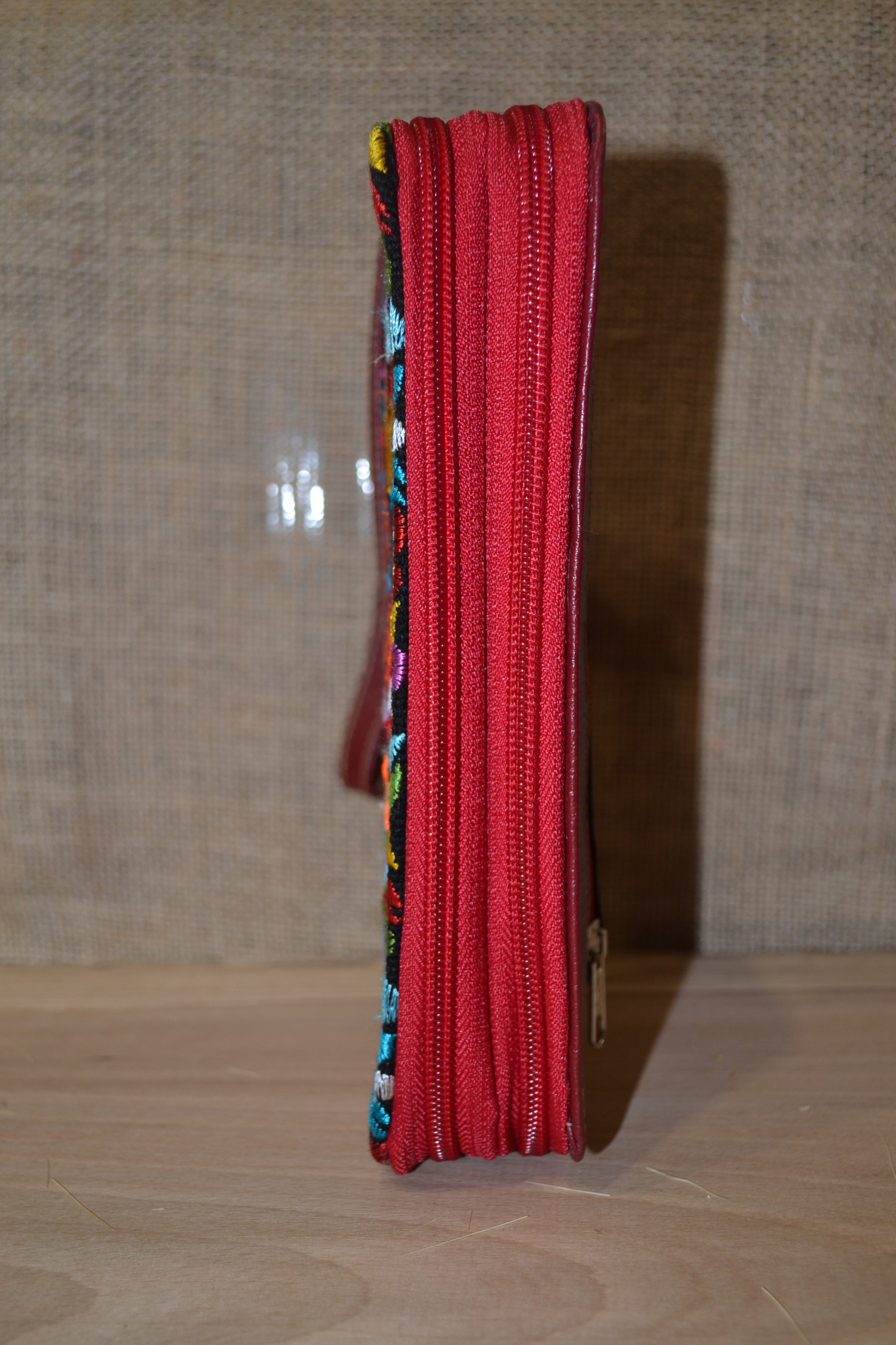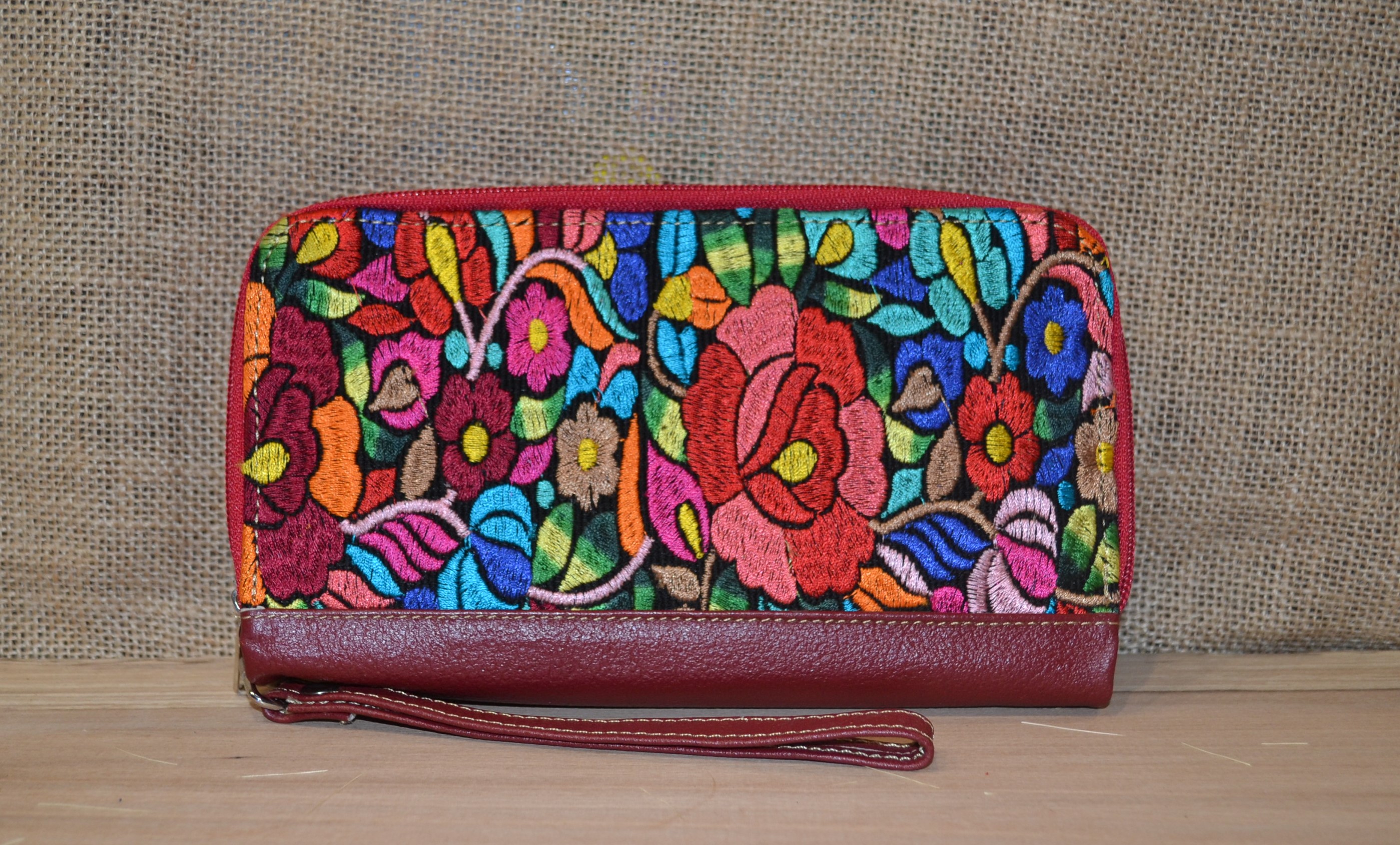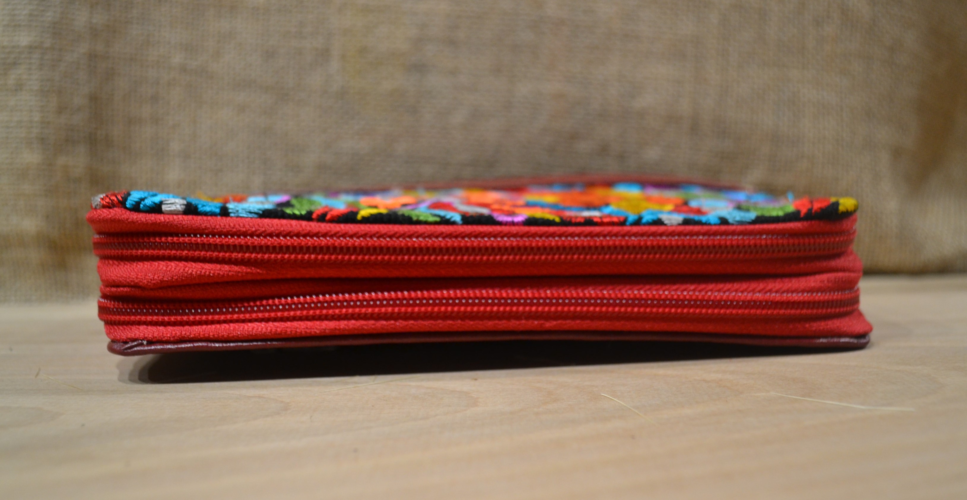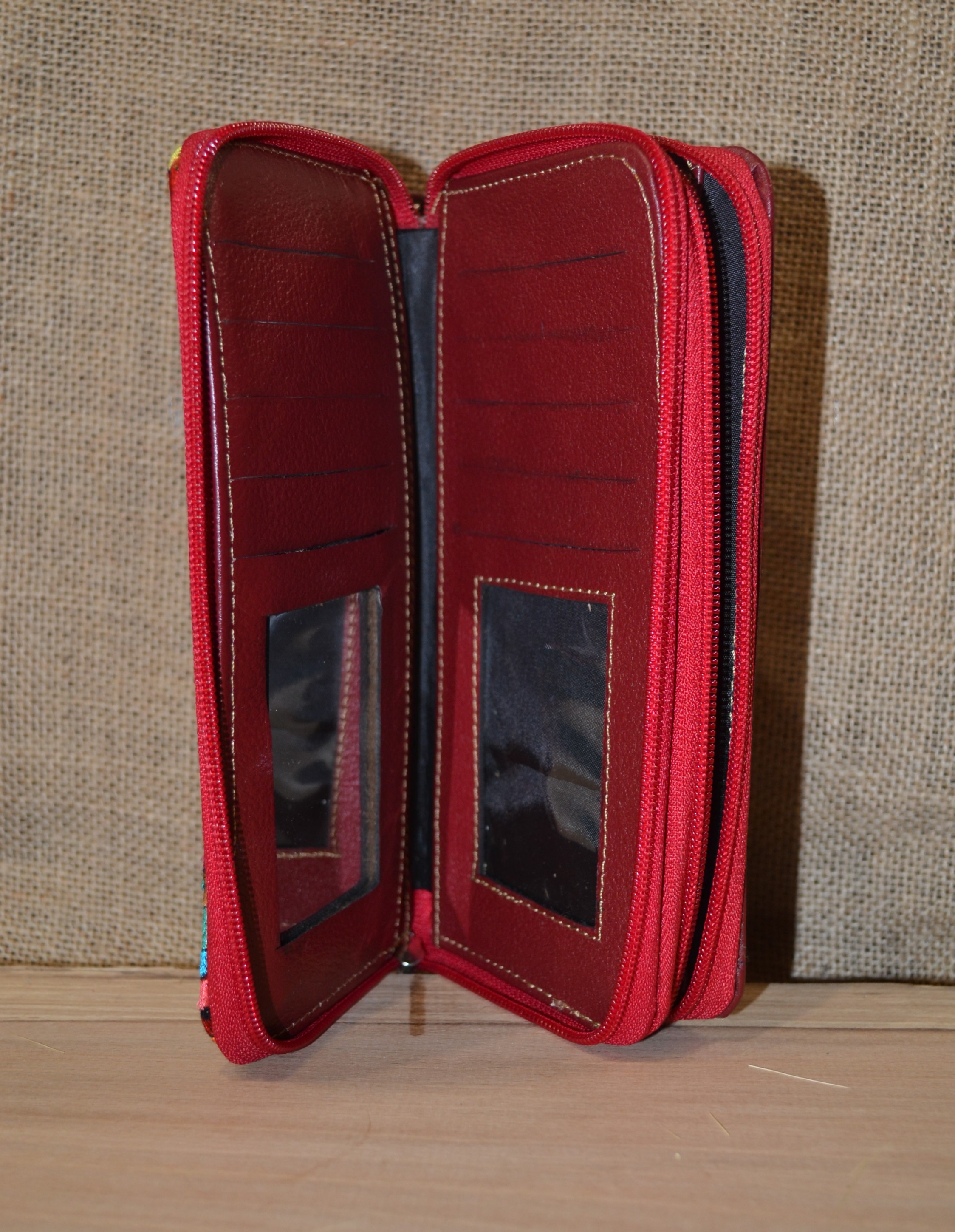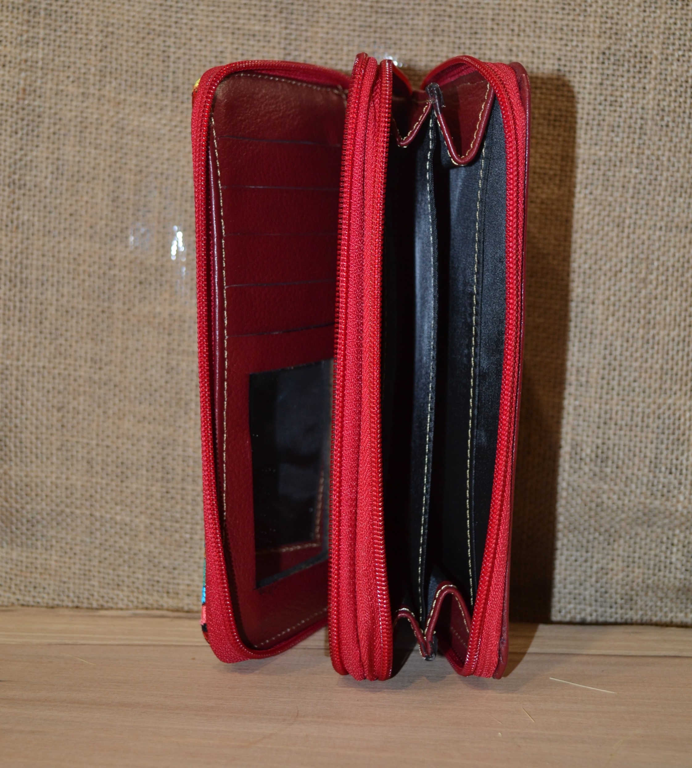 Duży pojemny dwukomorowy portfel . W jednej części znajdziesz kieszonki na karty sporo miejsca na banknoty i dokumenty . Jest przegroda na zdjęcie ukochanej osoby i jak we wszystkich naszych portfelach lusterko. Druga komora to miejsce na co tylko zechcesz . Kluczyki od auta lub dokumenty . Zmieści się tu też telefon sporych rozmiarów. W tylnej części wszyta została kieszonka na drobne monety . Wykonany ze 100 % skóry w czerwonym kolorze z kwiatowym haftem . Portfel ten został uszyty w Ekwadorskich Andach przez indiańskich kaletników którzy od pokoleń pielęgnują swoje rzemiosło.