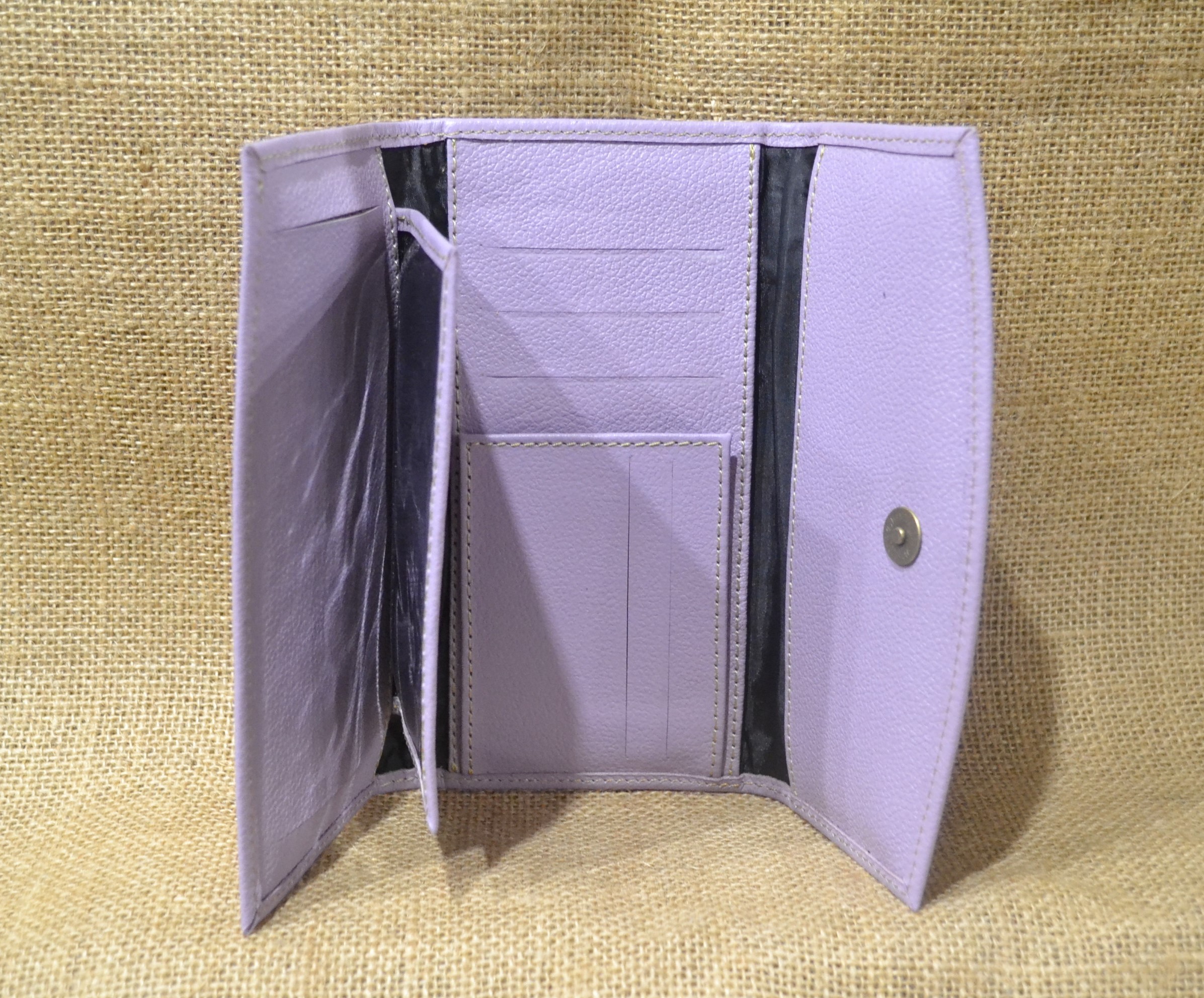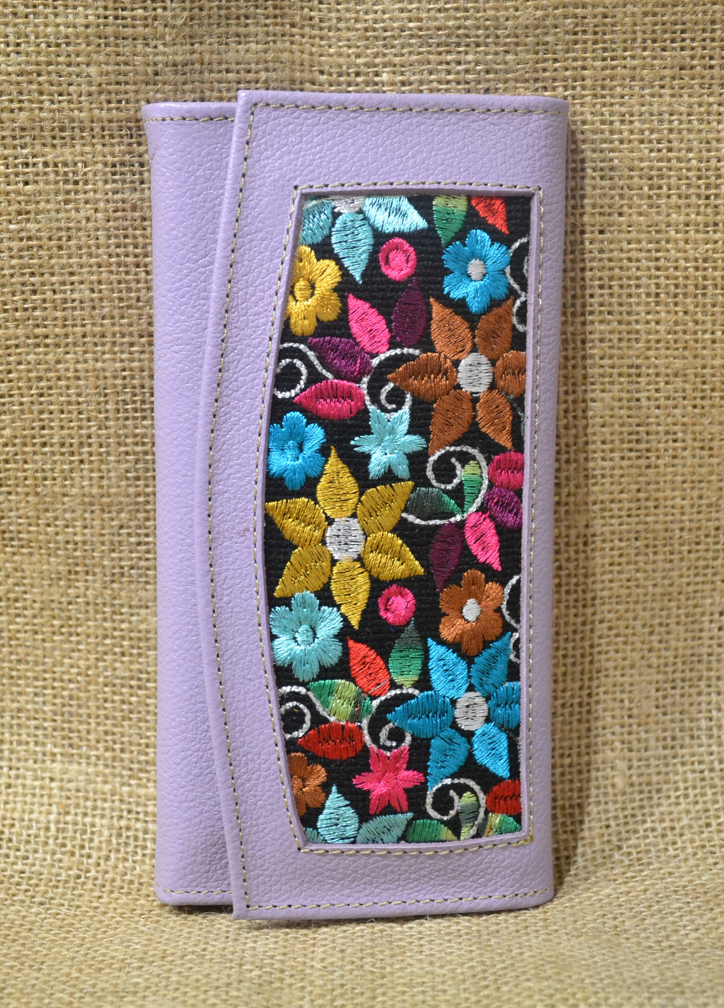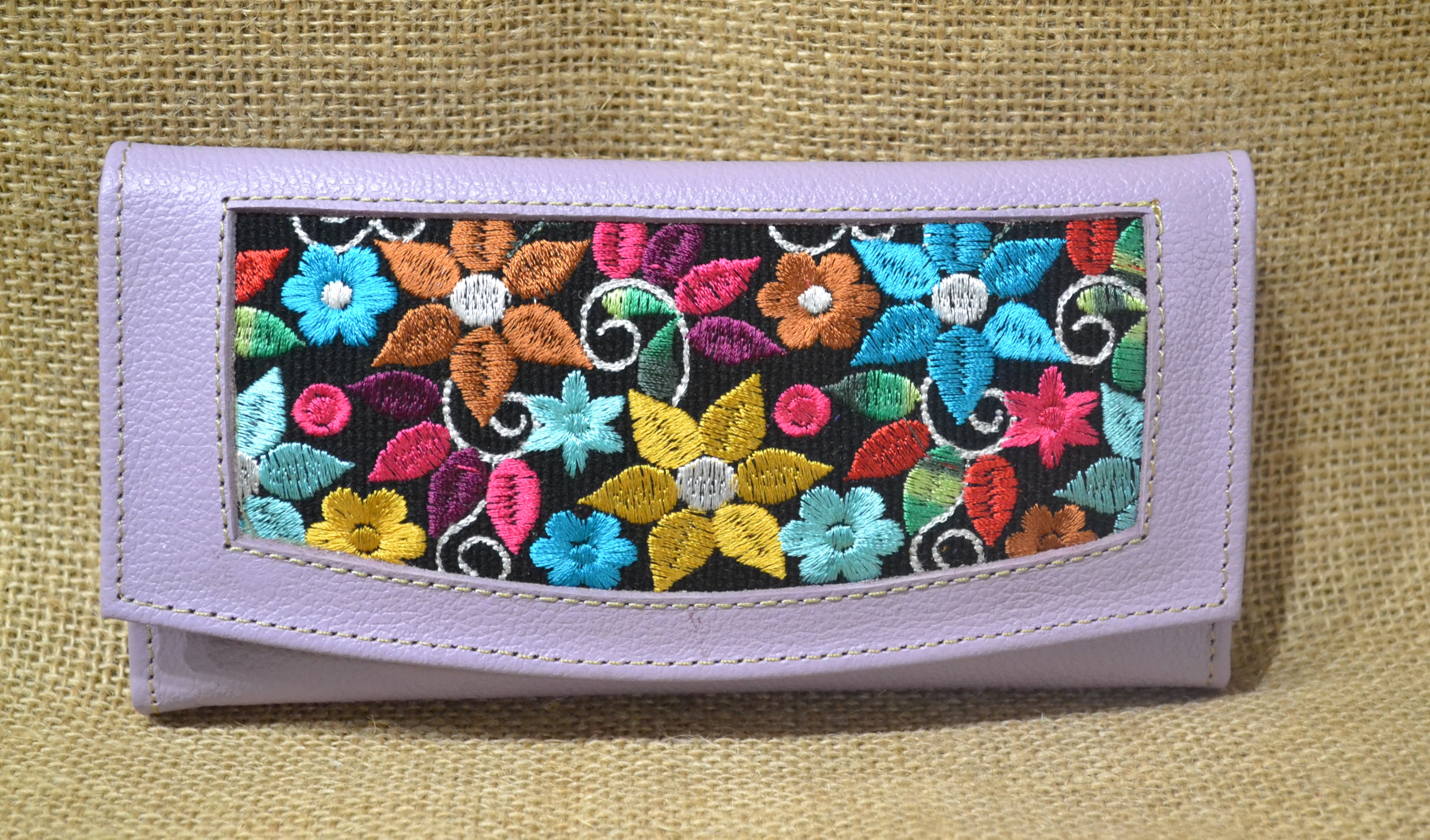 Jeśli szukasz dużego, zgrabnego , pojemnego portfela z portmonetką i lusterkiem to ten model jest dla ciebie . 100% naturalna  fioletowa  skóra pokryta kwiatowym haftem . Zaprojektowany i uszyty wysoko w Ekwadorskich Andach przez mały rzemieślniczy warsztat kaletniczy. Portfel posiada przegrodę na banknoty i na monety a także kieszonki na karty płatnicze.