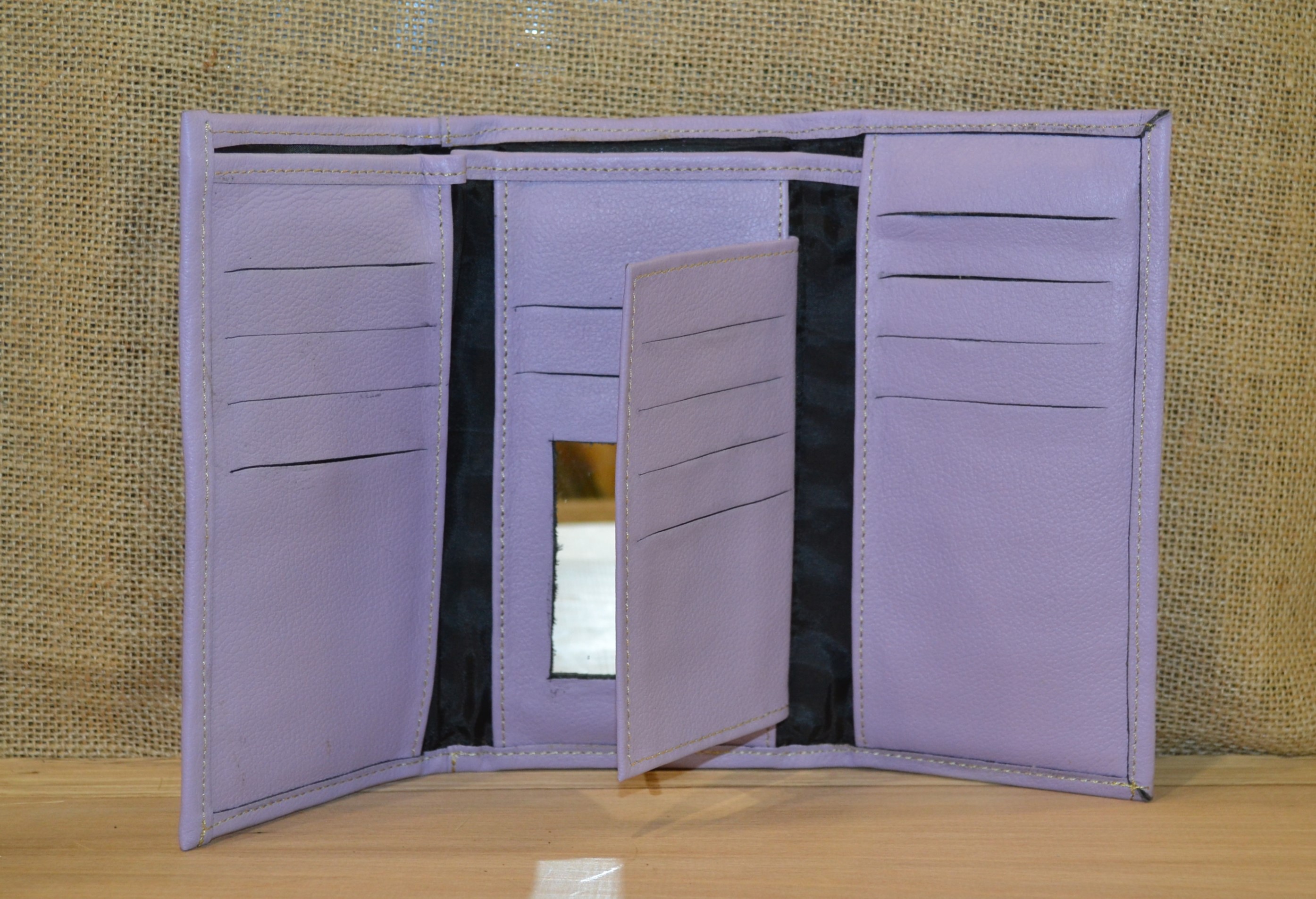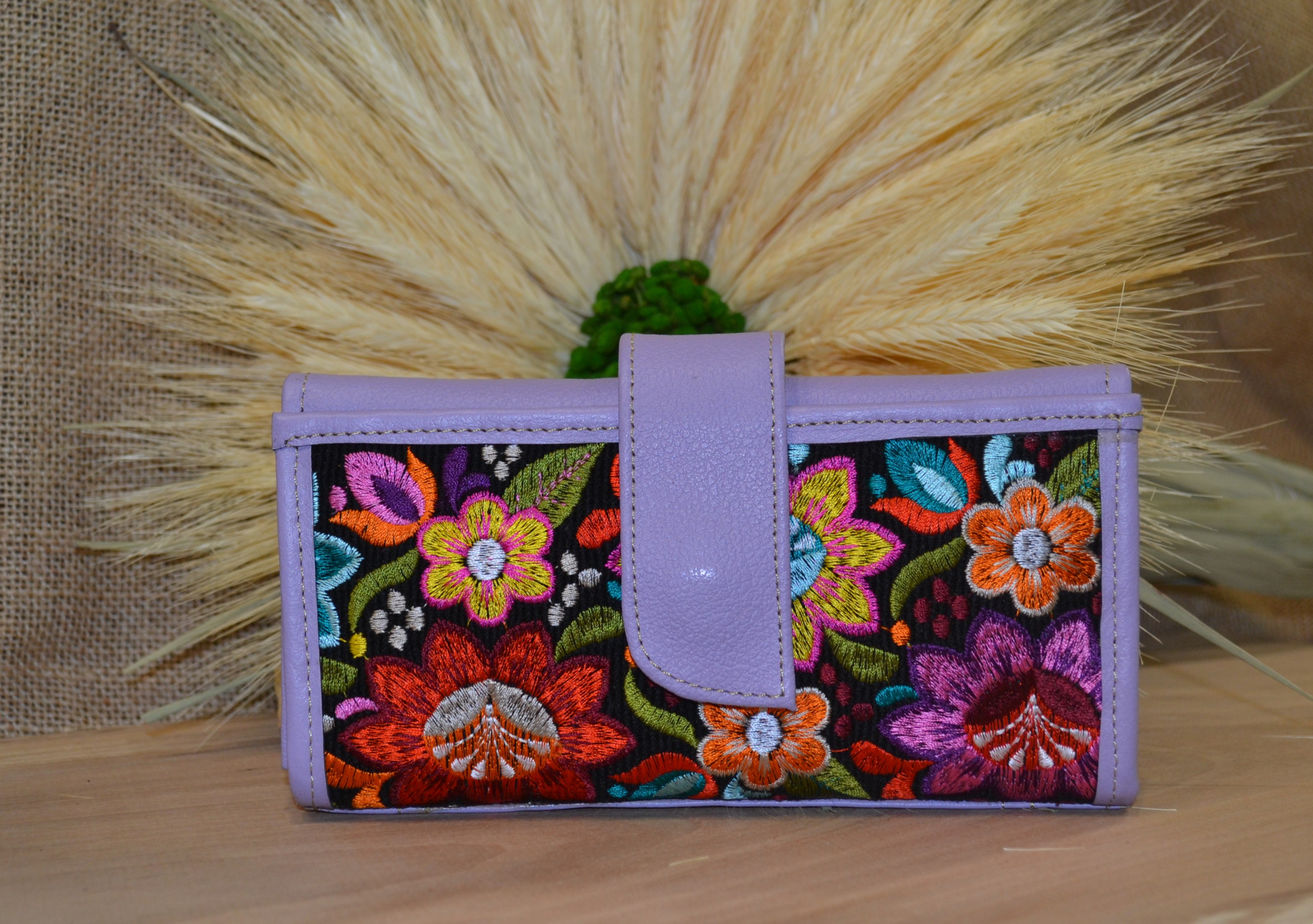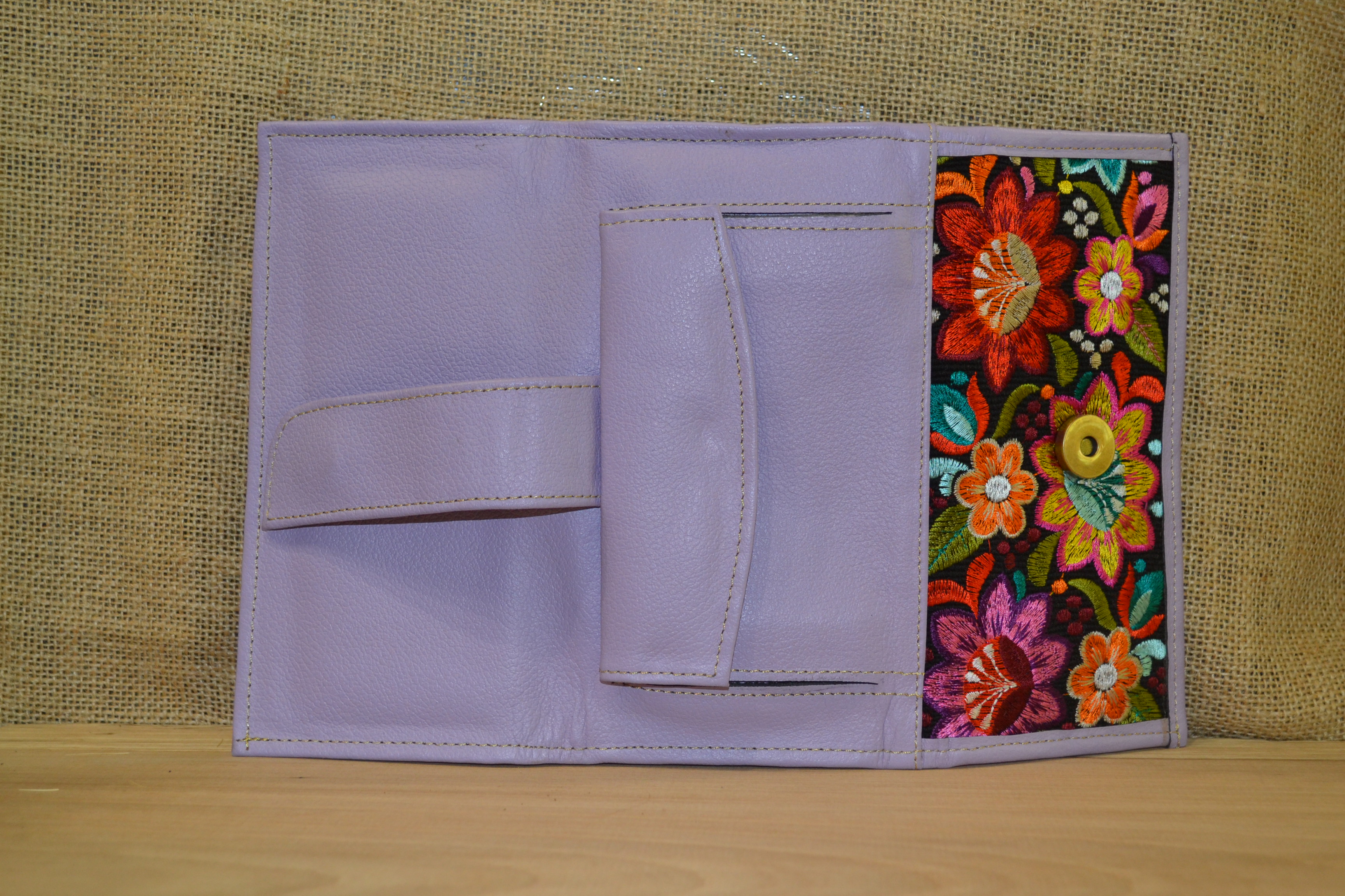 Jeśli szukasz dużego, zgrabnego , pojemnego portfela z portmonetką i lusterkiem to ten model jest dla ciebie . 100% naturalna fioletowa skóra pokryta kwiatowym haftem . Zaprojektowany i uszyty wysoko w Ekwadorskich Andach przez mały rzemieślniczy warsztat kaletniczy. Portfel posiada przegrodę na banknoty i na monety a także kieszonki na karty płatnicze.