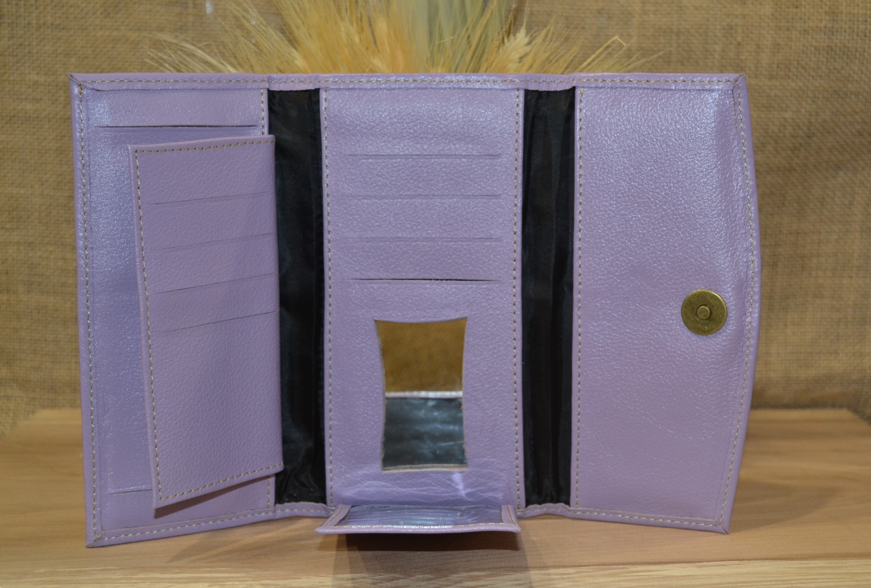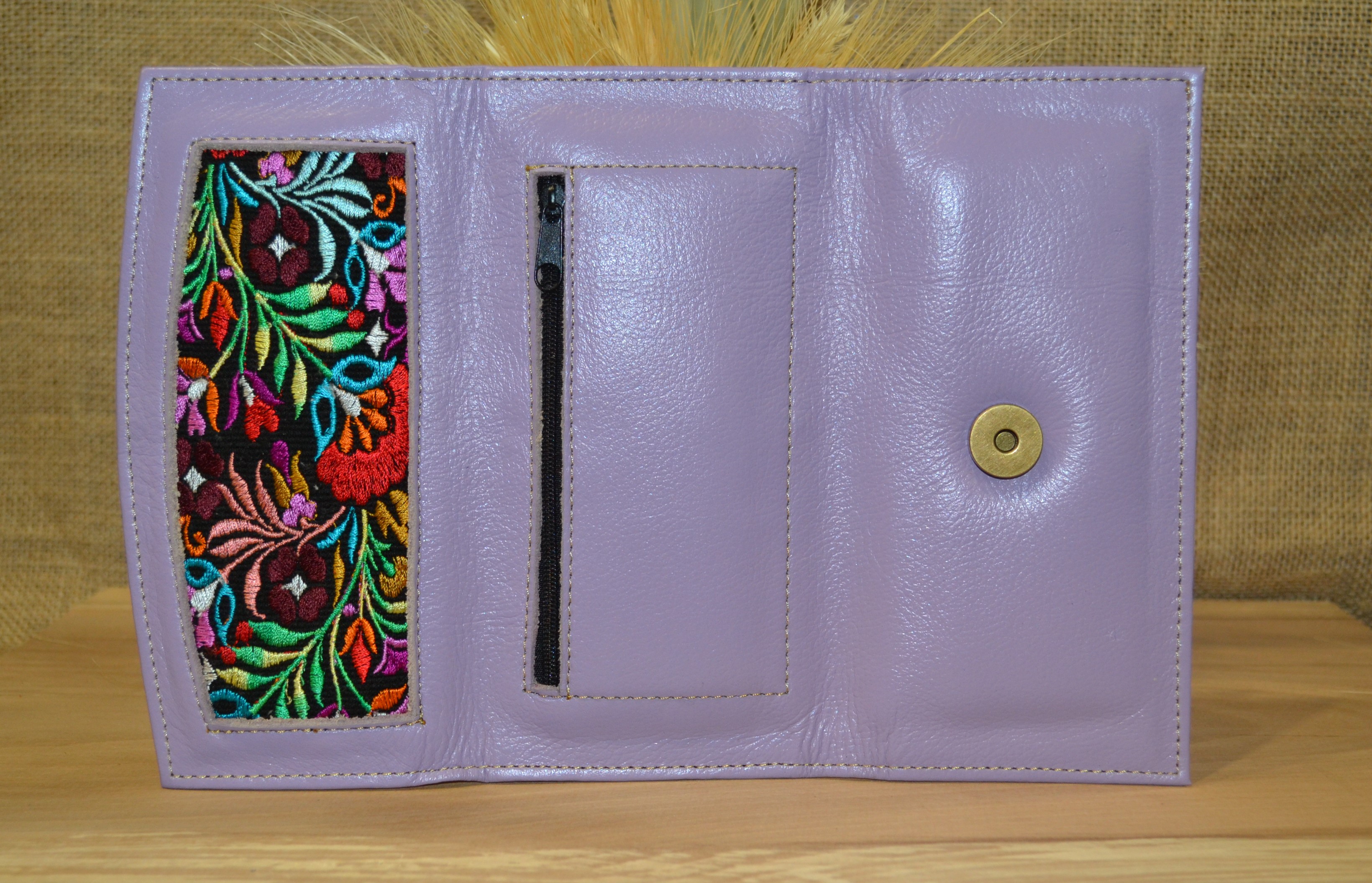 Jeśli szukasz dużego, zgrabnego , pojemnego portfela z portmonetką i lusterkiem to ten model jest dla ciebie . 100% naturalna  fioletowa  skóra pokryta kwiatowym haftem . Zaprojektowany i uszyty wysoko w Ekwadorskich Andach przez mały rzemieślniczy warsztat kaletniczy. Portfel posiada przegrodę na banknoty i na monety a także kieszonki na karty płatnicze.