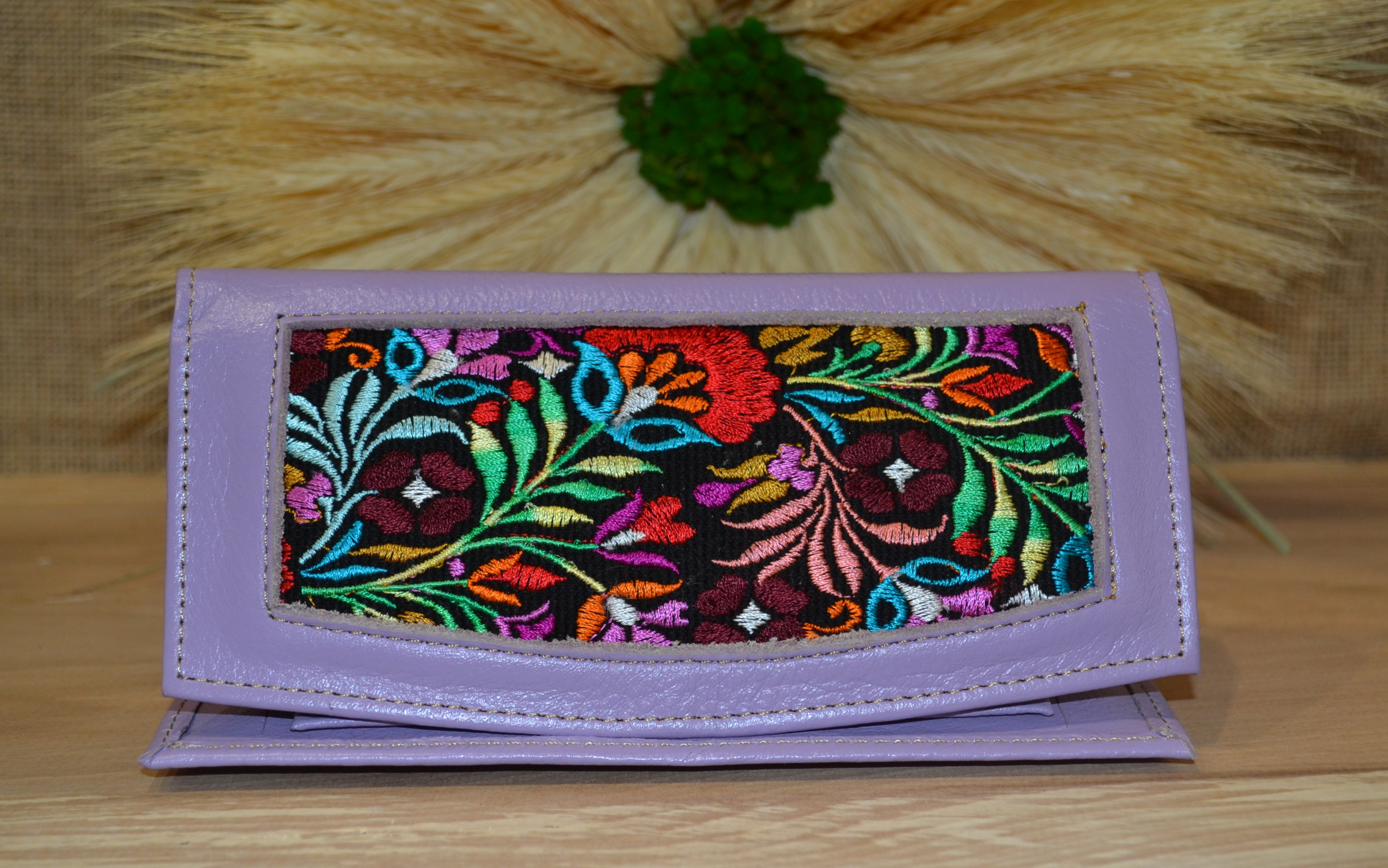 Strona główna » Wyroby ze skóry » Portfel duży skórzany fioletowy z kwiatowym kolorowym haftem .