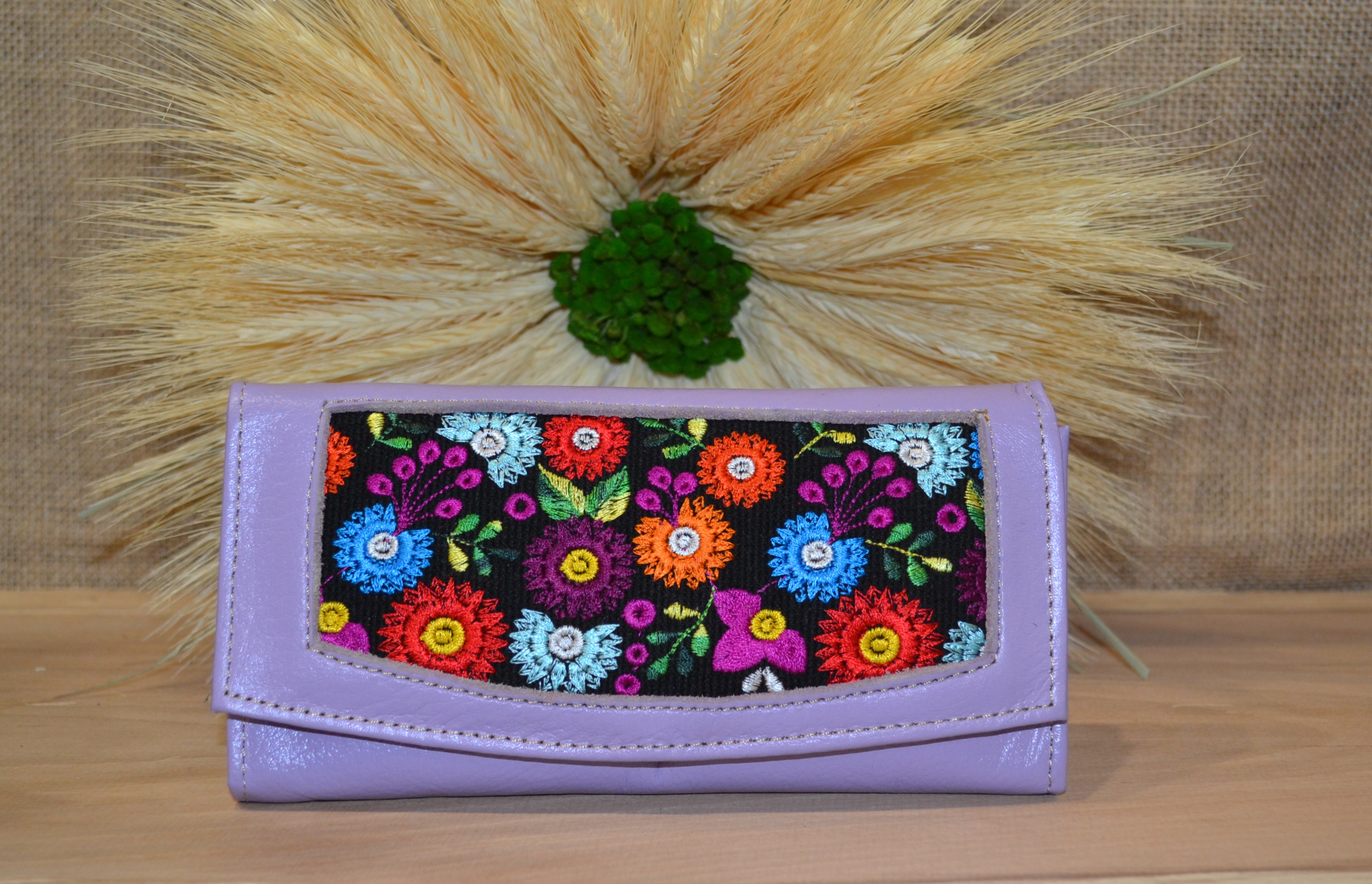 Strona główna » Wyroby ze skóry » Portfel duży skórzany fioletowy z kwiatowym kolorowym haftem .