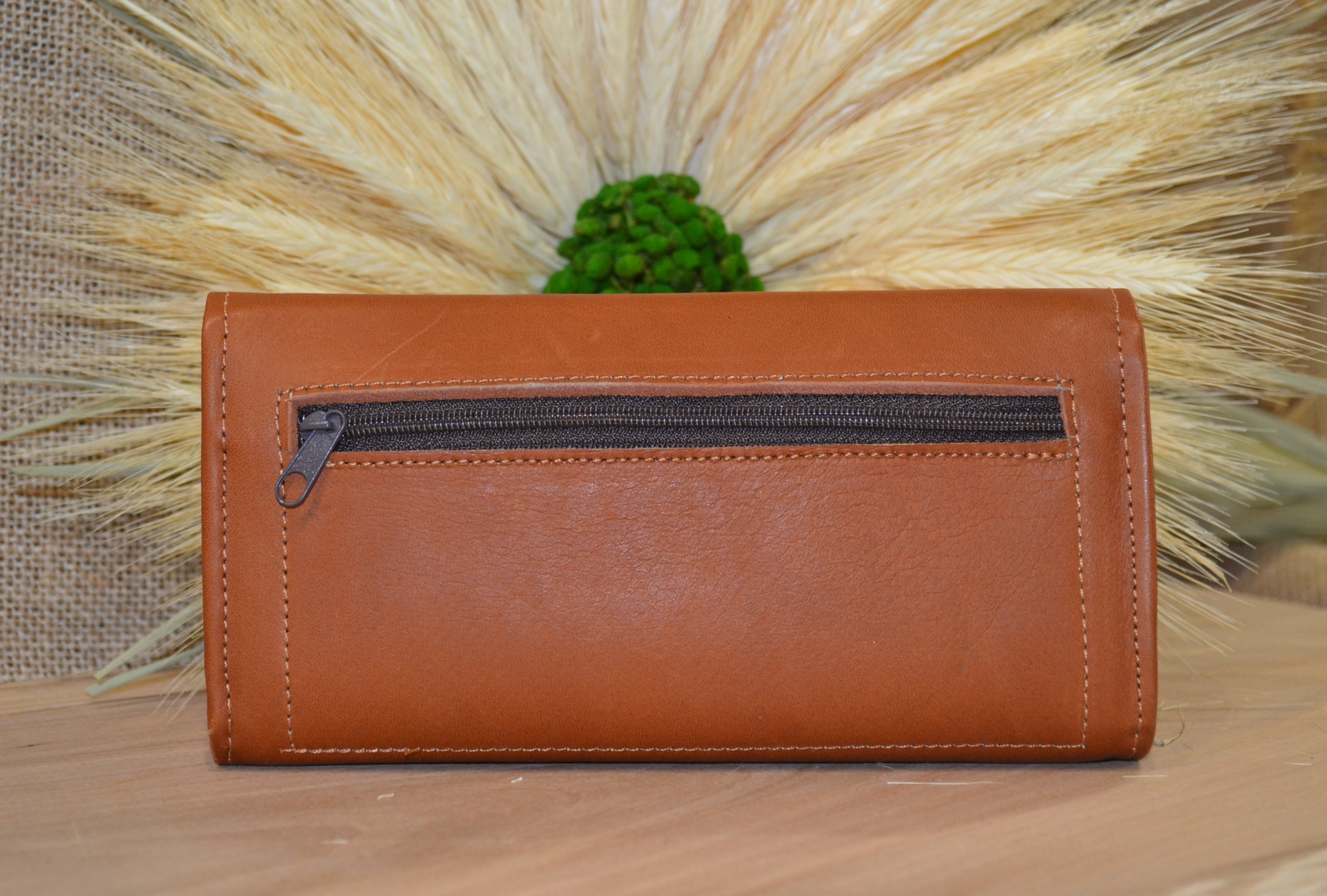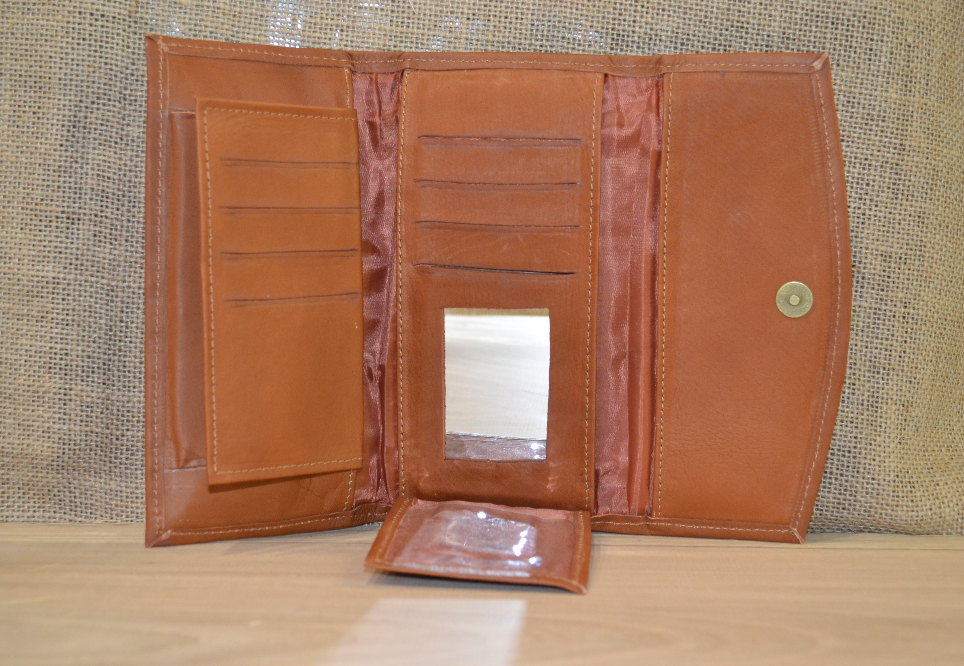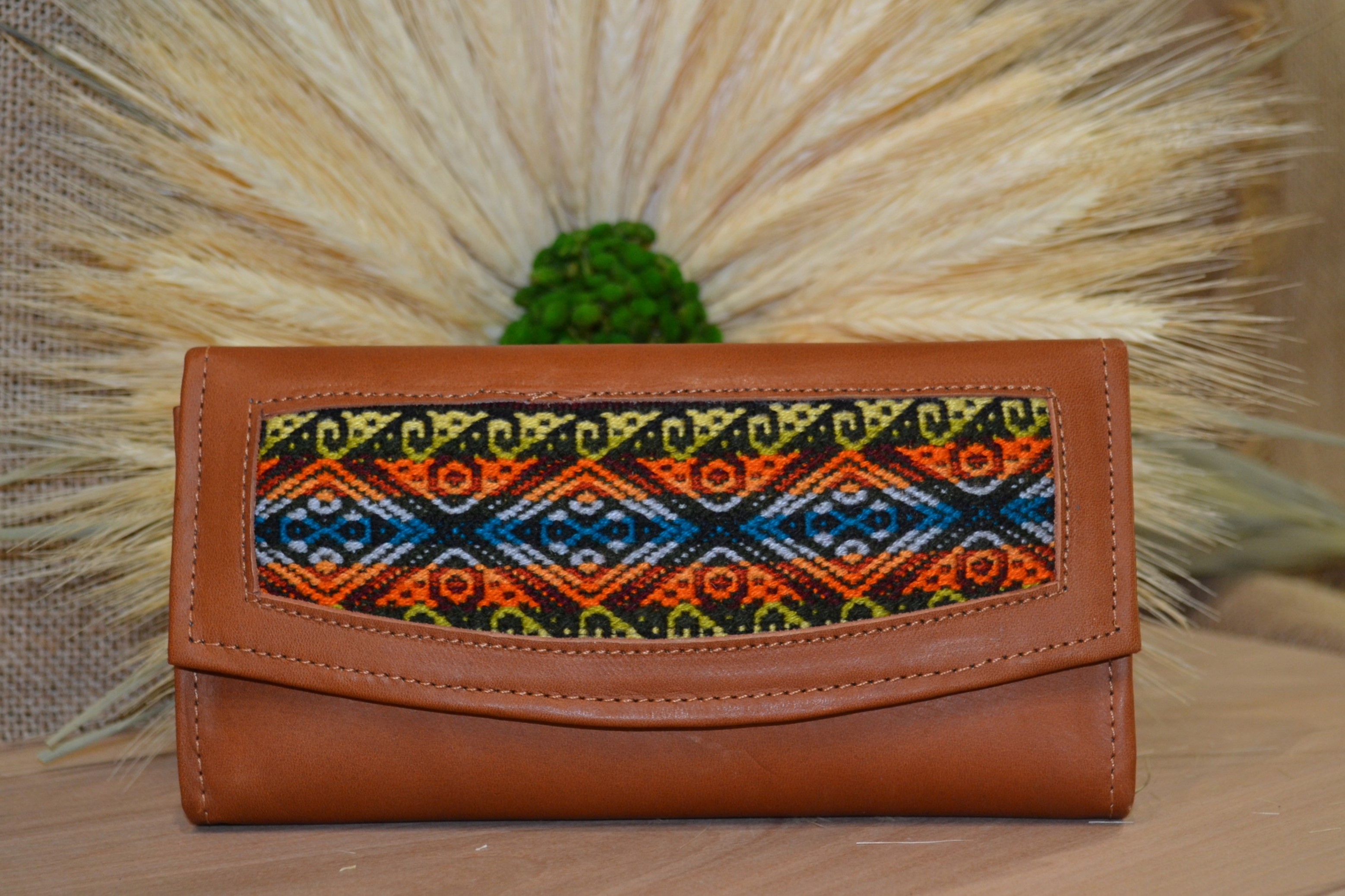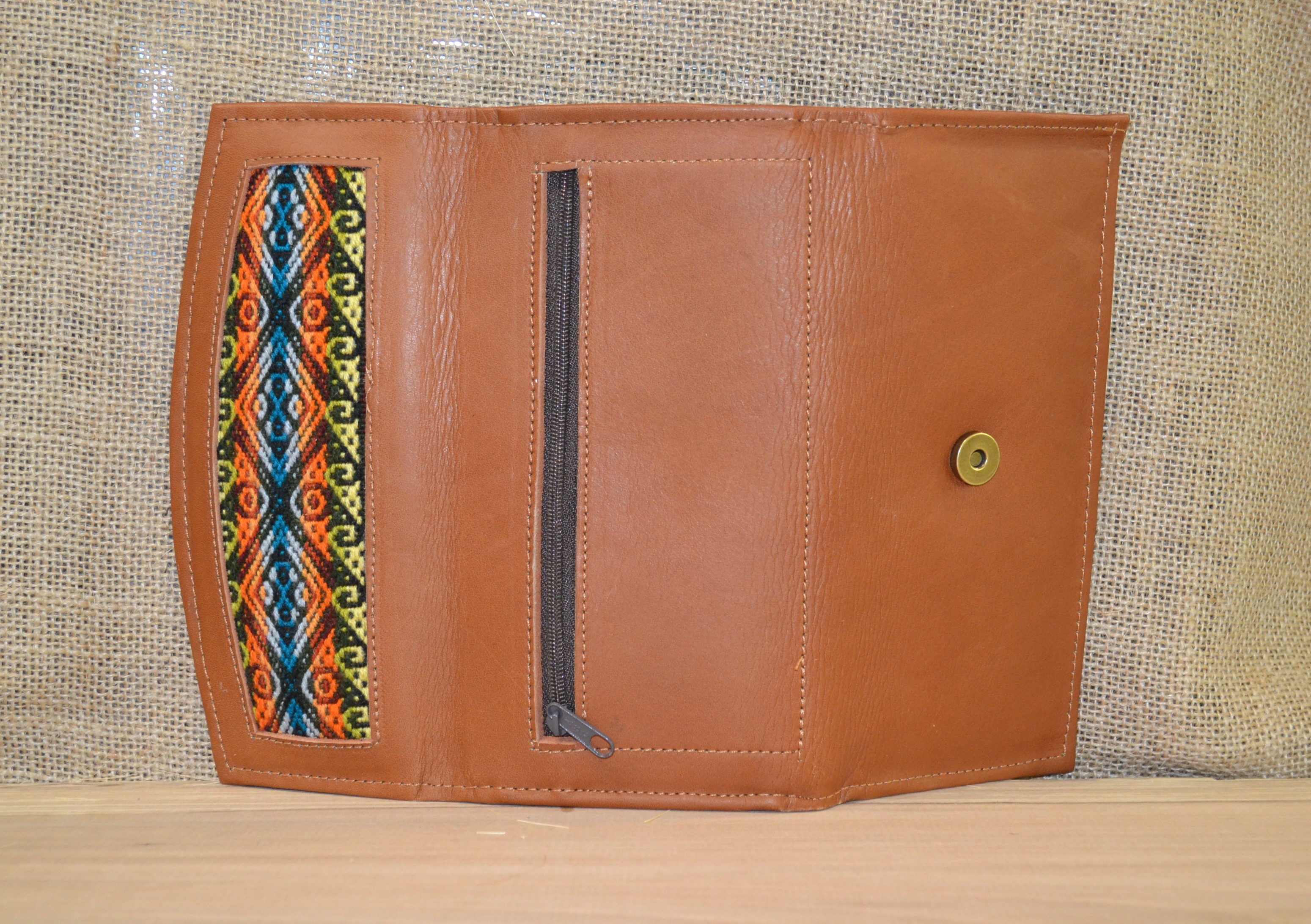 Jeśli szukasz dużego, zgrabnego , pojemnego portfela z portmonetką i lusterkiem to ten model jest dla ciebie . 100% naturalna jasno brązowa skóra pokryta etnicznym indiańskim haftem . Zaprojektowany i uszyty wysoko w Ekwadorskich Andach przez mały rzemieślniczy warsztat kaletniczy. Portfel posiada przegrodę na banknoty i na monety a także kieszonki na karty płatnicze.