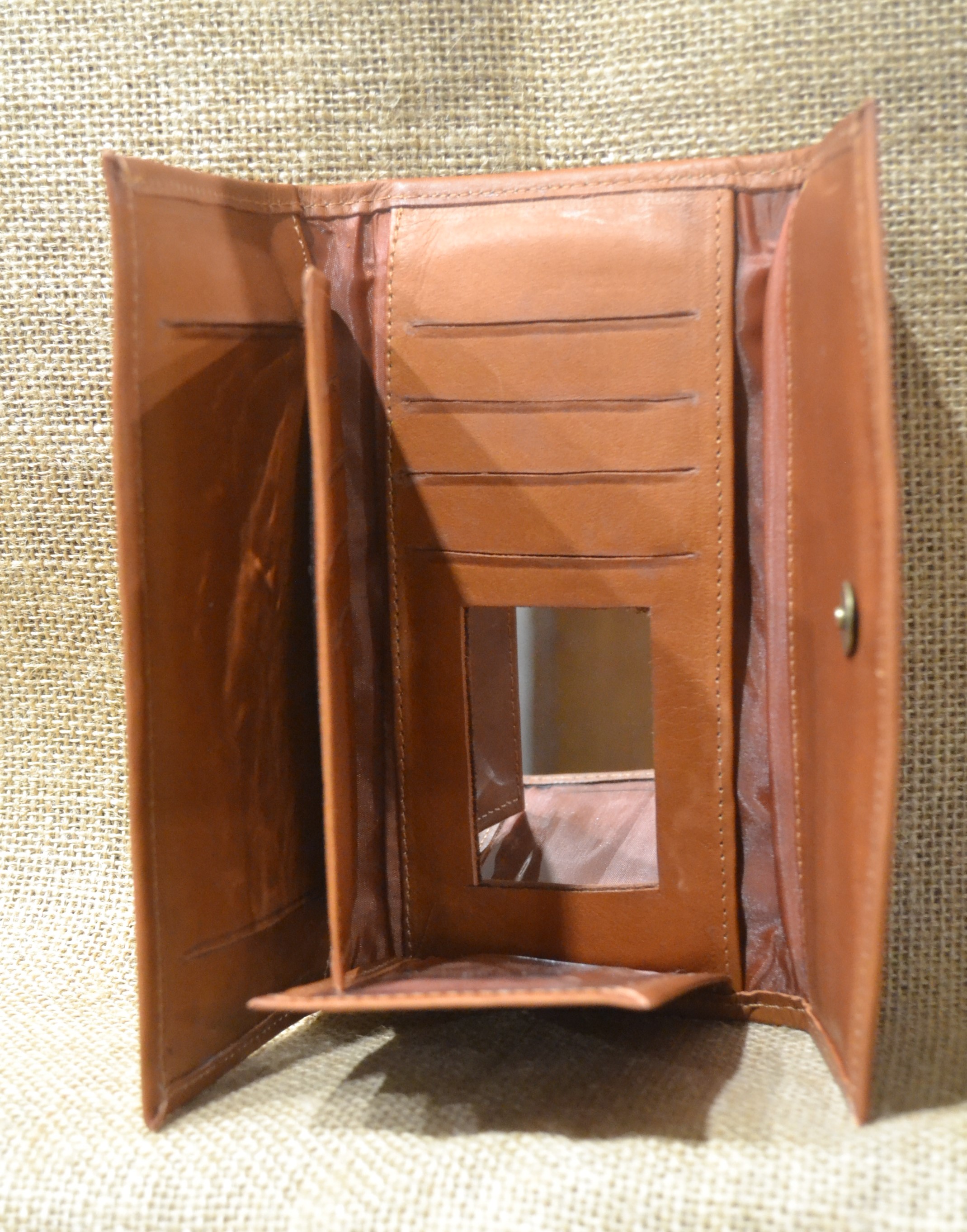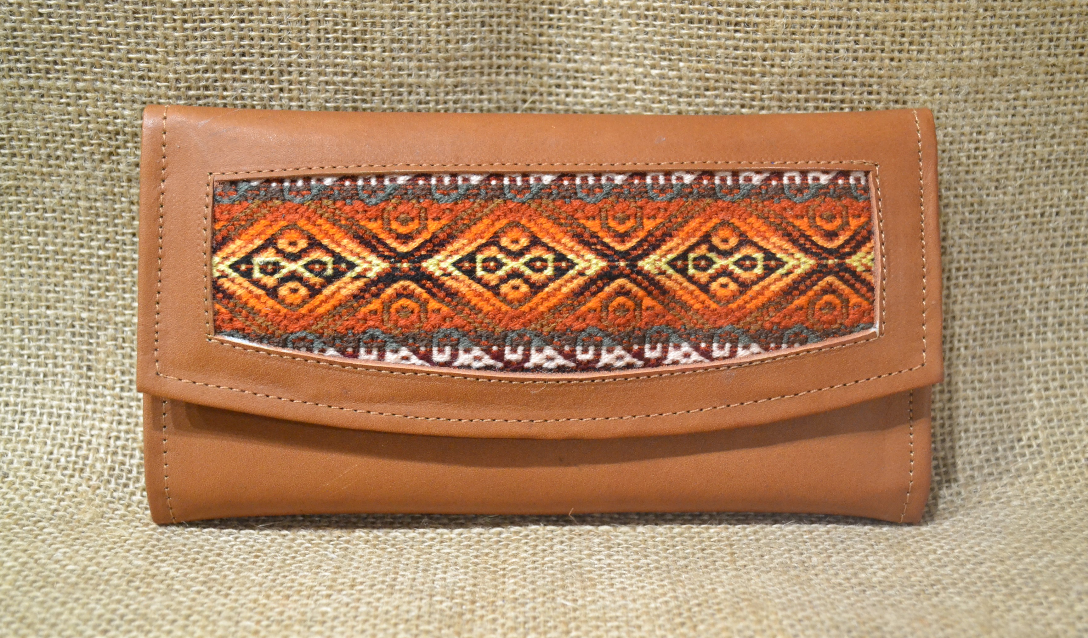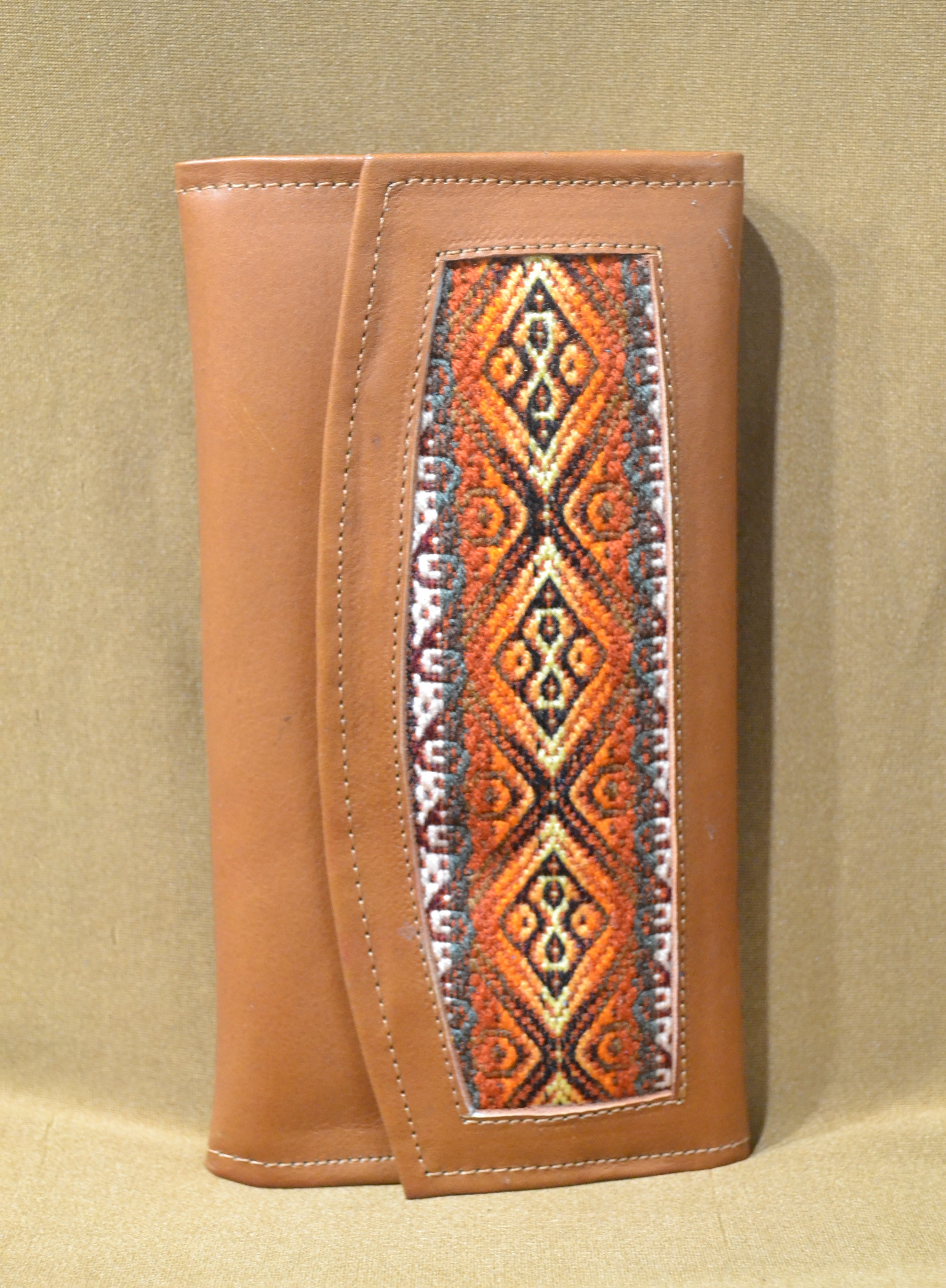 Jeśli szukasz dużego, zgrabnego , pojemnego portfela z portmonetką i lusterkiem to ten model jest dla ciebie . 100% naturalna jasnobrązowa skóra pokryta etnicznym brązowym haftem . Zaprojektowany i uszyty wysoko w Ekwadorskich Andach przez mały rzemieślniczy warsztat kaletniczy. Portfel posiada przegrodę na banknoty i na monety a także kieszonki na karty płatnicze.