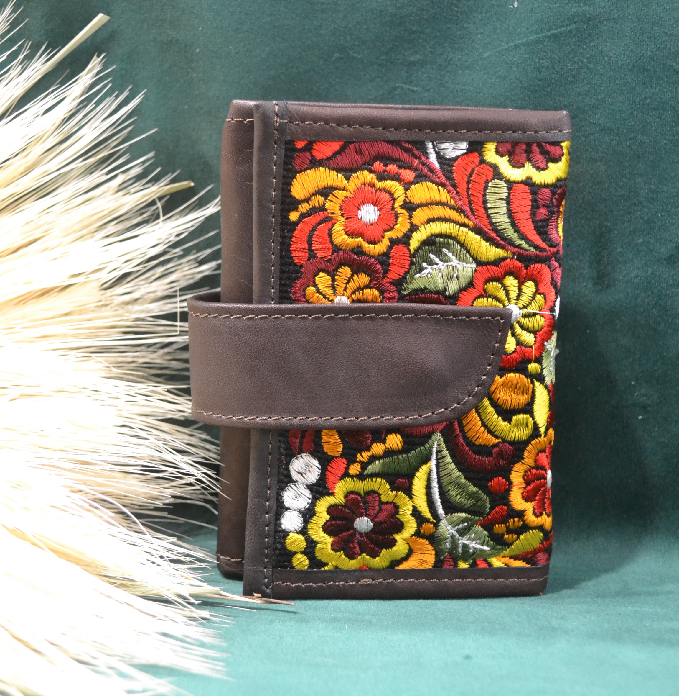 Strona główna » Wyroby ze skóry » Portfel mały skórzany ciemnobrązowy z kwiatowym kolorowym haftem .