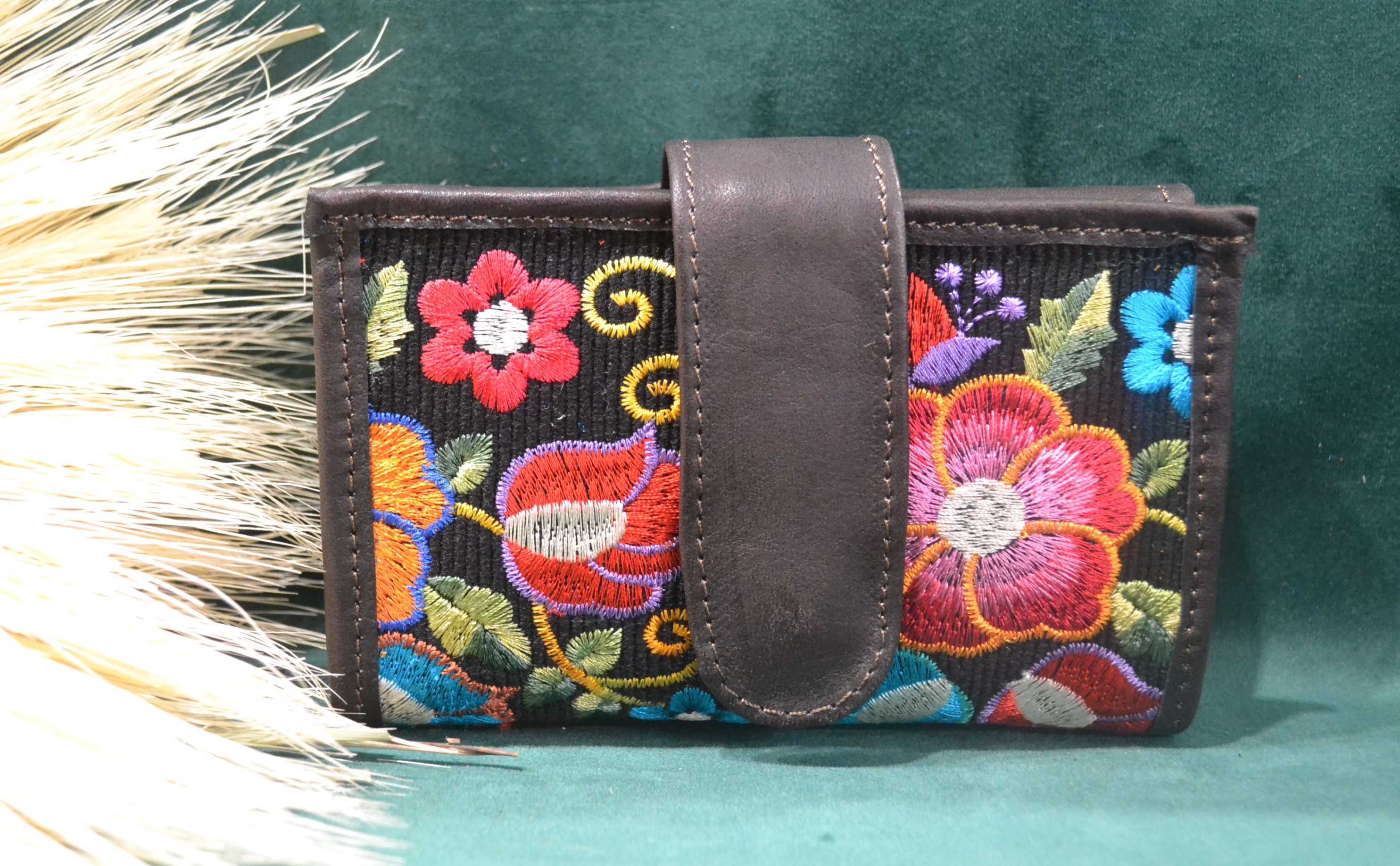 Jeśli szukasz małego zgrabnego portfela z portmonetką to ten model jest dla ciebie . 100 % naturalna ciemnobrązowa skóra pokryta kwiatowym kolorowym haftem . Zaprojektowany i uszyty wysoko w Ekwadorskich Andach przez mały rzemieślniczy warsztat kaletniczy. Portfel posiada przegrodę na banknoty i na monety a także kieszonki na karty płatnicze.