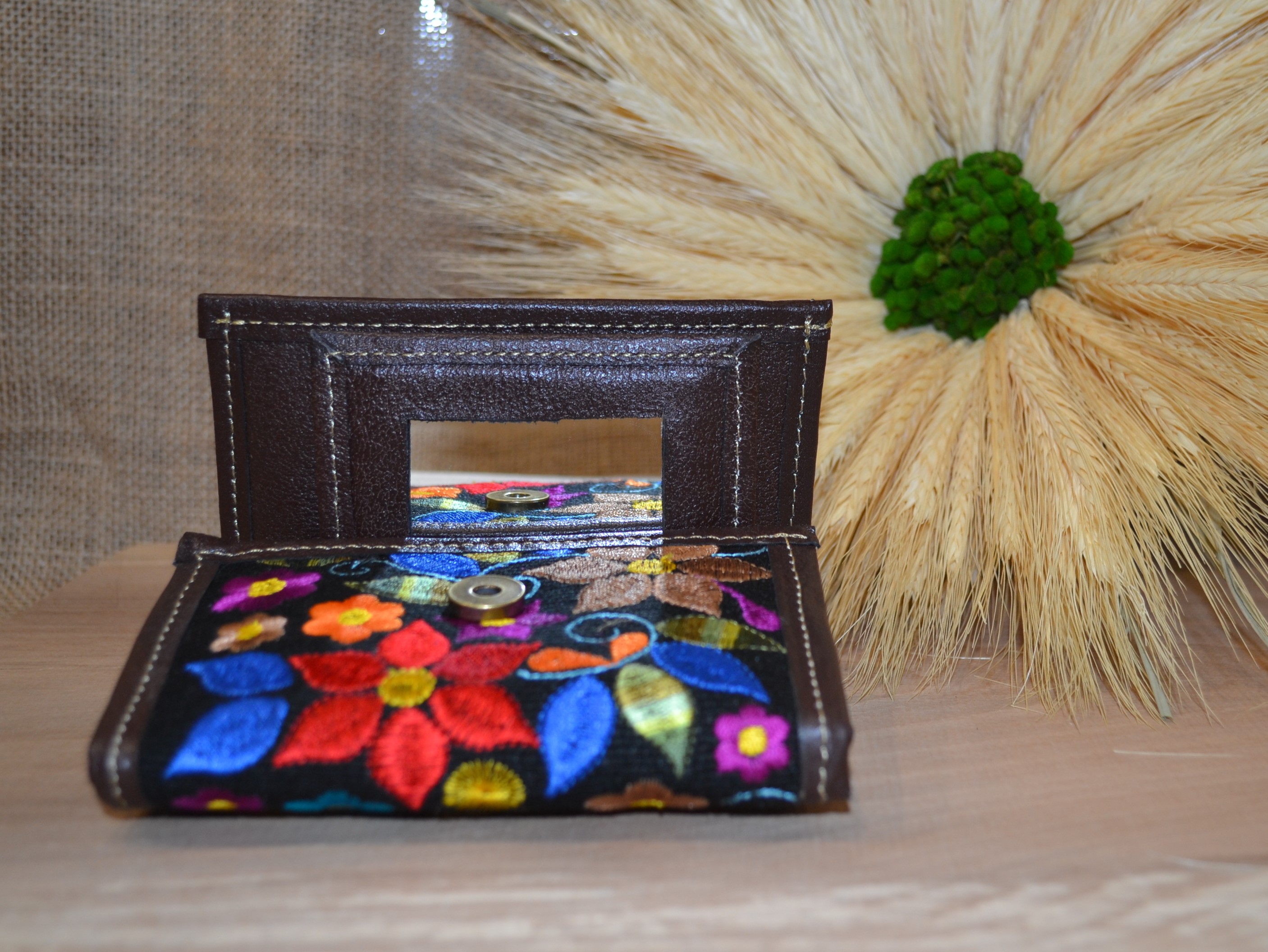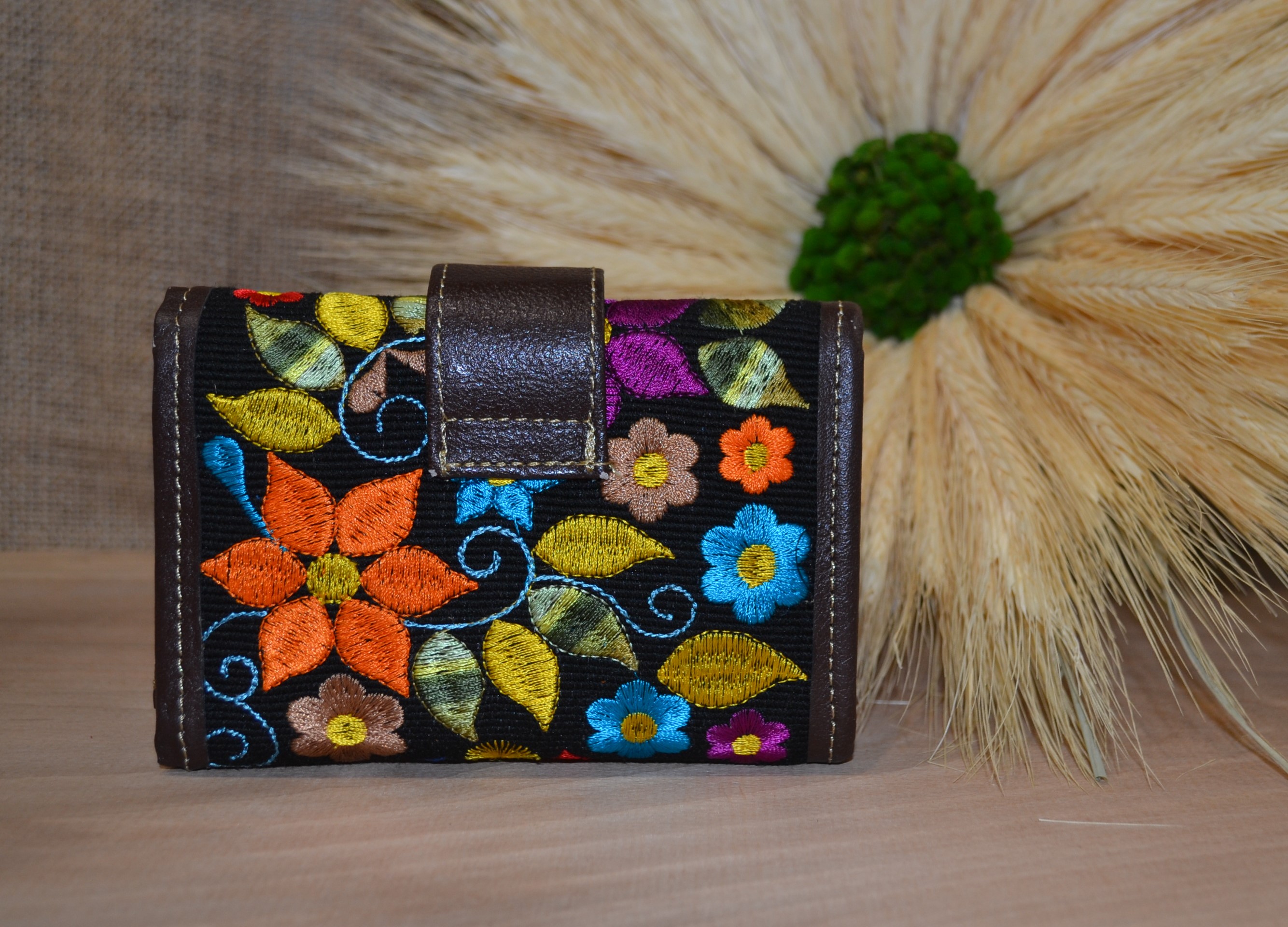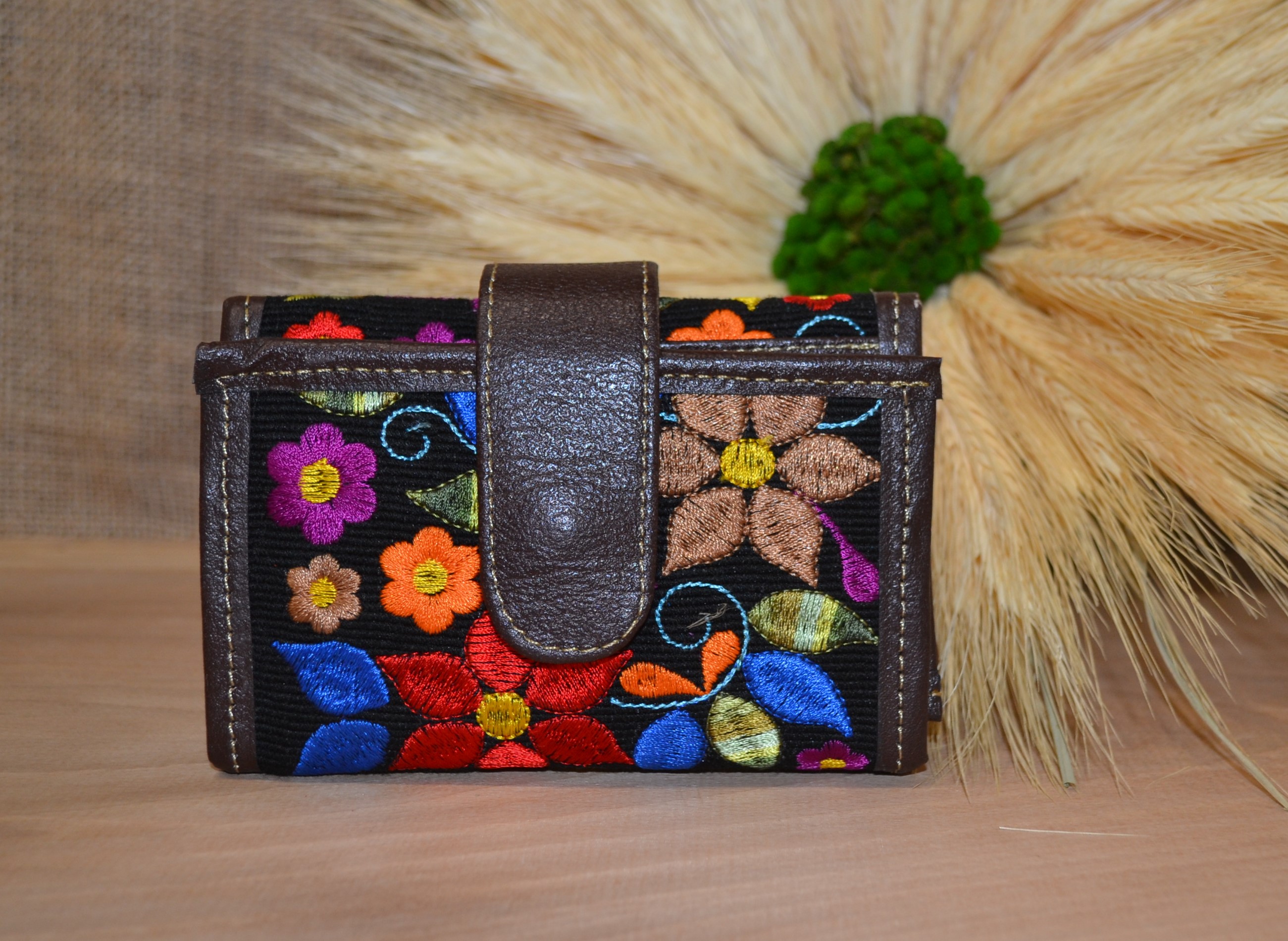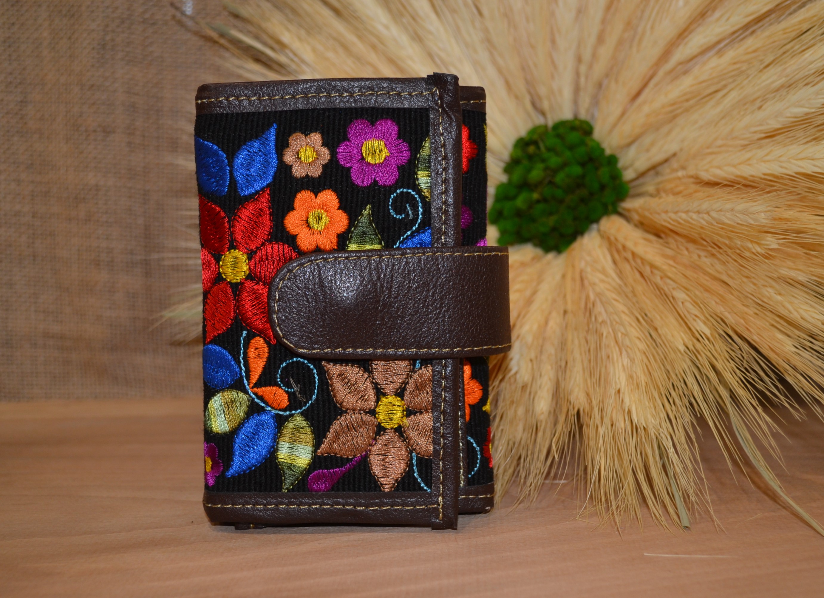 Jeśli szukasz małego zgrabnego portfela z portmonetką to ten model jest dla ciebie . 100 % naturalna ciemnobrązowa skóra pokryta kwiatowym kolorowym haftem . Zaprojektowany i uszyty wysoko w Ekwadorskich Andach przez mały rzemieślniczy warsztat kaletniczy. Portfel posiada przegrodę na banknoty i na monety a także kieszonki na karty płatnicze.